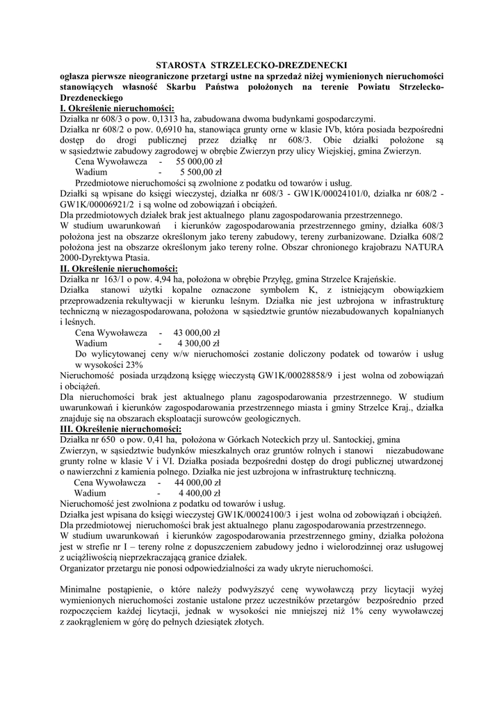 STAROSTA STRZELECKO-DREZDENECKI ogłasza pierwsze nieograniczone przetargi ustne na sprzedaż niżej wymienionych nieruchomości stanowiących własność Skarbu Państwa położonych na terenie Powiatu StrzeleckoDrezdeneckiego I. Określenie nieruchomości: Działka nr 608/3 o pow. 0,1313 ha, zabudowana dwoma budynkami gospodarczymi. Działka nr 608/2 o pow. 0,6910 ha, stanowiąca grunty orne w klasie IVb, która posiada bezpośredni dostęp do drogi publicznej przez działkę nr 608/3. Obie działki położone są w sąsiedztwie zabudowy zagrodowej w obrębie Zwierzyn przy ulicy Wiejskiej, gmina Zwierzyn. Cena Wywoławcza - 55 000,00 zł Wadium 5 500,00 zł Przedmiotowe nieruchomości są zwolnione z podatku od towarów i usług. Działki są wpisane do księgi wieczystej, działka nr 608/3 - GW1K/00024101/0, działka nr 608/2 GW1K/00006921/2 i są wolne od zobowiązań i obciążeń. Dla przedmiotowych działek brak jest aktualnego planu zagospodarowania przestrzennego. W studium uwarunkowań i kierunków zagospodarowania przestrzennego gminy, działka 608/3 położona jest na obszarze określonym jako tereny zabudowy, tereny zurbanizowane. Działka 608/2 położona jest na obszarze określonym jako tereny rolne. Obszar chronionego krajobrazu NATURA 2000-Dyrektywa Ptasia. II. Określenie nieruchomości: Działka nr 163/1 o pow. 4,94 ha, położona w obrębie Przyłęg, gmina Strzelce Krajeńskie. Działka stanowi użytki kopalne oznaczone symbolem K, z istniejącym obowiązkiem przeprowadzenia rekultywacji w kierunku leśnym. Działka nie jest uzbrojona w infrastrukturę techniczną w niezagospodarowana, położona w sąsiedztwie gruntów niezabudowanych kopalnianych i leśnych. Cena Wywoławcza - 43 000,00 zł Wadium 4 300,00 zł Do wylicytowanej ceny w/w nieruchomości zostanie doliczony podatek od towarów i usług w wysokości 23% Nieruchomość posiada urządzoną księgę wieczystą GW1K/00028858/9 i jest wolna od zobowiązań i obciążeń. Dla nieruchomości brak jest aktualnego planu zagospodarowania przestrzennego. W studium uwarunkowań i kierunków zagospodarowania przestrzennego miasta i gminy Strzelce Kraj., działka znajduje się na obszarach eksploatacji surowców geologicznych. III. Określenie nieruchomości: Działka nr 650 o pow. 0,41 ha, położona w Górkach Noteckich przy ul. Santockiej, gmina Zwierzyn, w sąsiedztwie budynków mieszkalnych oraz gruntów rolnych i stanowi niezabudowane grunty rolne w klasie V i VI. Działka posiada bezpośredni dostęp do drogi publicznej utwardzonej o nawierzchni z kamienia polnego. Działka nie jest uzbrojona w infrastrukturę techniczną. Cena Wywoławcza - 44 000,00 zł Wadium 4 400,00 zł Nieruchomość jest zwolniona z podatku od towarów i usług. Działka jest wpisana do księgi wieczystej GW1K/00024100/3 i jest wolna od zobowiązań i obciążeń. Dla przedmiotowej nieruchomości brak jest aktualnego planu zagospodarowania przestrzennego. W studium uwarunkowań i kierunków zagospodarowania przestrzennego gminy, działka położona jest w strefie nr I – tereny rolne z dopuszczeniem zabudowy jedno i wielorodzinnej oraz usługowej z uciążliwością nieprzekraczającą granice działek. Organizator przetargu nie ponosi odpowiedzialności za wady ukryte nieruchomości. Minimalne postąpienie, o które należy podwyższyć cenę wywoławczą przy licytacji wyżej wymienionych nieruchomości zostanie ustalone przez uczestników przetargów bezpośrednio przed rozpoczęciem każdej licytacji, jednak w wysokości nie mniejszej niż 1% ceny wywoławczej z zaokrągleniem w górę do pełnych dziesiątek złotych. Przetargi odbędą się w dniu 23 stycznia 2014r. od godz. 1000, w kolejności jw. w siedzibie Starostwa Powiatowego w Strzelcach Kraj. ul. Ks. St. Wyszyńskiego 7, sala nr 115 - I piętro. W przetargach mogą brać udział osoby fizyczne oraz osoby prawne (cudzoziemcy na zasadach określonych w ustawie o nabywaniu nieruchomości przez cudzoziemców – tj. (Dz.U.2004.167.1758), którzy wpłacą wadium w określonej wysokości, z zaznaczeniem na jaki cel, do dnia 20 stycznia 2014r. na konto Starostwa Powiatowego w Strzelcach Kraj. Nr 73 2030 0045 1110 0000 0231 6800. Wpłacone wadium winno znajdować się na wymienionym koncie najpóźniej do dnia 20 stycznia 2014r. Uczestnicy przetargu zobowiązani są przed otwarciem przetargu do przedłożenia komisji przetargowej dowodu wniesienia wadium, dowodu tożsamości, oraz w odniesieniu do osób prawnych wypisu z KRS – oryginału i kopii, a w przypadku osób ich reprezentujących – pełnomocnictwo do udziału w przetargu potwierdzone notarialnie. Małżonkowie biorą razem udział w licytacji. W przypadku brania udziału w licytacji przez jednego z małżonków posiadających ustrój wspólności majątkowej wymagana jest zgoda drugiego współmałżonka na udział w przetargu na kupno określonej nieruchomości - w formie aktu notarialnego. Wadium winno być wpłacone na każdą nieruchomość osobno. Wadium wpłacone przez osobę, która przetarg wygra, zostanie zaliczone na poczet ceny nabycia nieruchomości, pozostałym uczestnikom będą zwrócone w ciągu trzech dni od dnia zamknięcia przetargu. Nabywcy zostaną powiadomieni w ciągu 21 dni od zamknięcia przetargu, o terminie zawarcia aktu notarialnego (termin ten nie może być krótszy niż 7 dni od dnia doręczenia). Warunkiem nabycia nieruchomości, obok wygrania przetargu jest wpłacenie całej ceny nieruchomości uzyskanej w przetargu wraz z należnym podatkiem VAT najpóźniej do dnia zawarcia umowy notarialnej, na wskazane w protokole konto bankowe. Koszty sporządzenia umowy notarialnej oraz opłaty sądowe ponosi nabywca. Wadium ulega przepadkowi w razie uchylenia się osoby, która przetarg wygra od zawarcia umowy notarialnej. Sprzedający zastrzega sobie prawo unieważnienia przetargu w uzasadnionych przypadkach. Wszelkich informacji o nieruchomości można uzyskać w siedzibie Starostwa Powiatoweg