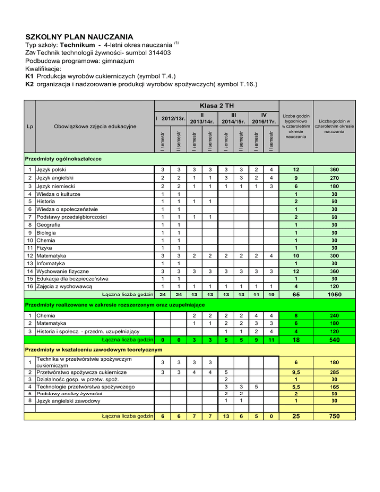SZKOLNY PLAN NAUCZANIA /1/ Typ szkoły: Technikum - 4-letni okres nauczania Zawód Technik technologii żywności- sumbol 314403 Podbudowa programowa: gimnazjum Kwalifikacje: K1 Produkcja wyrobów cukierniczych (symbol T.4.) K2 organizacja i nadzorowanie produkcji wyrobów spożywczych( symbol T.16.) Klasa 2 TH II semestr IV 2016/17r. I semestr II semestr III 2014/15r. I semestr II semestr II semestr Obowiązkowe zajęcia edukacyjne I semestr Lp II 2013/14r. I semestr I 2012/13r. Liczba godzin tygodniowo w czteroletnim okresie nauczania Liczba godzin w czteroletnim okresie nauczania Przedmioty ogólnokształcące 1 Język polski 3 3 3 3 3 3 2 4 12 360 2 Język angielski 2 2 1 1 3 3 2 4 9 270 3 Język niemiecki 2 2 1 1 1 1 1 3 6 180 4 Wiedza o kulturze 1 1 1 30 5 Historia 1 1 2 60 6 Wiedza o społeczeństwie 1 1 1 30 7 Podstawy przedsiębiorczości 1 1 2 60 30 1 1 1 1 8 Geografia 1 1 1 9 Biologia 1 1 1 30 10 Chemia 1 1 1 30 11 Fizyka 1 1 1 30 10 300 12 Matematyka 3 3 13 Informatyka 1 1 14 Wychowanie fizyczne 15 Edukacja dla bezpieczeństwa 3 1 3 1 16 Zajęcia z wychowawcą Łączna liczba godzin 2 3 2 3 2 3 2 3 2 3 4 1 30 3 12 1 360 30 1 1 1 1 1 1 1 1 4 120 24 24 13 13 13 13 11 19 65 1950 2 1 2 2 2 2 4 3 4 3 8 240 6 180 1 1 2 4 4 120 5 5 9 11 18 540 6 180 9,5 1 5,5 2 1 285 30 165 60 30 25 750 Przedmioty realizowane w zakresie rozszerzonym oraz uzupełniające 1 Chemia 2 1 2 Matematyka 3 Historia i społecz. - przedm. uzupełniający Łączna liczba godzin 0 0 3 3 3 3 3 3 3 3 4 4 Przedmioty w kształceniu zawodowym teoretycznym 1 Technika w przetwórstwie spożywczym cukierniczym Przetwórstwo spożywcze cukiernicze Działalnośc gosp. w przetw. spoż. Technologie przetwórstwa spożywczego Podstawy analizy żywności 2 3 4 5 8 Język angielski zawodowy Łączna liczba godzin 6 6 7 7 5 2 3 2 1 3 2 1 5 13 6 5 0 Przedmioty w kształceniu zawodowym praktycznym Gospodarka magazynowa w zakładzie 1 przetwórstwa spożywczego Procesy produkcji wyrobów spożywczych 2 cukierniczych 3 3 8 8 7 3 Nadzór produkcji w zakł. przetw. spoż. 4 Analiza żywności 5 Praktyka zawodowa** 1,5 45 13 390 2 2 2 60 4 5 4,5 135 8 4 120 Łączna liczba godzin 3 3 8 16 7 6 7 0 25 750 Łączna liczba godzin kształcenia zawodowego 9 9 15 23 20 12 12 0 50 1500 33 33 31 39 38 30 32 30 133 3990 0,5 0,5 0,5 0,5 0,5 0,5 1,5 45 2 2 2 2 2 2 8 240 142,5 4275 Tygodniowy wymiar godzin obowiązkowych zajęć edukacyjnych 1 Wychowanie do życia w rodzinie 2 Religia/etyka Łączna tygodniowa liczba godzin w szkole 35,5 37,5 36,5 2 2 33,0 /1/ (do celów obliczeniowych przyjęto 30 tygodni w ciągu jednego roku szkolnego) *w szkolnym planie uwzględnia się również wymiar godzin zajęć określonych w par. 4 ust. 2 rozporządzenia w sprawie ramowych planów nauczania, t.j. m.in. religii lub etyki oraz wychowania do życia w rodzinie. **w przypadku praktyk realizowanych w wymiarze ponad 4 tygodnie Minimalny wymiar praktyk zawodowych tyg. godz. kl. I - zgodnie z podstawą programową 0 kl. II - zgodnie z podstawą programową 0 kl. III - zgodnie z podstawą programową 7 280 7 280 kl. IV - zgodnie z podstawą programową 0 Razem Egzamin potwierdzający pierwszą kwalifikację (K1) odbywa się pod koniec I semestru klasy III Egzamin potwierdzający drugą kwalifikację (K2) odbywa się pod koniec I semestru klasy IV