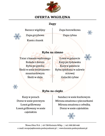OFERTA WIGILIJNA Zupy Barszcz wigilijny Zupa borowikowa Zupa grzybowa Zupa rybna Krem z kurek Ryba na zimno Tatar z łososia wędzonego Rolada z dorsza Ryba po grecku Śledź w sosie śmietanowo musztardowym Śledź w oleju Łosoś w galarecie Karp po żydowsku Karp w galarecie Ryba opiekana w zalewie octowej Galaciki rybne Ryba na ciepło Karp w porach Dorsz w sosie porowym Łosoś grillowany Łosoś grillowany w sosie cajeńskim Sandacz w sosie kurkowym Miruna smażona z pieczarkami Miruna smażona z cebulką Dorsz w sosie cajeńskim Nowa Obra 75A | 63-720 Koźmin Wlkp. | tel. 500 283 448 e-mail: [email protected] | www.kozmin.podszyszkami.pl Dodatki Sos grzybowy Sos kurkowy Kapusta z grzybami Pierogi z kapustą i grzybami Sałatka włoska z makaronem Sałatka jarzynowa Sałatka estońska z łososiem wędzonym Sos borowikowy Pierogi z kapustą i grzybami Krokiet z kapusta i grzybami Makiełki (kluski z makiem) Łazanki z kapustą i pieczarkami Uszka z kapustą i grzybami Krokiet z pieczarkami i mozzarellą Pieczywo świąteczne Strucla makowa Makowiec z kruszonką Sernik Piernik Ciasto z galaretką Na specjalne życzenie przygotujemy również dania garmażeryjne na półmiskach. Zamówienia można składać do 19 grudnia 2016 roku. Zamówione potrawy będą do odbioru 23 i 24 grudnia 2015r. do godz. 13:00! Nowa Obra 75A | 63-720 Koźmin Wlkp. | tel. 500 283 448 e-mail: [email protected] | www.kozmin.podszyszkami.pl