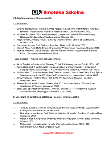 I. Literatura na temat kinematografii: - podstawowa: ● Ewelina Nurczyńska-Fidelska, Konrad Klejsa, Tomasz Kłys, Piotr Sitarski: Kino bez tajemnic. Wydawnictwo Piotra Marciszuka STENTOR, Warszawa 2009. ● Mirosław Przylipiak: Kino stylu zerowego: z zagadnień estetyki filmu fabularnego. Gdańskie Wydawnictwo Psychologiczne, Gdańsk 1994. ● Alicja Helman, Andrzej Pitrus: Podstawy wiedzy o filmie. Słowo/ obraz terytoria, Gdańsk 2008. ● Encyklopedia kina. Red. Tadeusz Lubelski. „Biały Kruk”, Kraków 2003. ● Słownik filmu. Red. Rafał Syska. Krakowskie Wydawnictwo Naukowe, Kraków 2010. ● Joanna Wojnicka, Olga Katafiasz: Słownik wiedzy o filmie. Wydawnictwo Szkolne PWN, Warszawa – Bielsko Biała 2009. - uzupełniająca – historia filmu (powszechnego): ● Jerzy Toeplitz: Historia sztuki filmowej. T. 1-6. Państwowy Instytut Sztuki 1953-1990. ● Adam Garbicz (t. 1 także: Jacek Klinowski): Kino, wehikuł magiczny: przewodnik osiągnięć filmu fabularnego. T. 1-5. Wydawnictwo Literackie, Kraków 1981-2009. ● Historia kina. T. 1 – Kino nieme. Red. Tadeusz Lubelski, Iwona Sowińska, Rafał Syska. Towarzystwo Autorów i Wydawców Prac Naukowych Universitas, Kraków 2009. ● Jerzy Płażewski: Historia filmu 1895-2005. Wydawnictwo „Książka i Wiedza”, Warszawa 2007. ● Aleksander Jackiewicz: Moja historia kina. T. 1, Kino prymitywne. Wydawnictwa Artystyczne i Filmowe, Warszawa 1988. ● Barry Salt: Styl i technologia filmu : historia i analiza. T. 1-3. Państwowa Wyższa Szkoła Filmowa, Telewizyjna i Teatralna, Łódź 2003. II. Literatura na temat kina polskiego i polskiej kinematografii: - podstawowa: ● ● ● ● Tadeusz Lubelski: Historia kina polskiego: twórcy, filmy, konteksty. Wydawnictwo Videograf II, Katowice – Chorzów 2009. Historia kina polskiego. Red. Tadeusz Lubelski, Konrad J. Zarębski. Fundacja Kino, Warszawa 2007. Marek Haltof: Kino polskie. Przełożył Mirosław Przylipiak. Słowo/ obraz terytoria, Gdańsk 2002. Małgorzata Hendrykowska: Kronika kinematografii polskiej 1985-1997. Wydawnictwo „Ars Nova”, Poznań 1999. www.filmotekaszkolna.pl ● ● ● ● Historia filmu polskiego. Red. Jerzy Toeplitz i Rafał Marszałek, t. 1-6. Wydawnictwa Artystyczne i Filmowe, Warszawa 1956-1994. Encyklopedia kultury polskiej. Film. Kinematografia. Red. Edward Zajiček. Instytut Kultury, Warszawa 1994. Edward Zajiček: Poza ekranem. Polska kinematografia w latach 1896-2005. Stowarzyszenie Filmowców Polskich – Studio Filmowe Montevideo, Warszawa 2009.. Ewa Gębicka: Między państwowym mecenatem a rynkiem. Polska kinematografia po 1989 roku w kontekście transformacji kulturowej. Wydawnictwo Uniwersytetu Śląskiego, Katowice 2006. - uzupełniająca: ● ● ● ● ● ● ● ● ● ● ● Alina Madej: Mitologie i konwencje: o polskim kinie fabularnym dwudziestolecia międzywojennego. Universitas, Kraków 1994. Piotr Zwierzchowski: Zapomniani bohaterowie. O bohaterach filmowych polskiego socrealizmu. Wydawnictwo TRIO, Warszawa 2000. Dorota Skotarczak: Obraz społeczeństwa PRL w komedii filmowej. Wydawnictwo Naukowe UAM, Poznań 2004. Monika Talarczyk-Gubała: PRL się śmieje! Polska komedia filmowa lat 1945-1989. Wydawnictwo TRIO, Warszawa 2007. Arkadiusz Gajewski: Polski film sensacyjno-kryminalny (1960-1980). Wydawnictwo TRIO, Warszawa 2008. Dobrochna Dabert: Kino moralnego niepokoju. Wokół wybranych problemów poetyki i etyki. Wydawnictwo Naukowe UAM, Poznań 2003. Kino polskie po roku 1989. Red. Piotr Zwierzchowski i Daria Mazur. Wydawnictwo Uniwersytetu Kazimierza Wielkiego, Bydgoszcz 2007. Małgorzata Radkiewicz: „Młode wilki” polskiego kina: kategoria gender a debiuty lat 90. Wydawnictwo Uniwersytetu Jagiellońskiego, Kraków 2006. Kino polskie w trzynastu sekwencjach. Red. Ewelina Nurczyńska-Fidelska. RABID, Kraków 2005. Autorzy kina polskiego. Red. Grażyna Stachówna i Joanna Wojnicka. RABID, Kraków 2004. Autorzy kina polskiego, t. 2 i 3. Red. Grażyna Stachówna i Bogusław Zmudziński. Wydawnictwo Uniwersytetu Jagiellońskiego, Kraków 2007. www.filmotekaszkolna.pl
