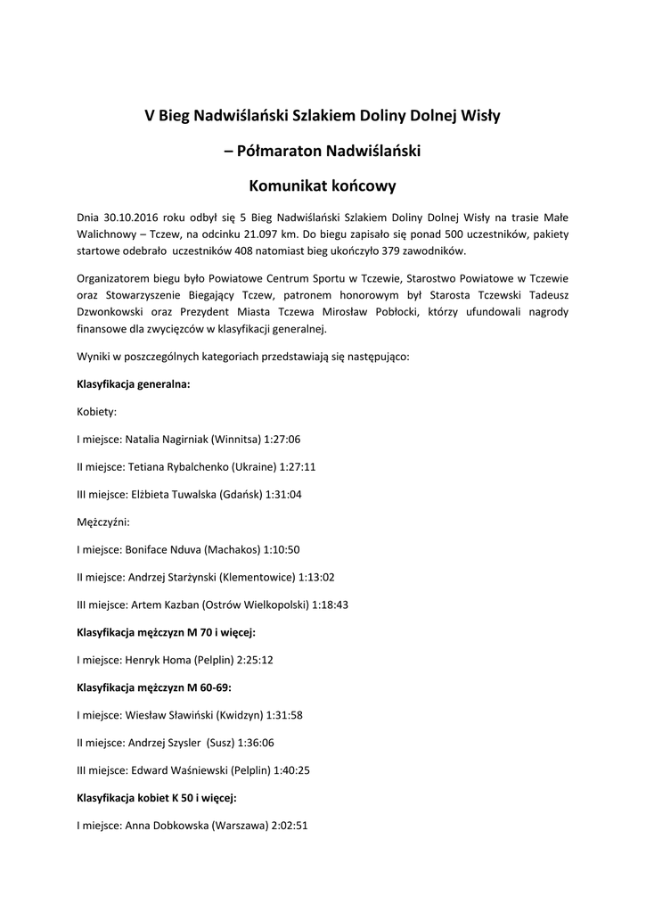 V Bieg Nadwiślański Szlakiem Doliny Dolnej Wisły – Półmaraton Nadwiślański Komunikat końcowy Dnia 30.10.2016 roku odbył się 5 Bieg Nadwiślański Szlakiem Doliny Dolnej Wisły na trasie Małe Walichnowy – Tczew, na odcinku 21.097 km. Do biegu zapisało się ponad 500 uczestników, pakiety startowe odebrało uczestników 408 natomiast bieg ukończyło 379 zawodników. Organizatorem biegu było Powiatowe Centrum Sportu w Tczewie, Starostwo Powiatowe w Tczewie oraz Stowarzyszenie Biegający Tczew, patronem honorowym był Starosta Tczewski Tadeusz Dzwonkowski oraz Prezydent Miasta Tczewa Mirosław Pobłocki, którzy ufundowali nagrody finansowe dla zwycięzców w klasyfikacji generalnej. Wyniki w poszczególnych kategoriach przedstawiają się następująco: Klasyfikacja generalna: Kobiety: I miejsce: Natalia Nagirniak (Winnitsa) 1:27:06 II miejsce: Tetiana Rybalchenko (Ukraine) 1:27:11 III miejsce: Elżbieta Tuwalska (Gdańsk) 1:31:04 Mężczyźni: I miejsce: Boniface Nduva (Machakos) 1:10:50 II miejsce: Andrzej Starżynski (Klementowice) 1:13:02 III miejsce: Artem Kazban (Ostrów Wielkopolski) 1:18:43 Klasyfikacja mężczyzn M 70 i więcej: I miejsce: Henryk Homa (Pelplin) 2:25:12 Klasyfikacja mężczyzn M 60-69: I miejsce: Wiesław Sławiński (Kwidzyn) 1:31:58 II miejsce: Andrzej Szysler (Susz) 1:36:06 III miejsce: Edward Waśniewski (Pelplin) 1:40:25 Klasyfikacja kobiet K 50 i więcej: I miejsce: Anna Dobkowska (Warszawa) 2:02:51 II miejsce: Lucyna Prasek (Gdynia) 2:10:31 III miejsce: Aleksandra Woron (Malbork) 2:20:25 Klasyfikacja mężczyzn M 50-59: I miejsce: Bogdan Cebula (Sztum) 1:27:34 II miejsce: Marek Labuda (Lębork) 1:30:51 III miejsce: Zbigniew Wesołowski (Skórcz) 1:33:45 Klasyfikacja kobiet K 40-49: I miejsce: Mariola Raszlińska (Bydgoszcz) 1:46:44 II miejsce: Ewa Mickiewicz (Elbląg) 1:47:56 III miejsce: Maria Pióro (Gorzędziej) 1:49:15 Klasyfikacja mężczyzn M 40-49: I miejsce: Sebastian Sikora (Gdynia) 1:19:19 II miejsce: Wojciech Oliński (Malbork) 1:21:34 III miejsce: Grzegorz Stankiewicz (Sztum) 1:27:05 Klasyfikacja kobiet K 30-39: I miejsce: MałgorzataTuwalska (Gdańsk) 1:33:03 II miejsce: Alicja Walendziak (Malbork) 1:38:58 III miejsce: Anna Piekut (Tczew) 1:43:12 Klasyfikacja mężczyzn M 30-39: I miejsce: Krzysztof Pawłowski (Tczew) 1:19:42 II miejsce: Rafał Chętnik (Sztum) 1:23:17 III miejsce: Kamil Górski (Gniew) 1:23:57 Klasyfikacja kobiet K do 29: I miejsce: Aleksandra Grabias (Gdańsk) 1:37:28 II miejsce: Dorota Julke (Tczew) 1:52:41 III miejsce: Monika Kozioł (Sadlinki) 1:55:25 Klasyfikacja mężczyzn M do 29: I miejsce: Tomasz Szczykutowicz (Gdańsk) 1:28:07 II miejsce: Mateusz Gumkowski (Kwidzyn) 1:28:50 III miejsce: Piotr Grzonka (Czarna Woda) 1:30:08 Najlepsi mieszkańcy Powiatu Tczewskiego zostali uhonorowani pamiątkowymi pucharami ufundowanymi przez Starostę Powiatu Tczewskiego Tadeusza Dzwonkowskiego. Wśród kobiet – Anna Piekut (Tczew); Wśród mężczyzny – Krzysztof Pawłowski (Tczew) Wszyscy uczestnicy biegu otrzymali pamiątkowe medale, koszulki, spodenki, izotoniki, natomiast zwycięzcy w poszczególnych kategoriach wiekowych puchary. Wśród wszystkich, którzy ukończyli bieg rozlosowano nagrody rzeczowe, nagrody wręczali Starosta Tczewski Tadeusz Dzwonkowski, Adam Urban z-ca Prezydenta Miasta Tczewa, Tadeusz Grześkowiak właściciel firmy Resteks sponsora strategicznego biegu. Dla wszystkich uczestników po biegu czekała smaczna grochówka ufundowana przez Piotra Rezmera „Restauracja Piaskowa” oraz przepyszne drożdżówki z tczewskiej piekarni „Sambor” Jacek Zywert. Impreza nie odbyłaby się gdyby nie sponsorzy, darczyńcy oraz wolontariusze, którym w tym miejscu serdecznie dziękuję: RESTEKS budownictwo – sponsor strategiczny. ZSBiO w Tczewie, Carrefour w Tczewie, Hurtownia „Sad”, Wojar , Meblex, Restauracja „Kanion grill”, ZUK w Tczewie, Restauracja „Piaskowa”, Jysk w Tczewie, EbroGym, Przedsiębiorstwo Usług Miejskich – Grudziądz, Sklep jubilerski „Tempo”, „Handpol” Roma Leszczyński, Piekarnia SAMBOR – Jacek Zywert, Auto-Fox Michał Grześkowiak, PanLink, Kino Helios Tczew, Stowarzyszenie Gospodarcze Kociewiak, Stolman meble na wymiar – Artur Manuszewski, ZUOS Tczew, Hotel Almond Gdańsk, Ośrodek Szkolenia Kierowców „Chmara”, ReHfun. Trasę biegu zabezpieczał wydział drogowy Powiatowej Komendy Policji w Tczewie, Straż Miejska oraz Ochotnicze Straże Pożarne, bez których impreza nie przebiegłaby tak sprawnie i bezpiecznie za co organizator bardzo dziękuje. O fotorelację zadbali Beata Czaplewska, Bartosz Sieńkwoski, Sylwester Kryger, Michał Bollin oraz Piotr Grabowski serdecznie dziękujemy. Szczególne podziękowania kierujemy na ręce Pani Iwony Michalskiej, Justyny Domnik oraz Moniki Brzozowskiej którzy wraz z wolontariuszami z II LO w Tczewie, SP nr 11 i nr 10 w Tczewie obsługiwali depozyt oraz punkty nawadniające. Podziękowania dla OHP w Tczewie za wsparcie organizacyjne biegu. Dziękujemy również Lucynie, Karolowi Waruszewskim oraz członkom Stowarzyszenia Biegający Tczew za wsparcie organizacyjne. Słowa podziękowania należą się również pracownikom ZSBiO w Tczewie. Serdecznie dziękuję współpracownikom, i ich rodzinom. Patronat medialny nad wydarzeniem objęli Telewizja Tetka, Radio Gdańsk, Dziennik Bałtycki, Gazeta Tczewska, portal internetowy Tcz.pl serdecznie dziękujemy. Więcej informacji, zdjęci na stronie: www.polmaratontczew.pl , www.biegajacy.tczew.pl Do zobaczenia za rok! Ze sportowym pozdrowieniem Organizator PCS w Tczewie