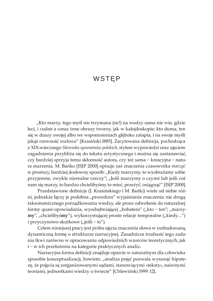 W S T Ę P „Kto marzy, tego myśl nie trzymana (sic!) na wodzy sama nie wie, gdzie leci, i cudne a coraz inne obrazy tworzy, jak w kalejdoskopie; kto duma, ten się w duszy swojej albo we wspomnieniach głęboko zatapia, i na swoje myśli jakąś rzewność rozlewa” [Krasiński 1885]. Zacytowana definicja, pochodząca z XIX-wiecznego Słownika synonimów polskich, stylem wypowiedzi oraz ujęciem zagadnienia przybliża się do tekstu artystycznego i można się zastanawiać, czy bardziej sprzyja temu skłonność autora, czy też sama − kreacyjna − natura marzenia. M. Bańko [ISJP 2000] opisuje zaś znaczenia czasownika marzyć w prostszy, bardziej dosłowny sposób: „Kiedy marzymy, to wyobrażamy sobie przyjemne, zwykle nierealne rzeczy”; „Jeśli marzymy o czymś lub jeśli coś nam się marzy, to bardzo chcielibyśmy to mieć, przeżyć, osiągnąć” [ISJP 2000]. Przedstawione definicje (J. Krasińskiego i M. Bańki) wiele od siebie różni, jednakże łączy je podobna „procedura” wyjaśniania znaczenia: nie drogą taksonomicznego porządkowania wiedzy, ale przez odwołanie do naturalnej formy quasi-opowiadania, wyodrębniającej „bohatera” („kto − ten”; „marzymy”, „chcielibyśmy”), wykorzystującej proste relacje temporalne („kiedy…”) i przyczynowo-skutkowe („jeśli − to”). Celem niniejszej pracy jest próba ujęcia znaczenia słowa w rozbudowaną, dynamiczną formę o strukturze narracyjnej. Zasadnicza trudność tego zadania tkwi zarówno w opracowaniu odpowiednich wzorców teoretycznych, jak i − w ich przełożeniu na kategorie praktycznych analiz. Narracyjna forma definicji znajduje oparcie w naturalnym dla człowieka sposobie konceptualizacji, bowiem: „analiza pojęć pozwala wysunąć hipotezę, że pojęcia są zorganizowanymi sądami, stanowiącymi »teksty«, naiwnymi teoriami, jednostkami wiedzy o świecie” [Chlewiński 1999: 12]. 10 Wstęp Problemy relacji: pojęcie − język, znane już myślicielom starożytnym, dziś w nowym świetle ukazuje neurobiologia; osiągnięcia neuronauk wyjaśniają integrację czynności konceptualnych różnych poziomów1; relacje między pojęciem a słowem są studiowane także przez socjologię, antropologię (zwłaszcza kulturową), filozofię, psychologię. W dzisiejszej lingwistyce całościowy opis semantyczny coraz wyraźniej wymaga więc uwzględnienia kontekstów interdyscyplinarnych oraz − fundamentu konceptualnego. Przypomnieniu i analizie metodologicznych podstaw opisu relacji: słowo−pojęcie; pojęcie−słowo poświęcam jeden z rozdziałów książki: lingwiści powracają bowiem do postawionych ponad sto lat wcześniej pytań natury semazjologicznej i onomazjologicznej, zakładając, że dzisiejsze odpowiedzi mogą otworzyć nowe perspektywy badań. Ujęcie onomazjologiczne otwiera semantykę na szeroki kontekst konceptualny. Znaczenie leksykalne można zatem rozpatrywać jako element otwartego zbioru wiedzy, z którego „wyłaniają się” elementy najmocniej skonwencjonalizowane. Wiedza ta jest aktywnie przetwarzana, interpretowana przez umysł człowieka, budujący poznawczą reprezentację świata (ogólny obraz świata), czy też − reprezentacje jego poszczególnych składników. Struktury te nie stanowią prostego odzwierciedlenia otaczającej rzeczywistości, lecz są „aktywnie i samodzielnie utworzonymi konstrukcjami” [Nęcka i in., 2006: 27]. Powyższy wniosek jest bliski niektórym tezom kognitywnej teorii znaczenia jako konceptualizacji [Langacker 1995, 2009). W polskiej semantyce założenie, iż „znaczenie słowa to nie wierne odzwierciedlenie cech odpowiadającego słowu obiektu” [Tokarski 2001: 345; podkr. D. F.], ale „różnie zwerbalizowana interpretacja rzeczywistości” [Bartmiński 2007b: 12] przyjmuje się zaś w badaniach nad językowym obrazem świata. Niniejsza książka wykorzystuje metodologię wypracowaną i usystematyzowaną w licznych pracach z tego zakresu. Wyrażany w języku obraz świata jest w nich uznawany za poznawczą, kulturowo motywowaną interpretację rzeczywistości. Wiedza, „wpisana” w fakty językowe, jest zaś postrzegana jako najsilniej skonwencjonalizowana „cząstka” całej sfery, kulturowo i doświadczeniowo2 motywowanych pojęć. Jeden 1 Na przykład na poziomach: układu nerwowego (komórki, sieci neuronalne); umysłu (procesy poznawcze, emocje, osobowość); mowy (posługiwanie się językiem). 2 Utrwalone w języku polskim słowa doświadczalnie i doświadczalny odnoszą się do ‘weryfikacji czegoś poprzez doświadczenie’. Przysłówkowi doświadczeniowo oraz przymiotnikowi doświadczeniowy chcę tu natomiast nadać nieco inne znaczenia, związane z koncepcją doświadczenia ucieleśnionego (Evans 2007: 26) czy poznania ucieleśnionego (Evans 2007: 106), Experiential cognition jako kluczowa teza kognitywizmu podkreśla, iż ludzki umysł i poznanie nie są „bezcielesnymi abstrakcjami” lecz są osadzone w somatycznej naturze człowieka. Wstęp 11 z rozdziałów części wprowadzającej poświęcam więc zagadnieniu współistotności czynników kulturowych i językowych oraz – krótkiemu przypomnieniu założeń metodologii językowego obrazu świata. Uwzględniając konceptualne podstawy języka, należy zadać pytanie o samą naturę pojęć czy mechanizmów poznawczych, nadających pojęciom określony kształt. Jedną z wielu możliwych odpowiedzi prezentuje inspirująca lingwistykę teoria schematu. Językoznawstwo z powodzeniem wykorzystuje wywodzące się z tej koncepcji pomysły i terminy: prototyp, wyidealizowany model poznawczy, skrypt, scenariusz, rama, domena czy schemat wyobrażeniowy. Przełożenie tych teorii na prawidłowości semantyczne nie zawsze jednak jest proste. Oprócz oczywistych odmienności metodologicznych, które rysują się między różnymi dyscyplinami naukowymi, trudności sprawia niejednoznaczność samego terminu „schemat”, a także − brak 