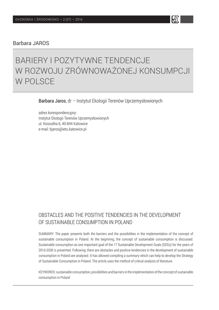 EKONOMIA I ŚRODOWISKO • 2 (57) • 2016 Barbara JAROS BARIERY I POZYTYWNE TENDENCJE W ROZWOJU ZRÓWNOWAŻONEJ KONSUMPCJI W POLSCE Barbara Jaros, dr – Instytut Ekologii Terenów Uprzemysłowionych adres korespondencyjny: Instytut Ekologii Terenów Uprzemysłowionych ul. Kossutha 6, 40-844 Katowice e-mail: [email protected] OBSTACLES AND THE POSITIVE TENDENCIES IN THE DEVELOPMENT OF SUSTAINABLE CONSUMPTION IN POLAND SUMMARY: The paper presents both the barriers and the possibilities in the implementation of the concept of sustainable consumption in Poland. At the beginning, the concept of sustainable consumption is discussed. Sustainable consumption as one important goal of the 17 Sustainable Development Goals (SDGs) for the years of 2016-2030 is presented. Following, there are obstacles and positive tendencies in the development of sustainable consumption in Poland are analysed. It has allowed compiling a summary which can help to develop the Strategy of Sustainable Consumption in Poland. The article uses the method of critical analysis of literature. KEYWORDS: sustainable consumption, possibilities and barriers in the implementation of the concept of sustainable consumption in Poland EKONOMIA I ŚRODOWISKO 2 (57) • 2016 Polityka ekologiczna i zarządzanie środowiskiem Wstęp Zrównoważona konsumpcja jest jednym z głównych celów zrównoważonego rozwoju; jest zarazem mocno związana z urzeczywistnianiem jakości życia jako celu nadrzędnego nowego paradygmatu rozwoju1. Zrównoważona konsumpcja, wraz ze zrównoważoną produkcją często bywają traktowane zarówno jako sedno zrównoważonego rozwoju oraz jako zagadnienie przekrojowe, które powinno być osadzone w innych celach tego rozwoju2. Zauważono, że cel zrównoważonej konsumpcji i produkcji znajduje się na pierwszym miejscu pod względem powiązań z realizacją innych celów zrównoważonego rozwoju3. Dlatego tak ważne jest, w odczuciu autorki artykułu, zajmowanie się problematyką zrównoważonej konsumpcji i włączanie jej zagadnień do odpowiednich polityk sektorowych, takich jak: turystyka, transport, rolnictwo, gospodarka energetyczna, czy budownictwo4. Na początku należy jednakże dokonać swoistego rozpoznania, w jakim zakresie koncepcja ta jest realizowana w naszym kraju. Celem artykułu jest zidenty ikowanie barier oraz przedstawienie pozytywnych tendencji wprowadzania w Polsce koncepcji zrównoważonej konsumpcji. Zrównoważona konsumpcja – podstawowe definicje O icjalna de inicja zrównoważonej konsumpcji została przyjęta już dość dawno temu, bo w 1994 roku podczas sympozjum na temat zrównoważonej konsumpcji w Oslo. Uznano, że zrównoważona konsumpcja będzie oznaczała „taki proces korzystania z dóbr i usług, który zaspokaja podstawowe potrzeby i przynosi lepszą jakość życia wraz z równoczesnym obniżaniem zużycia zasobów naturalnych, materiałów toksycznych oraz emisji odpadów i zanieczyszczeń w całym cyklu życia (produktu) tak, aby nie ograniczyć możliwości przyszłych pokoleń do zaspokojenia własnych potrzeb”5. 1 2 3 4 5 T. Borys, Wybrane problemy metodologii pomiaru nowego paradygmatu rozwoju – polskie doświadczenia, „Optimum. Studia Ekonomiczne” 2014 nr 3(69), s. 9-11. L. Akenji, M. Bengtsson, Making Sustainable Consumption and Production the Core of the Sustainable Development Goals, Kanagawa 2014, s. 4. D. Le Blanc, Towards integration at last? The Sustainable Development Goals as a network of targets, Rio +20 working papers, December 2014, s. 3-16, www.sustainabledevelopment.un.org [23-02-2015]. T. Borys, op. cit., s. 11. www.iisd.ca [21-10-2015]. 25 26 Polityka ekologiczna i zarządzanie środowiskiem EKONOMIA I ŚRODOWISKO 2 (57) • 2016 W praktyce dokonuje się rozróżnienia na tak zwaną słabą oraz silną zrównoważoną konsumpcję6. W jej słabej odmianie zakłada się, że zrównoważona konsumpcja zostanie osiągnięta poprzez poprawę efektywności energetycznej urządzeń oraz inne rozwiązania technologiczne. Jak zauważyła S. Lorek, podejście to zdominowało myślenie polityczne i naukowe, w szczególności od czasu Szczytu Ziemi w Johannesburgu w 2002 roku i jego wyrazem jest koncepcja zrównoważonej konsumpcji i produkcji (SCP – Sustainable Consumption and Production). W SCP uwaga skupiona jest na produktach, usługach oraz odpowiedzialności konsumenta za kupno ekologicznych, zrównoważonych produktów. Z kolei w silnej zrównoważonej konsumpcji zakłada się, że w celu osiągnięcia zrównoważonej konsumpcji muszą dodatkowo zajść istotne zmiany w poziomach i wzorcach konsumpcji. Podkreśla się tu potrzebę całościowego ograniczenia poziomów konsumpcji zasobów. W silnej zrównoważonej konsumpcji istotne znaczenie pełni koncepcja jakości życia, dobrego życia, aktywności pozaekonomicznej człowieka7. Zdaniem autorki artykułu celem nadrzędnym konsumpcji zrównoważonej jest trwała poprawa jakości życia (co odpowiada pojęciu silnej zrównoważonej konsumpcji) w aspektach „mieć”, „być” oraz „kochać”. Konsumpcja zrównoważona oznacza konsumpcję świadomą opartą na odpowiedzialności i wysokiej świadomości własnych potrzeb, co sprowadza się do podejmowania świadomych i odpowiedzialnych decyzji przez konsumenta. Zrównoważona konsumpcja to także użytkowanie alternatywnych, pochodzących z surowców odnawialnych, energooszczędnych urządzeń, czyli uwzględnienie „technologicznej” drogi rozwiązania problemów. Zrównoważona konsumpcja z jednej strony oznacza „konsumowanie mniej”, a z drugiej „konsumowanie inaczej”. Ten pierwszy rodzaj może przykładowo oznaczać ograniczanie przejazdów samochodem, a ten drugi stosowanie zasad ecodrivingu, czyli zasad oszczędnej jazdy autem. W Nowym Jorku w dniach 25-27 września 2015 roku odbył się Szczyt Zrównoważonego Rozwoju Organizacji Narodów Zjednoczonych, na którym przyjęto 17 Celów Zrównoważonego Rozwoju na lat