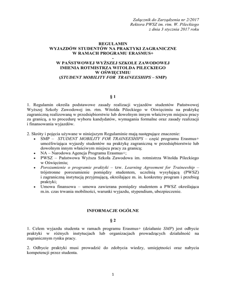 Załącznik do Zarządzenia nr 2/2017 Rektora PWSZ im. rtm. W. Pileckiego z dnia 3 stycznia 2017 roku REGULAMIN WYJAZDÓW STUDENTÓW NA PRAKTYKI ZAGRANICZNE W RAMACH PROGRAMU ERASMUS+ W PAŃSTWOWEJ WYŻSZEJ SZKOLE ZAWODOWEJ IMIENIA ROTMISTRZA WITOLDA PILECKIEGO W OŚWIĘCIMIU (STUDENT MOBILITY FOR TRAINEESHIPS – SMP) §1 1. Regulamin określa podstawowe zasady realizacji wyjazdów studentów Państwowej Wyższej Szkoły Zawodowej im. rtm. Witolda Pileckiego w Oświęcimiu na praktykę zagraniczną realizowaną w przedsiębiorstwie lub dowolnym innym właściwym miejscu pracy za granicą, a to procedurę wyboru kandydatów, wymagania formalne oraz zasady realizacji i finansowania wyjazdów. 2. Skróty i pojęcia używane w niniejszym Regulaminie mają następujące znaczenie: SMP – STUDENT MOBILITY FOR TRAINEESHIPS – część programu Erasmus+ umożliwiająca wyjazdy studentów na praktykę zagraniczną w przedsiębiorstwie lub dowolnym innym właściwym miejscu pracy za granicą; NA – Narodowa Agencja Programu Erasmus+; PWSZ – Państwowa Wyższa Szkoła Zawodowa im. rotmistrza Witolda Pileckiego w Oświęcimiu; Porozumienie o programie praktyki – tzw. Learning Agreement for Traineeship – trójstronne porozumienie pomiędzy studentem, uczelnią wysyłającą (PWSZ) i zagraniczną instytucją przyjmującą, określające m. in. konkretny program i przebieg praktyki; Umowa finansowa – umowa zawierana pomiędzy studentem a PWSZ określająca m.in. czas trwania mobilności, warunki wyjazdu, stypendium, ubezpieczenie. INFORMACJE OGÓLNE §2 1. Celem wyjazdu studenta w ramach programu Erasmus+ (działanie SMP) jest odbycie praktyki w różnych instytucjach lub organizacjach prowadzących działalność na zagranicznym rynku pracy. 2. Odbycie praktyki musi prowadzić do zdobycia wiedzy, umiejętności oraz nabycia kompetencji przez studenta. 1 §3 1. Organizacją wysyłającą studenta w celu odbycia praktyki zagranicznej musi być instytucja posiadająca przyznaną Kartę Erasmusa dla Szkolnictwa Wyższego 2014-2020 (Erasmus Charter for Higher Education, ECHE). 2. Instytucją przyjmującą studenta na praktykę zagraniczną może być: a) każda publiczna lub prywatna organizacja prowadząca działalność na rynku pracy lub w dziedzinie kształcenia, szkolenia i na rzecz młodzieży. Przykładowo taką organizacją może być: publiczne lub prywatne małe, średnie lub duże przedsiębiorstwo (w tym przedsiębiorstwa społeczne), organ publiczny na szczeblu lokalnym, regionalnym lub krajowym, partner społeczny lub inny przedstawiciel świata pracy, w tym izby handlowe, stowarzyszenia rzemieślnicze/zawodowe i związki zawodowe, instytut badawczy, placówka naukowo-badawcza, fundacja, szkoła/instytut/ośrodek edukacyjny (na dowolnym poziomie, począwszy od kształcenia na poziomie przedszkolnym, a skończywszy na kształceniu na poziomie średnim II stopnia, w tym również kształceniu zawodowym i edukacji dorosłych), instytucja tj. biblioteka, szpital, muzeum itp., b) organizacja niekomercyjna non-profit, stowarzyszenie, organizacja pozarządowa, c) instytucja prowadząca poradnictwo zawodowe, doradztwo zawodowe i usługi informacyjne, d) instytucja szkolnictwa wyższego z kraju programu posiadająca Kartę Erasmusa dla Szkolnictwa Wyższego 2014-2020 (Erasmus Charter for Higher Education, ECHE). 3. Praktyka zagraniczna nie może odbyć się w instytucjach unijnych, w instytucjach odpowiedzialnych za zarządzanie unijnymi programami, ani w polskich placówkach dyplomatycznych za granicą. 4. Praktyka zagraniczna może odbyć się tylko w kraju uczestniczącym w programie Erasmus+ - innym niż kraj organizacji wysyłającej i kraj pochodzenia. §4 Praktyka musi być związana z dziedziną, kierunkiem kształcenia i stopniem studiów, jakie odbywa student. Będzie ona stanowiła integralną część programu studiów (praktyka obowiązkowa); w innych przypadkach – umożliwi zdobycie dodatkowych kompetencji i umiejętności (praktyka nieobowiązkowa). §5 Wyjazd na praktykę nie może kolidować z ukończeniem studiów w terminie przewidywanym w planie studiów. §6 1. Kryteria udziału w programie Erasmus+: a) podstawowym kryterium udziału w programie Erasmus+ jest znajomość języka obcego, w którym odbędzie się praktyka. Aby ubiegać się o wyjazd na praktykę 2 zagraniczną student musi znać dany język obcy w takim stopniu, aby mógł brać aktywny udział w działalności zagranicznej instytucji przyjmującej; b) pozostałe kryteria – student: jest obywatelem kraju uprawnionego do uczestnictwa w programie Erasmus+ lub posiada oficjalny status uchodźcy albo prawo stałego pobytu na terytorium Polski, jest zarejestrowany na studiach w Państwowej Wyższej Szkole Zawodowej im. rtm. W. Pileckiego w Oświęcimiu, ma ukończony pierwszy rok studiów – w momencie rekrutacji ma zaliczony pierwszy semestr studiów, jeśli wyjazd ma nastąpić w kolejnym roku akademickim, nie zalega z opłatami za studia, posiada średnią ocen min. 3.5, w momencie wyjazdu oraz w trakcie pobytu w zagranicznej instytucji przyjmującej nie przebywa na urlopie. 2. Słuchacze studiów podyplomowych nie są uprawnieni do uczestnictwa w programie Erasmus+. §7 1. Student może ubiegać się o wyjazdy w ramach programu Erasmus+ o łącznym maksymalnym czasie trwania do 12 miesięcy (łącznie wyjazd na praktyki [działanie SMP] oraz na studia [działanie SMS]) na każdym z poziomu studiów (pierwszego stopnia, drugiego stopnia). 2. Wyjazdy studenta na praktykę zagraniczną oraz na studia do uczelni zagranicznej nie mogą nastąpić w tym samym okresie czasu, natomiast są możliwe w tym samym roku akademickim. §8 Minimalny okres pobytu podczas jednego wyjazdu na praktykę zagraniczną nie może być krótszy niż 2 miesiące i dłuższy niż 12 miesięcy. §9 Wyjazd studenta na praktykę zagraniczną może się rozpoczynać od 1 lipca – trzy miesiące przed rozpoczęciem danego roku akad