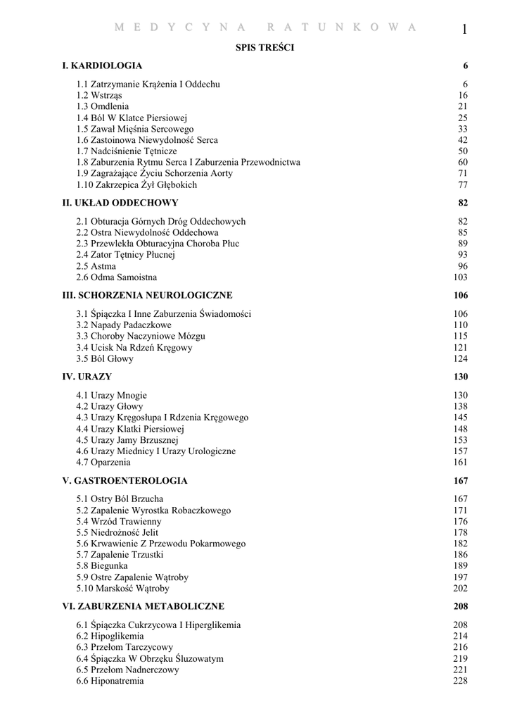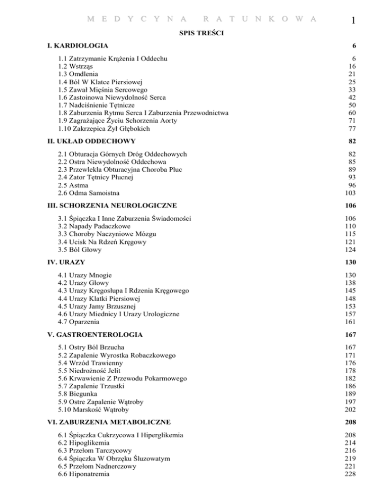 M E D Y C Y N A R A T U N K O W A 1 SPIS TREŚCI I. KARDIOLOGIA 1.1 Zatrzymanie Krążenia I Oddechu 1.2 Wstrząs 1.3 Omdlenia 1.4 Ból W Klatce Piersiowej 1.5 Zawał Mięśnia Sercowego 1.6 Zastoinowa Niewydolność Serca 1.7 Nadciśnienie Tętnicze 1.8 Zaburzenia Rytmu Serca I Zaburzenia Przewodnictwa 1.9 Zagrażające Życiu Schorzenia Aorty 1.10 Zakrzepica Żył Głębokich II. UKŁAD ODDECHOWY 2.1 Obturacja Górnych Dróg Oddechowych 2.2 Ostra Niewydolność Oddechowa 2.3 Przewlekła Obturacyjna Choroba Płuc 2.4 Zator Tętnicy Płucnej 2.5 Astma 2.6 Odma Samoistna III. SCHORZENIA NEUROLOGICZNE 3.1 Śpiączka I Inne Zaburzenia Świadomości 3.2 Napady Padaczkowe 3.3 Choroby Naczyniowe Mózgu 3.4 Ucisk Na Rdzeń Kręgowy 3.5 Ból Głowy IV. URAZY 4.1 Urazy Mnogie 4.2 Urazy Głowy 4.3 Urazy Kręgosłupa I Rdzenia Kręgowego 4.4 Urazy Klatki Piersiowej 4.5 Urazy Jamy Brzusznej 4.6 Urazy Miednicy I Urazy Urologiczne 4.7 Oparzenia V. GASTROENTEROLOGIA 5.1 Ostry Ból Brzucha 5.2 Zapalenie Wyrostka Robaczkowego 5.4 Wrzód Trawienny 5.5 Niedrożność Jelit 5.6 Krwawienie Z Przewodu Pokarmowego 5.7 Zapalenie Trzustki 5.8 Biegunka 5.9 Ostre Zapalenie Wątroby 5.10 Marskość Wątroby VI. ZABURZENIA METABOLICZNE 6.1 Śpiączka Cukrzycowa I Hiperglikemia 6.2 Hipoglikemia 6.3 Przełom Tarczycowy 6.4 Śpiączka W Obrzęku Śluzowatym 6.5 Przełom Nadnerczowy 6.6 Hiponatremia 6 6 16 21 25 33 42 50 60 71 77 82 82 85 89 93 96 103 106 106 110 115 121 124 130 130 138 145 148 153 157 161 167 167 171 176 178 182 186 189 197 202 208 208 214 216 219 221 228 M E D Y C Y N A 2 R A T U N K O W A 6.7 Hipernatremia 6.8 Hipokaliemia 6.9 Hiperkaliemia VII. ZATRUCIA 7.1 Postępowanie Wstępne I Terapia Podtrzymująca 7.2 Zatrucia Opioidami 7.3 Zatrucia Środkami Nasennymi 7.4 Środki Antycholinergiczne I Wielocykliczne Leki Przeciwdepresyjne 7.5 Sympatykomimetyki: Kokaina I Amfetamina 7.6 Zatrucia Salicylanami 7.7 Zatrucia Acetaminofenem 7.8 Zatrucia Tlenkiem Węgla 7.9 Zatrucia Etanolem, Metanolem, Izopropanolem I Glikolem Etylenowym 7.10 Zespoły Abstynencyjne Alkohol Etylowy VIII. ALERGIA, ANAFILAKSJA I POKRZYWKA IX. CHOROBY INFEKCYJNE 9.1 Zapalenie Opon Mózgowo-Rdzeniowych 9.2 Zakażenia Dolnych Dróg Oddechowych 9.3 Choroby Infekcyjne Serca 9.4 Choroby Przenoszone Drogą Płciową 9.5 Infekcje Skóry I Tkanek Miękkich 9.6 Zakażenia Kości I Stawów 9.7 Zespół Nabytego Niedoboru Odporności (Aids) 9.8 Wybrane Stany Naglące W Chorobach Zakaźnych 9.9. Posocznica X. POŁOŻNICTWO I GINEKOLOGIA 10.1 Ciąża Ektopowa 10.2 Nagły Poród 10.3 Stany Zapalne Miednicy 10.4 Przemoc Seksualna 10.5 Krwawienie Z Pochwy 10.6 Zapalenie Pochwy XI. UROLOGIA 11.1 Ostre Zatrzymanie Moczu 11.2 Zakażenia Dróg Moczowych 11.3 Zakażenie Męskiego Układu Moczowo-Płciowego 11.4 Kamica Nerkowa 11.5 Inne Nagłe Przypadki Urologiczne XII. NERKI 12.1 Ostra Niewydolność Nerek 12.2 Rabdomioliza XIII. HEMATOLOGIA 13.1 Transfuzja Krwi 13.2 Przełom W Niedokrwistości Sierpowatokrwinkowej 13.3 Zaburzenia Krwotoczne XIV. OKULISTYKA 231 233 235 238 238 246 249 252 252 255 259 263 265 268 274 278 285 285 291 300 306 315 324 328 328 336 340 340 343 346 349 352 359 362 362 365 369 373 377 379 379 383 386 386 390 393 406 M E D Y C Y N A R A T U N K O W A 14.1 Uwagi Ogólne 14.2 Czerwone Oko 14.3 Nagła Utrata Widzenia 14.4 Urazy Oka XV. LARYNGOLOGIA 15.1 Zawroty Głowy 15.2 Zapalenie Zatok Przynosowych 15.3 Krwawienie Z Nosa 15.4 Ból Gardła 15.5 Ból Ucha XVI. PODSTAWOWE WIADOMOŚCI Z ORTOPEDII 16.1 Złamania 16.2 Zwichnięcia 16.3 Urazy Tkanek Miękkich 16.4 Zespoły Przedziałów Powięziowych 3 406 409 414 418 423 423 429 432 435 439 444 444 446 449 451 XVII. WALKA Z BÓLEM NA ODDZIALE RATUNKOWYM 453 XVIII. ZAGROŻENIA ŚRODOWISKOWE 460 18.1 Przegrzanie Organizmu 18.2 Wychłodzenie I Odmrożenie 18.3 Utonięcie XIX. PSYCHIATRIA 19.1 Ocena Stanu Somatycznego Chorych Z Zaburzeniami Psychicznymi 19.2 Chory Agresywny 19.3 Chory Z Tendencjami Samobójczymi 19.4 Organiczne Zespoły Mózgowe 19.5 Objawy Pozapiramidowe XX. ZAGADNIENIA PRAWNE, SPOŁECZNE I ETYCZNE 20.1 Przemoc W Rodzinie 20.2 Pacjenci Bezdomni 20.3 Świadoma Zgoda 20.4 Odmowa Zgody Na Leczenie 20.5 Decyzje O Postępowaniu Medycznym W Przyszłości 20.5a Stan Bezpośredniego Zagrożenia Życia - Postępowanie Lekarza (Uregulowania Prawne Obowiązujące W Polsce) 20.6 Przeszczepy Narządów XXI. ZABIEGI RATUNKOWE W STANACH ZAGROŻEŃ 21.1 Żylny Dostęp Naczyniowy 21.2 Zabiegi Na Klatce Piersiowej 21.3 Chirurgiczne Przywracanie Drożności Dróg Oddechowych 21.4 Zabiegi Na Jamie Brzusznej I Miednicy 21.5 Punkcja Stawu 21.6 Punkcja Lędźwiowa 21.7 Elektrostymulacja Serca 21.8 Szybkie Wprowadzenie Do Znieczulenia Ogólnego 21.9 Monitorowanie Ciśnienia W Przedziałach Powięziowych 21.10 Nagła Intubacja XXII. ZABURZENIA I LEKI W STANACH ZAGROŻENIA 22.1 Obliczenia Równowagi Kwasowo-Zasadowej 460 464 468 471 471 476 480 482 486 490 490 494 499 499 500 502 502 505 507 507 513 519 521 523 524 526 528 530 531 534 534 4 M E D Y C Y N A R A T U N K O W A 22.2 Gradient Pęcherzykowo-Tętniczy 22.3 Luka Anionowa 22.4 Wysycenie Tlenem (Saturacja) Krwi Tętniczej (Ryc. 22.4.1) 22.5 Zawartość Tlenu We Krwi Tętniczej 22.6 Klirens Kreatyniny 22.7 Frakcja Wydzielnicza Sodu 22.8 Luka Osmolalna 22.9 Obliczenia Dotyczące Układu Sercowo-Naczyniowego - Ciśnienia 534 535 535 536 536 537 537 537 M E D Y C Y N A R A T U N K O W A 5 I. Kardiologia 1.1 ZATRZYMANIE KRĄŻENIA I ODDECHU Opis Celem rcsuscytacji krążeniowo-oddechowej (CPR) i intensywnego podtrzymywania akcji serca jest „ocalenie serc zbyt dobrych, aby umrzeć", po to, by zabezpieczyć mózg przed utratą zdolności do życia. Zalecenia American Heart Assucialion to jedynie ogólne zasady postępowania, wymagające od osób sprawujących opiekę nad pacjentem w nagłych wypadkach elastyczności w podejmowaniu właściwych decyzji. Zawarte poniżej wskazówki są wynikiem konsensusu uzyskanego w czasie Piątej Konferencji Kraj