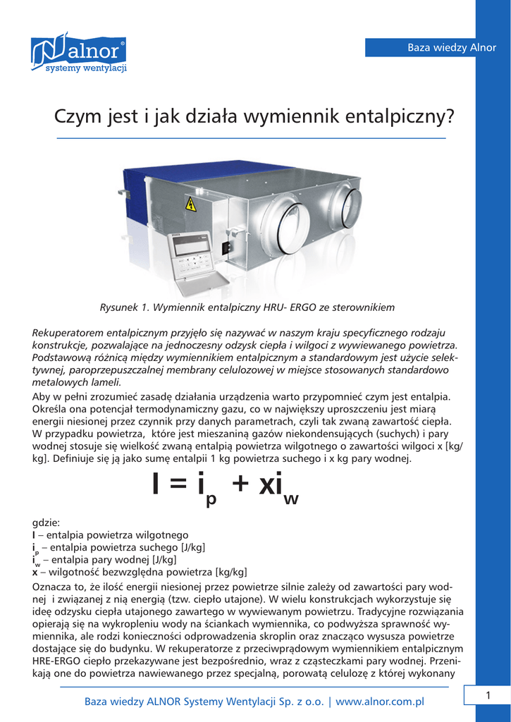 Baza wiedzy Alnor Czym jest i jak działa wymiennik entalpiczny? Rysunek 1. Wymiennik entalpiczny HRU- ERGO ze sterownikiem Rekuperatorem entalpicznym przyjęło się nazywać w naszym kraju specyficznego rodzaju konstrukcje, pozwalające na jednoczesny odzysk ciepła i wilgoci z wywiewanego powietrza. Podstawową różnicą między wymiennikiem entalpicznym a standardowym jest użycie selektywnej, paroprzepuszczalnej membrany celulozowej w miejsce stosowanych standardowo metalowych lameli. Aby w pełni zrozumieć zasadę działania urządzenia warto przypomnieć czym jest entalpia. Określa ona potencjał termodynamiczny gazu, co w największy uproszczeniu jest miarą energii niesionej przez czynnik przy danych parametrach, czyli tak zwaną zawartość ciepła. W przypadku powietrza, które jest mieszaniną gazów niekondensujących (suchych) i pary wodnej stosuje się wielkość zwaną entalpią powietrza wilgotnego o zawartości wilgoci x [kg/ kg]. Definiuje się ją jako sumę entalpii 1 kg powietrza suchego i x kg pary wodnej. I = ip + xiw gdzie: I – entalpia powietrza wilgotnego ip – entalpia powietrza suchego [J/kg] iw – entalpia pary wodnej [J/kg] x – wilgotność bezwzględna powietrza [kg/kg] Oznacza to, że ilość energii niesionej przez powietrze silnie zależy od zawartości pary wodnej i związanej z nią energią (tzw. ciepło utajone). W wielu konstrukcjach wykorzystuje się ideę odzysku ciepła utajonego zawartego w wywiewanym powietrzu. Tradycyjne rozwiązania opierają się na wykropleniu wody na ściankach wymiennika, co podwyższa sprawność wymiennika, ale rodzi konieczności odprowadzenia skroplin oraz znacząco wysusza powietrze dostające się do budynku. W rekuperatorze z przeciwprądowym wymiennikiem entalpicznym HRE-ERGO ciepło przekazywane jest bezpośrednio, wraz z cząsteczkami pary wodnej. Przenikają one do powietrza nawiewanego przez specjalną, porowatą celulozę z której wykonany Baza wiedzy ALNOR Systemy Wentylacji Sp. z o.o. | www.alnor.com.pl 1 Baza wiedzy Alnor jest wymiennik. Jako że nie następuje wykraplanie się wody, nie ma ryzyka oszronienia powierzchni rekuperatora, gwarantując nieprzerwaną wentylację i niższe zużycie energii przez centralę. Efektywność odzysku temperatury (oparta na pomiarze temperatury) w rekuperatorze podwieszanym HRU-ERGO wartość do 85%, jest więc niższa niż efektywność analogicznego, tradycyjnego wymiennika przeciwprądowego. Dzieje się tak, gdyż nie następuje podwyższenie temperatury powietrza nawiewanego kosztem wykraplającej się wody. Jednak przenikająca do nawiewanego powietrza para wodna o temperaturze pokojowej posiada pewną energię, której uwzględnienie powoduje uzyskanie całkowitej efektywności przekraczającej 100%. Mimo iż taka wartość wydaje się niemożliwa do osiągniecia, warto zauważyć że podobne obliczenia wykonuje się dla pieców CO wykorzystujących zjawisko kondensacji, a wartość sprawności powyżej 100 % wynika z wykorzystania tego normalnie niestosowanego w typowych rozwiązaniach efektu. Warto uświadomić sobie że powietrze o temperaturze nawet 15 stopni i wilgotności 60% ma wyższą zawartość ciepła niż suche powietrze ogrzane do temperatury 19 C i 30% wilgotności (parametry możliwe do uzyskania w tradycyjnej rekuperacji), co jest związane oczywiście z różną ilością ogrzanej pary wodnej w nich zawartej. Wydawało by się, że bardziej zależy nam na osiągnieciu odpowiedniej temperatury wewnątrz pomieszczenia, gdyż to ją bezpośrednio odczuwamy, niż wysokiej wartość dość abstrakcyjnego parametru jak entalpia. Jest to oczywiście prawdą, iż dla naszego komfortu kluczowe są temperatura i wilgotność powietrza, jednak to tak naprawdę ciepło (wyrażone jako entalpia) jest tym co tracimy przez ściany i okna budynku, a skuteczny odzysk tej energii pozwala ograniczyć koszt ogrzewania budynku. Paradoksalnie więc, łatwiej i taniej utrzymać w ogrzewanym mieszkaniu stałą temperaturę nawiewając chłodniejsze, wilgotne powietrze działające jak swego rodzaju bufor cieplny, niż suche i przegrzane. Rysunek 2. Wymiennik przeciwprądowy HRE-EGRO Wykorzystany do budowy wymiennika HRE-ERGO materiał posiada specjalną strukturę. Odległość między włóknami celulozy odpowiada wielkości cząsteczki wilgoci, co pozwala to na separację większych cząsteczek, oraz swobodny przepływ pary wodnej. Selektywność materiału oraz zastosowane filtry pozwalają skutecznie ograniczyć zanieczyszczenia oraz nieprzyjemne zapachy które mogą przedostać się do pomieszczeń. Jest to wyjątkowo ważne w zapewnieniu komfortu i higieny użytkowania systemu wentylacji. Bardzo istotnym faktem 2 Baza wiedzy ALNOR Systemy Wentylacji Sp. z o.o. | www.alnor.com.pl Baza wiedzy Alnor jest, że materiał z którego wykonany jest wymiennik został pokryty specjalną powłoką antybakteryjną, która ma silną zdolność do zabijania różnego typu bakterii oraz zapobieganiu rozrostowi grzybów w jednostce. Powłoka jest również odporna na ścieranie. Rodzaj gazu CO2 NH3 CH4 H20 Oczko wymiennika Średnica [nm] 0,324 0,308 0,324 0,288 0,3 Tabela 1. Wielkości różnych cząsteczek znajdujących się w powietrzu Standardowe ogrzewanie powietrza zawsze powoduje jego osuszenie, niezależnie od rodzaju zastosowanej wentylacji. Jego wilgotność względna znacznie spada, a efekty tego zjawiska są szczególnie odczuwalne zimą. Nawiewanie stosunkowo ciepłego i suchego powietrza prowadzi do nieprzyjemnego wysychania błon śluzowych, znacznie obniżając komfort przebywających wewnątrz osób. Konieczne jest wtedy stosowanie dodatkowych nawilżaczy, które oprócz generowania kosztów inwestycyjnych i eksploatacyjnych, obniżają temperaturę nawiewu w skutek rozpylenia wody w powietrzu. Ogranicza to korzyści wynikające z rekuperacji i odzysku temperatury w standardowej jednostce. W rekuperatorze HRU-ERGO z wymiennikiem entalpicznym powietrze z