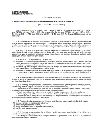 ROZPORZĄDZENIE MINISTRA GOSPODARKI z dnia 11 sierpnia 2000 r. w sprawie przeprowadzania kontroli przez przedsiębiorstwa energetyczne. (Dz. U. z dnia 15 września 2000 r.) Na podstawie art. 6 ust. 4 ustawy z dnia 10 kwietnia 1997 r. - Prawo energetyczne (Dz. U. Nr 54, poz. 348 i Nr 158, poz. 1042, z 1998 r. Nr 94, poz. 594, Nr 106, poz. 668 i Nr 162, poz. 1126, z 1999 r. Nr 88, poz. 980 i Nr 110, poz. 1255 oraz z 2000 r. Nr 43, poz. 489 i Nr 48, poz. 555) zarządza się, co następuje: § 1. Rozporządzenie określa szczegółowe zasady przeprowadzania przez przedsiębiorstwa energetyczne, zajmujące się przesyłaniem i dystrybucją paliw gazowych, energii elektrycznej lub ciepła, kontroli układów pomiarowych, dotrzymywania zawartych umów i prawidłowości rozliczeń, a także wzory protokołów kontroli i upoważnień do przeprowadzania kontroli oraz wzór legitymacji. § 2. Ilekroć w rozporządzeniu jest mowa o układach pomiarowych, należy przez to rozumieć gazomierze, liczniki energii elektrycznej lub ciepła albo inne przyrządy pomiarowe lub rozliczeniowopomiarowe wraz z układami połączeń między nimi, służące do pomiaru i rozliczeń zużycia paliw gazowych, energii elektrycznej lub ciepła. § 3. Kontrola, o której mowa w § 1, ma na celu: 1) sprawdzenie prawidłowości eksploatacji i działania układów pomiarowych oraz rozliczeń zużycia paliw gazowych, energii elektrycznej lub ciepła, a w przypadku stwierdzonych nieprawidłowości wyjaśnienie przyczyn ich powstania, 2) ustalenie, czy miało miejsce pobieranie paliw lub energii bez zawarcia umowy albo z częściowym lub całkowitym pominięciem układu pomiarowego, 3) sprawdzenie dotrzymywania warunków zawartej umowy, w szczególności zgodności sposobu wykorzystywania paliw gazowych, energii elektrycznej lub ciepła z warunkami określonymi w umowie. § 4. Przedsiębiorstwo energetyczne przeprowadza kontrolę z własnej inicjatywy lub na wniosek odbiorcy. Kontrolę na wniosek odbiorcy przedsiębiorstwo energetyczne przeprowadza w terminie 7 dni od dnia złożenia wniosku. § 5. 1. Kontrolę przeprowadzają upoważnieni przedstawiciele przedsiębiorstw energetycznych, zwani dalej "kontrolującymi", w zespole liczącym co najmniej dwie osoby. 2. Kontrolujący przeprowadzają kontrole na podstawie imiennego upoważnienia i legitymacji, wydanych przez właściwy organ przedsiębiorstwa energetycznego. 3. Wzór upoważnienia, o którym mowa w ust. 2, określa załącznik nr 1 do rozporządzenia. 4. Wzór legitymacji, o której mowa w ust. 2, określa załącznik nr 2 do rozporządzenia. 5. Przedsiębiorstwo energetyczne jest obowiązane do prowadzenia ewidencji przeprowadzonych kontroli i wydanych upoważnień oraz legitymacji. 1) 2) 3) 4) § 6. Przedsiębiorstwo energetyczne, zlecając kontrolującym przeprowadzenie kontroli, ustala: miejsce kontroli, ze wskazaniem odbiorcy, termin przeprowadzenia kontroli, osoby upoważnione do przeprowadzania kontroli, szczegółowy zakres kontroli. § 7. 1. Kontrolę przeprowadza się w dniach i godzinach pracy, obowiązujących u odbiorcy, w sposób nie zakłócający pracy. oo oo 2. Kontrolę w lokalu mieszkalnym przeprowadza się w godzinach od 7 do 20 , z wyłączeniem dni ustawowo wolnych od pracy. § 8. W ramach kontroli: 1) odbiorcy lub osoby przez nich upoważnione: a) zapewniają kontrolującym dostęp do urządzeń technicznych oraz wgląd do dokumentów i materiałów mających związek z przeprowadzaną kontrolą, b) udzielają kontrolującym niezbędnych wyjaśnień, 2) kontrolujący mają prawo: a) wglądu do dokumentów i materiałów mających związek z przeprowadzaną kontrolą, b) przeprowadzania oględzin i prób układów pomiarowych, c) przeprowadzania niezbędnych przeglądów urządzeń, będących własnością przedsiębiorstwa energetycznego, wykonywania prac związanych z ich eksploatacją lub naprawą oraz badań i pomiarów. § 9. Kontrola obejmuje w szczególności: 1) oględziny układów pomiarowych i ich zabezpieczeń przed uszkodzeniem, zniszczeniem lub zmianą wskazań, 2) sprawdzenie prawidłowości wskazań poszczególnych układów pomiarowych, 3) sprawdzenie właściwości metrologicznych układów pomiarowych, 4) ocenę poprawności działania elementów układu pomiarowego, 5) dokonanie badań i pomiarów w zakresie przedmiotu kontroli, 6) przeprowadzanie niezbędnych prac związanych z eksploatacją lub naprawą układów pomiarowych należących do przedsiębiorstwa energetycznego, 7) zebranie i zabezpieczenie materiałów dotyczących naruszenia przez odbiorcę warunków umowy zawartej z przedsiębiorstwem energetycznym, w szczególności warunków eksploatacji układów pomiarowych. § 10. Wejście na teren nieruchomości lub do pomieszczeń w celu przeprowadzenia kontroli oraz sama kontrola odbywa się w obecności odbiorcy bądź osób przez odbiorcę upoważnionych. § 11. Kontrolujący dokonują ustaleń stanu faktycznego na podstawie wyników oględzin, zabezpieczonych urządzeń, instalacji lub ich części, materiałów, o których mowa w § 9, oraz pisemnych wyjaśnień. § 12. Kontrolujący informują odbiorcę bądź osobę przez odbiorcę upoważnioną o ustaleniach wskazujących na ujawnione w trakcie prowadzonej kontroli nieprawidłowości w eksploatacji układów pomiarowych i prowadzonych rozliczeniach. § 13. 1. Z przeprowadzonej kontroli kontrolujący sporządzają protokół, w którym zamieszczają ustalenia dokonane w trakcie kontroli. 2. Protokół kontroli, o którym mowa w ust. 1, sporządza się w dwóch egzemplarzach, z których jeden otrzymuje odbiorca bądź osoba przez odbiorcę upoważniona. 3. Wzór protokołu kontroli, o którym mowa w ust. 1, określa załącznik nr 3 do rozporządzenia. § 14. 1. Odbiorcy albo osobie przez odbiorcę upoważnionej przysługuje prawo zgłoszenia, przed podpisaniem protokołu kontroli, umotywowanych zastrzeżeń co do ustaleń zawartych w protokole. 2. Zastrzeżeni
