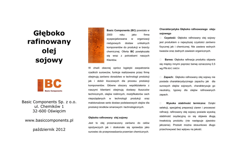 Głęboko rafinowany olej sojowy Basic Components (BC) powstała w 2000 roku jako firma Charakterystyka Głęboko rafinowanego oleju sojowego Czystość: Głęboko rafinowany olej sojowy w organizacji � dostaw unikalnych jest produktem o najwyższej czystości zarówno komponentów do produkcji w branży fizycznej jak i chemicznej. Nie zawiera wolnych chemicznej. Oferta BC powiększała kwasów oraz żadnych zawiesin organicznych. wyspecjalizowana nietypowych się wraz z potrzebami naszych � Klientów. Barwa: Głęboka rafinacja produktu objawia się między innymi poprzez barwę oznaczoną 0,5 W chwili obecnej oprócz logistyki zaopatrzenia wg PN-80/C-04034 rzadkich surowców, funkcje realizowane przez firmę obejmują zarówno doradztwo w technologii produkcji � Zapach: Głęboko rafinowany olej sojowy nie jak posiada charakterystycznego zapachu jak i dobór kluczowych dla procesu produkcji surowych olejów sojowych, charakteryzuje go naszymi neutralny, klientami obejmują dostawy tłuszczów technicznych, olejów roślinnych, modyfikatorów cech Basic Components Sp. z o.o. ul. Chemików 1 32-600 Oświęcim www.basiccomponents.pl październik 2012 dla komponentów. Główne obszary współdziałania z niepożądanych w technologii produkcji typowy dla olejów rafinowanych zapach. oraz małotonażowe serie dostaw podstawowych olejów dla � produkcji środków smarowych i technologicznych. selekcji, specjalnej preparacji ziaren i procesowi Wysoka stabilność termiczna: Dzięki rafinacji, rafinowany olej sojowy posiada wysoką stabilność oxydacyjną co się objawia długą Głęboko rafinowany olej sojowy Jest to olej przeznaczony zarówno do celów spożywczych jak i doskonale się sprawdza jako surowiec do przeprowadzania przemian chemicznych. trwałością produktu (nie następuje zjawisko jełczenia). Produkt można stosunkowo długo przechowywać bez wpływu na jakość. Typowe własności głęboko rafinowanego oleju sojowego Oznaczane parametry Lepkość kinematyczna w temp. 40 °C, mm2/s Temperatura płynięcia, °C Temperatura zapłonu (t.o.) °C Liczba kwasowa, mgKOH/g Liczba jodowa, (gJ 2/100g) Pozostałość po koksowaniu, % Pozostałość po spopieleniu, % Barwa Odczyn wyciągu wodnego Gęstość w temp. 20 °C, g/cm Zawartość fosforu, mg/kg Zawartość substancji niezmydlających się % Zawartość siarki, mg/kg Wielkość Metody badań ok. 30 -14 300 0,3 130 0,5 Pon. 0,002 0,5 PN-EN ISO 3104:2004 PN-83/C-04117 PN-EN ISO 2592:2002(U) PN-85/C-04066 PN-ISO 3961:1998 PN-85/C-04075 PN-EN ISO 6245:2003(U) PN-80/C-04034 Obojętny 0,91 <0,8 1,5 7 PN-84/C-04064 PN-EN ISO 12185:2002 PN EN 14107:2004 ISO 3596 PN ISO 20884:2004 Wyprodukowany z ziaren soi genetycznie zmodyfikowanej Powyższy produkt spełnia podstawowe wymagania stawiane olejom spożywczym. Szczegółowa specyfikacja (włączając zawartość poszczególnych kwasów) jest dostępna na życzenie. Basic Components Sp. z o.o. ul. Chemików 1, 32-600 Oświęcim Tel/Fax. +48 33 445 81 88, Email: [email protected], www.basiccomponents.pl