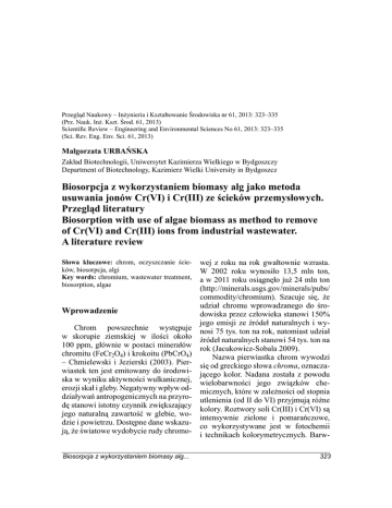 Przegląd Naukowy – Inżynieria i Kształtowanie Środowiska nr 61, 2013: 323–335 (Prz. Nauk. Inż. Kszt. Środ. 61, 2013) Scientific Review – Engineering and Environmental Sciences No 61, 2013: 323–335 (Sci. Rev. Eng. Env. Sci. 61, 2013) Małgorzata URBAŃSKA Zakład Biotechnologii, Uniwersytet Kazimierza Wielkiego w Bydgoszczy Department of Biotechnology, Kazimierz Wielki University in Bydgoszcz Biosorpcja z wykorzystaniem biomasy alg jako metoda usuwania jonów Cr(VI) i Cr(III) ze ścieków przemysłowych. Przegląd literatury Biosorption with use of algae biomass as method to remove of Cr(VI) and Cr(III) ions from industrial wastewater. A literature review Słowa kluczowe: chrom, oczyszczanie ścieków, biosorpcja, algi Key words: chromium, wastewater treatment, biosorption, algae Wprowadzenie Chrom powszechnie występuje w skorupie ziemskiej w ilości około 100 ppm, głównie w postaci minerałów chromitu (FeCr2O4) i krokoitu (PbCrO4) – Chmielewski i Jezierski (2003). Pierwiastek ten jest emitowany do środowiska w wyniku aktywności wulkanicznej, erozji skał i gleby. Negatywny wpływ oddziaływań antropogenicznych na przyrodę stanowi istotny czynnik zwiększający jego naturalną zawartość w glebie, wodzie i powietrzu. Dostępne dane wskazują, że światowe wydobycie rudy chromoBiosorpcja z wykorzystaniem biomasy alg... wej z roku na rok gwałtownie wzrasta. W 2002 roku wynosiło 13,5 mln ton, a w 2011 roku osiągnęło już 24 mln ton (http://minerals.usgs.gov/minerals/pubs/ commodity/chromium). Szacuje się, że udział chromu wprowadzanego do środowiska przez człowieka stanowi 150% jego emisji ze źródeł naturalnych i wynosi 75 tys. ton na rok, natomiast udział źródeł naturalnych stanowi 54 tys. ton na rok (Jacukowicz-Sobala 2009). Nazwa pierwiastka chrom wywodzi się od greckiego słowa chroma, oznaczającego kolor. Nadana została z powodu wielobarwności jego związków chemicznych, które w zależności od stopnia utlenienia (od II do VI) przyjmują różne kolory. Roztwory soli Cr(III) i Cr(VI) są intensywnie zielone i pomarańczowe, co wykorzystywane jest w fotochemii i technikach kolorymetrycznych. Barw323 ne związki chromu: PbCrO4·Pb(OH)2 (czerwień chromowa), PbCrO4 (żółcień chromowa), Cr2O3 (zieleń chromowa), stosuje się natomiast jako pigmenty do produkcji farb i lakierów (Barnhart 1997). Od stopnia utlenienia chromu, rozpuszczalności, czasu ekspozycji oraz drogi wprowadzenia do organizmu zależy działanie jego związków na organizmy żywe. W przyrodzie spotyka się głównie związki chromu na III i VI stopniu utlenienia, które mają znacząco różne działanie biologiczne. Chrom na III stopniu utlenienia jest zasadniczo pochodzenia naturalnego, natomiast na VI – antropogenicznego. Ten ostatni jest uznawany za silnie toksyczny i należy do I grupy czynników rakotwórczych według klasyfikacji IARC (The International Agency for Research on Cancer). Jego obecność w środowisku stanowi poważne zagrożenie ze względu na muta- i teratogenny charakter, w odróżnieniu od Cr(III), który dopiero w bardzo wysokich stężeniach jest toksyczny dla roślin i mało toksyczny lub nietoksyczny dla zwierząt (Costa 2003). Wśród pierwiastków śladowych występujących w przyrodzie chrom(III) jest uznawany za mikroelement niezbędny do prawidłowego funkcjonowania organizmu. Biologicznie aktywna trójwartościowa postać chromu uczestniczy w metabolizmie tłuszczów oraz wchodzi w skład tzw. czynnika tolerancji glukozy (Glucose Tolerance Factor – GFC), który ułatwia kontrolę poziomu cukru w organizmie. Według Amerykańskiej Rady Badań Naukowych (National Research Council – NRC) szacunkowa bezpieczna i odpowiednia dawka dzienna chromu(III) dla dorosłego człowieka w pożywieniu wynosi od 50 do 200 μg. Jego niedobór może mieć wpływ na roz324 wój cukrzycy, chorób układu krążenia oraz podwyższony poziom cholesterolu (Anderson 1997). Dwojaki charakter chromu przejawia się w tym, że odgrywa on zarówno rolę niezbędnego składnika pokarmowego, jak i wysoce toksycznego (kancerogennego) pierwiastka chemicznego. Ponadto chrom i inne metale ciężkie bardzo łatwo akumulują się w organizmach żywych, dlatego istniejące normy zaostrzają dopuszczalne ich stężenia w ściekach wprowadzanych do wód lub ziemi oraz w wodzie pitnej. Szkodliwy wpływ metali ciężkich oraz ich migracja i kumulacja w łańcuchu pokarmowym wymagają poszukiwania nowych proekologicznych oraz uzasadnionych ekonomicznie sposobów ich usuwania ze ścieków i wód. Oczyszczanie ścieków chromowych Szerokie zastosowanie i duża produkcja związków chromu powodują, że staje się on jednym z czynników zatruwających środowisko ściekami, pyłami oraz odpadami stałymi zawierającymi ten pierwiastek. Głównym źródłem zanieczyszczeń wód związkami chromu są ścieki generowane przez zakłady powierzchniowej obróbki metali, garbarnie, farbiarnie oraz przemysł chemiczny (Barnhart 1997). Czystsza produkcja jest obecnie najczęściej preferowaną strategią działań w zakresie ochrony środowiska (Piotrowski i Świetlik 2008). W celu zapewnienia równowagi między potrzebami społeczeństwa a środowiska, w którym ono funkcjonuje, przemysł musi stosować się do norm określających dopuszczalny poziom zawartości metali M. Urbańska ciężkich w wodzie i ściekach przemysłowych. Normatywy jakości wody ustalają organizacje ochrony środowiska, niektóre grupy państw, a także Światowa Organizacja Zdrowia (World Health Organization – WHO). Według wytycznych WHO (2003) zawartość chromu ogólnego i chromu sześciowartościowego w wodzie do picia nie może być większa niż 0,05 mg·l–1. Polska przyjmuje taką samą normę wyrażoną tylko dla chromu ogólnego, a określono ją w Rozporządzeniu Ministra Zdrowia z dnia 20 kwietnia 2010 r. zmieniające rozporządzenie w sprawie jakości wody przeznaczonej do spożycia przez ludz