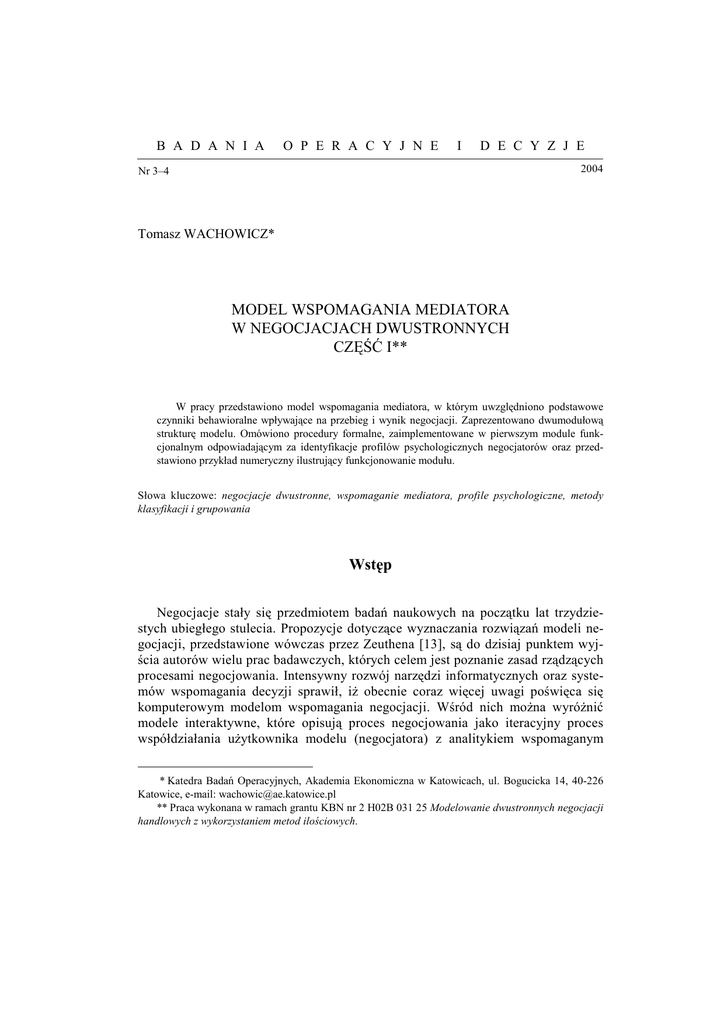 B A D A N I A O P E R A C Y J N E I D E C Y Z J E 2004 Nr 3–4 Tomasz WACHOWICZ* MODEL WSPOMAGANIA MEDIATORA W NEGOCJACJACH DWUSTRONNYCH CZĘŚĆ I** W pracy przedstawiono model wspomagania mediatora, w którym uwzględniono podstawowe czynniki behawioralne wpływające na przebieg i wynik negocjacji. Zaprezentowano dwumodułową strukturę modelu. Omówiono procedury formalne, zaimplementowane w pierwszym module funkcjonalnym odpowiadającym za identyfikacje profilów psychologicznych negocjatorów oraz przedstawiono przykład numeryczny ilustrujący funkcjonowanie modułu. Słowa kluczowe: negocjacje dwustronne, wspomaganie mediatora, profile psychologiczne, metody klasyfikacji i grupowania Wstęp Negocjacje stały się przedmiotem badań naukowych na początku lat trzydziestych ubiegłego stulecia. Propozycje dotyczące wyznaczania rozwiązań modeli negocjacji, przedstawione wówczas przez Zeuthena [13], są do dzisiaj punktem wyjścia autorów wielu prac badawczych, których celem jest poznanie zasad rządzących procesami negocjowania. Intensywny rozwój narzędzi informatycznych oraz systemów wspomagania decyzji sprawił, iż obecnie coraz więcej uwagi poświęca się komputerowym modelom wspomagania negocjacji. Wśród nich można wyróżnić modele interaktywne, które opisują proces negocjowania jako iteracyjny proces współdziałania użytkownika modelu (negocjatora) z analitykiem wspomaganym * Katedra Badań Operacyjnych, Akademia Ekonomiczna w Katowicach, ul. Bogucicka 14, 40-226 Katowice, e-mail: [email protected] ** Praca wykonana w ramach grantu KBN nr 2 H02B 031 25 Modelowanie dwustronnych negocjacji handlowych z wykorzystaniem metod ilościowych. 100 T. WACHOWICZ przez komputer (np. mediatorem). Modele te stają się zatem modelami wspomagania mediatora. Użytkownicy definiują na potrzeby modelu swoje cele, aspiracje oraz system oceny wyników. Informacje te nie są ujawniane partnerom, gdyż mogłoby to mieć wpływ na ich pozycję i siłę negocjacyjną. Dane może jednak wykorzystać mediator, który – posługując się modelem – będzie w stanie uzyskać informacje o postępie w negocjacjach oraz możliwościach osiągnięcia kompromisu. Model wspomagania mediatora może zatem opisywać sytuację negocjacyjną bardziej szczegółowo niż zwykły model wspomagania negocjacji. Modele komputerowe implementowane są w systemy wspomagania negocjacji i coraz częściej stosowane do rozwiązywania rzeczywistych konfliktów. Niektóre systemy wykorzystywane były w projektach międzynarodowych, jak na przykład system RAINS [3], który zastosowano w negocjacjach między krajami europejskimi dotyczących redukcji emisji zanieczyszczeń do atmosfery oraz system wspomagający negocjacje dotyczące Prawa Morskiego [11]. Dalsze badania nad rozwojem komputerowych modeli wspomagania negocjacji wydają się zatem potrzebne i ważne. W niniejszej pracy zaproponowano model wspomagania mediatora w negocjacjach dwustronnych. W konstrukcji modelu wykorzystano postulaty psychologii negocjowania odnoszące się do czynników determinujących przebieg i wynik negocjacji. Za główne czynniki uznaje się bowiem: cechy osobowe negocjatorów (określające ich profile psychologiczne) [1, 6, 12], wykorzystywane przez nich strategie negocjowania [8, 9] oraz kontekst negocjacji [10]. Korzystając z modelu, mediator będzie mógł zatem, dla zadanego kontekstu negocjacji, wyznaczyć najkorzystniejsze strategie negocjowania obydwu negocjatorów o oznaczonych profilach psychologicznych, które doprowadzą ich do satysfakcjonującego kompromisu. Struktura proponowanego modelu jest dwuczłonowa: w pierwszym module następuje identyfikacja profilów psychologicznych stron zasiadających do negocjacji, w module drugim wyznaczane są ich najkorzystniejsze strategie negocjowania. W konstrukcji modelu pomocne są wybrane metody teorii gier kooperacyjnych, statystycznej analizy wielowymiarowej oraz wieloatrybutowa dominacja stochastyczna. Omówienie całego modelu wymaga podzielenia prezentowanego materiału na dwie części. W części pierwszej zostaną przedstawione aspekty behawioralne negocjacji, ogólna koncepcja modelu oraz jego pierwszy moduł funkcjonalny. Zaprezentowany zostanie również przykład numeryczny identyfikacji profilów na podstawie danych empirycznych pochodzących z eksperymentów negocjacyjnych przeprowadzonych z wykorzystaniem systemu wspomagania negocjacji Inspire [5]. W części drugiej omówony zostanie drugi moduł funkcjonalny modelu, odpowiadający za wyznaczanie najkorzystniejszych strategii negocjowania obydwu negocjatorów oraz przykład jego wykorzystania bazujący na danych empirycznych systemu Inspire. Model wspomagania mediatora ... 101 1. Behawioralne aspekty negocjowania Głównym celem opisu negocjacji, prowadzonego pod kątem aspektów behawioralnych, jest identyfikacja czynników wpływających na przebieg i wynik procesu negocjowania. Podsumowując rezultaty ostatnich badań, można wyróżnić trzy główne determinanty wyników negocjacji: cechy indywidualne negocjatorów, wykorzystywane strategie i taktyki negocjowania oraz kontekst negocjacji [1, 6, 8, 9, 10, 12]. Indywidualne cechy negocjatorów stanowią o sposobie postrzegania problemu i partnera. Decydują również o tym, jak sam negocjator będzie postrzegany przez partnera. Ponadto składają się one pośrednio na osobiste umiejętności i predyspozycje do rozwiązywania sytuacji konfliktowej [1, 6]. Wyróżnia się dwie grupy tych cech [12]: rozpoznawalne charakterystyki demograficzne oraz informacyjne charakterystyki demograficzne. Rozpoznawalne charakterystyki demograficzne są cechami negocjatora, opisującymi jego sylwetkę. Są to cechy łatwo zauważalne przez innych już podczas pierwszego kontaktu z negocjatorem i wykorzystywane w celach klasyfikacyjnych. Należą do nich na przykład rasa, środowisko etniczne, narodowość, płeć i wiek. Informacyjne charakterystyki demograficz