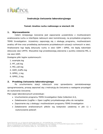 Instrukcja ćwiczenia laboratoryjnego Temat: Analiza ruchu radiowego w sieciach 2G 1. Wprowadzenie Celem niniejszego ćwiczenia jest zapoznanie uczestników z możliwościami analizowania ruchu w interfejsie radiowym sieci komórkowej, na przykładzie programu TEMS Investigation. Uczestnicy zapoznają się z obsługą programu, możliwościami analizy off-line oraz prześledzą zachowanie przykładowych sytuacji ruchowych w sieci. Analizowane logi będą dotyczyły ruchu w sieci GSM i GPRS, nie będą natomiast dotyczyły sieci UMTS. Wszystkie logi przedstawiają zdarzenia z punktu widzenia MS, a nie sieci GSM. Dostępne pliki logów systemowych: 1. example.log 2. MT_call.log 3. MO_call.log 4. GSM_traffic.log 5. GPRS_1.log 6. GPRS_2.log 2. Przebieg ćwiczenia laboratoryjnego Po uruchomieniu stacji roboczych oraz sprawdzeniu zainstalowanego oprogramowania, proszę zapoznać się z instrukcją do ćwiczenia a następnie przystąpić do wykonania ćwiczenia. Plan zajęć laboratoryjnych przewiduje: Uruchomienie programu TEMS Investigation Data Collection 6.0, Załadowanie (Logfile-> Open Logfile) przykładowego pliku do narzędzia Zapoznanie się z obsługą i możliwościami programu TEMS Investigation Załadowanie analizowanych plików wg kolejności ustalonej w pkt 1) i wykonywanie poleceń Ericpol Telecom Sp. z o.o., ul. Targowa 9A, 90-042 Łódź, Polska, Tel.: +48 42 6642500, Faks: +48 42 6642555 NIP: 727-012-56-20, REGON: 470541772, KRS: 0000002804 Sąd Rejonowy dla Łodzi-Śródmieścia, XX Wydział KRS, Kapitał zakładowy: 500 000 PLN Oddział: ul. Madalińskiego 9, 30-303 Kraków, Polska, Tel.: +48 12 2954600, Faks: +48 12 2954666 Biuro: ul. Chałubińskiego 8, 00-613 Warszawa, Polska, Tel.: +48 22 6243561, Faks: +48 22 6243561 1 (4) 2/EPOL/GEN/DI-08:001 UPL A Załadowanie kolejnego pliku z logiem systemowym, aż do wyczerpania listy plików Analiza otrzymanych wyników i dyskusja związana z wnioskami po wykonanym ćwiczeniu. Zadanie uznaje się za zaliczone, jeśli co najmniej 50% plików została przeanalizowana i co najmniej 75% zadań na każdym logu zostało wykonane. 3. Zadania ćwiczeniowe 3.1. Zadanie 1 Plik: example.log Opis: przykładowy plik służący do zapoznania się z programem TEMS Investigation. Po uruchomieniu programu pojawia się okienkowy pulpit roboczy z kilkoma obszarami. Górna belka to standardowe menu poleceń i skróty graficzne. Lewa strona ukazuje możliwe okienka do analizy ruchu (Presentation), przesyłania poleceń sterujących do telefonu (Control) oraz konfigurowanie środowiska pracy TEMS Investigation (Configuration). W ćwiczeniach będziemy korzystali tylko z pierwszego zbioru okienek. W dolnej części znajdują się zakładki pokazujące różne obszary robocze i różne zagadnienia analizy (np. Data / Signalling / Map). W centralnej części znajduje się miejsce dla wielu okienek wyświetlających konkretne dane na temat sytuacji w kanale radiowym, np. odbierane sygnały radiowe, ich moc i częstotliwość, czy też lista wszystkich wiadomości sygnalizacyjnych. Podstawowe działanie programu (w trybie off-line) polega na załadowaniu logu systemowego oraz jego „odtworzeniu” (Play). Reszta zależy od potrzeb analizy i polega na oglądaniu wartości, parametrów, wiadomości i ich zawartości. Chcąc obejrzeć szczegóły wiadomości, należy dwukrotnie kliknąć na wybranej wiadomości. Wybranie danej chwili czasowej (na osi czasu poziomo) czy też wiadomości sygnalizacyjnej, jest automatycznie przekazywane do wszystkich innych okienek analizy, np. oglądając wiadomości Paging Request, automatycznie przesuwa się chwila czasowa w Line Chart GSM (lub Dual Mode) czy zmieniają się parametry mocy odbieranego sygnału. Pytania: Jak obejrzeć siłę odbieranego sygnału Jak zobaczyć wszystkie dostępne sygnały w okolicy Jak obserwować sekwencję następujących po sobie wiadomości i jakie dane przesyłane są w poszczególnych wiadomościach Ericpol Telecom Sp. z o.o., ul. Targowa 9A, 90-042 Łódź, Polska, Tel.: +48 42 6642500, Faks: +48 42 6642555 NIP: 727-012-56-20, REGON: 470541772, KRS: 0000002804 Sąd Rejonowy dla Łodzi-Śródmieścia, XX Wydział KRS, Kapitał zakładowy: 500 000 PLN Oddział: ul. Madalińskiego 9, 30-303 Kraków, Polska, Tel.: +48 12 2954600, Faks: +48 12 2954666 Biuro: ul. Chałubińskiego 8, 00-613 Warszawa, Polska, Tel.: +48 22 6243561, Faks: +48 22 6243561 2 (4) 2/EPOL/GEN/DI-08:001 UPL A Co oznaczają piktogramy znajdujące się na wykresach Line Chart lub Events Wiadomości z jakich warstw i protokołów można analizować? Jakie są parametry wiadomości Synch Chanel Information? Co to jest i na czym polega zdarzenie „Cell Reselection”? Podaj przykłady i wartości związane z tym(i) zdarzeniem. UWAGA: Zakładki Map / Scanner / Ctrl & Config – są zbyteczne do wykonania ćwiczenia i mogą być oglądane opcjonalnie. Po zakończonym zadaniu 1, należy zamknąć okienka: Zakładka Overview: Line Chart WCDMA + GSM Neighbours Zakładka Data: WCDMA Data Line Chart + Radio Parameters WCDMA + Data Reports 3.2. Zadanie 2 Plik: MT_call.log Opis: Proszę otworzyć nowe okienka do analizy: GPRS Status i Radio Parameters. Następnie proszę otworzyć zakładkę Overview a następnie uruchomić analizę logu (Play, F10) Pytania: Jakie są dostępne kanały radiowe w każdej komórce? Z jakich zakresów częstotliwości dostępne są kanały radiowe w poszczególnych komórkach? Ile jest niezależnych prób połączeń telefonicznych? Jak rozpoznać czy wszystkie próby zestawienia połączenia pochodzą z tego samego telefonu? Obejrzyj wiadomości Paging Request Type 1 (wiele). Jaki jest kierunek zestawienia połączenia? Czy wszystkie pagingi przeznaczone są do tego samego telefonu? Na podstawie czego następuje identyfikacja użytkownika wywoływanego. Podaj min dwie wartości. Jaki jest procent wykorzystania kanałów radiowych (RLC Throughput) dla pierwszych dwóch połączeń? Ile czasu upływa mi