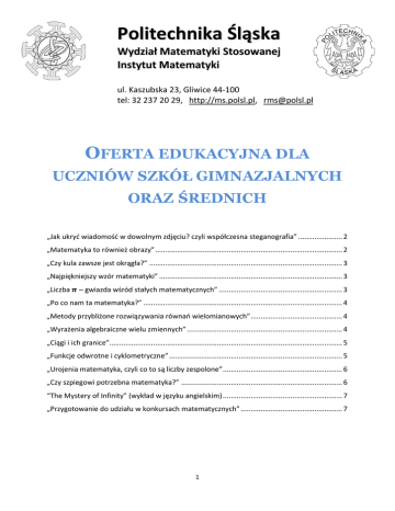 Politechnika Śląska Wydział Matematyki Stosowanej Instytut Matematyki ul. Kaszubska 23, Gliwice 44-100 tel: 32 237 20 29, http://ms.polsl.pl, [email protected] OFERTA EDUKACYJNA DLA UCZNIÓW SZKÓŁ GIMNAZJALNYCH ORAZ ŚREDNICH „Jak ukryd wiadomośd w dowolnym zdjęciu? czyli współczesna steganografia” ...................... 2 „Matematyka to również obrazy” .............................................................................................. 2 „Czy kula zawsze jest okrągła?” ................................................................................................. 3 „Najpiękniejszy wzór matematyki” ............................................................................................ 3 „Liczba – gwiazda wśród stałych matematycznych” .............................................................. 3 „Po co nam ta matematyka?” .................................................................................................... 4 „Metody przybliżone rozwiązywania równao wielomianowych” .............................................. 4 „Wyrażenia algebraiczne wielu zmiennych” .............................................................................. 4 „Ciągi i ich granice”..................................................................................................................... 5 „Funkcje odwrotne i cyklometryczne” ....................................................................................... 5 „Urojenia matematyka, czyli co to są liczby zespolone” ............................................................ 6 „Czy szpiegowi potrzebna matematyka?” ................................................................................. 6 “The Mystery of Infinity” (wykład w języku angielskim) ............................................................ 7 „Przygotowanie do udziału w konkursach matematycznych” ................................................... 7 1 Politechnika Śląska Wydział Matematyki Stosowanej Instytut Matematyki ul. Kaszubska 23, Gliwice 44-100 tel: 32 237 20 29, http://ms.polsl.pl, [email protected] „Jak ukryć wiadomość w dowolnym zdjęciu? czyli współczesna steganografia” Autor: dr inż. Marek Żabka Czym jest steganografia oraz jakie metody tradycyjne obejmuje, w jaki sposób zapisuje się kolor w zdjęciu, wreszcie w jaki sposób można ukryd w nim informacje. Metoda: pokaz slajdów oraz pokaz praktyczny programu (warsztaty) Czas trwania zajęd: 1-2 godz. Liczba uczestników: ok. 30 osób „Matematyka to również obrazy” Autor: dr inż. Mariusz Pleszczyoski Na zajęciach słuchacze dowiedzą się, że obraz (w ujęciu informatycznym) jest pewnym obiektem matematycznym, a w związku z tym pewne operacje na tym obiekcie będą przekształcad obraz zgodnie z życzeniem przekształcającego. Metoda: wykład interaktywny z pokazem slajdów Czas trwania zajęd: 45 min Liczba uczestników: ok. 30 osób 2 Politechnika Śląska Wydział Matematyki Stosowanej Instytut Matematyki ul. Kaszubska 23, Gliwice 44-100 tel: 32 237 20 29, http://ms.polsl.pl, [email protected] „Czy kula zawsze jest okrągła?” Autor: dr Iwona Nowak, dr Ewa Łobos Wykład ma na celu zaprezentowanie metryk nieeuklidesowych. Po wprowadzeniu formalnych definicji metryki i kuli (dostosowanych do poziomu uczniów szkoły średniej) pokazujemy jak wyglądają kule w różnych przestrzeniach metrycznych. Metoda: wykład interaktywny ilustrowany slajdami, Liczba uczestników: do 60 osób, Czas trwania: 60 min „Najpiękniejszy wzór matematyki” Autor: dr Iwona Nowak Wykład opowiada o równaniu wiążącym ze sobą pięd ważnych stałych matematycznych, równocześnie krótko o nich opowiadając. Uczniowie dowiadują się o istnieniu jednostki urojonej oraz liczby Eulera. Metoda: wykład interaktywny ilustrowany slajdami, Liczba uczestników: do 60 osób, Czas trwania: 60 min „Liczba – gwiazda wśród stałych matematycznych” Autor: dr Iwona Nowak Wykład opowiada o liczbie , o tym jak długo jest znana ludzkości, skąd wzięło się jej oznaczenie i dlaczego nazywamy ją ludolfiną. Podczas spotkania pokazujemy jej miejsce w popkulturze i rozwiązujemy rebusy. Metoda: wykład interaktywny ilustrowany slajdami, Liczba uczestników: do 60 osób, Czas trwania: 60 min 3 Politechnika Śląska Wydział Matematyki Stosowanej Instytut Matematyki ul. Kaszubska 23, Gliwice 44-100 tel: 32 237 20 29, http://ms.polsl.pl, [email protected] „Po co nam ta matematyka?” Autor: dr Iwona Nowak Wykład powstał kilka lat temu na prośbę nauczycieli jednego z techników i miał na celu przekonanie młodzieży do celowości uczenia się i zdawania matematyki na maturze. Pokazuje (bez wchodzenia w szczegóły) gdzie „pracują” metody matematyczne i kiedy, często nieświadomie korzystamy z wiedzy matematycznej. Metoda: wykład interaktywny ilustrowany slajdami. Liczba uczestników: do 60 osób, Czas trwania: 60 min „Metody przybliżone rozwiązywania równań wielomianowych” Autor: dr Iwona Nowak Wykład omawia jedno z zagadnieo należącego do grupy tematów rozszerzających materiał matematyki w maturalnych klasach szkoły średniej. Metoda: wykład interaktywny ilustrowany slajdami, Liczba uczestników: do 30 osób, Czas trwania: 60 min „Wyrażenia algebraiczne wielu zmiennych” Autor: dr Iwona Nowak Wykład omawia jedno z zagadnieo należącego do grupy tematów rozszerzających materiał matematyki w maturalnych klasach szkoły średniej. Metoda: wykład interaktywny ilustrowany slajdami, Liczba uczestników: do 30 osób, Czas trwania: 60 min 4 Politechnika Śląska Wydział Matematyki Stosowanej Instytut Matematyki ul. Kaszubska 23, Gliwice 44-100 tel: 32 237 20 29, http://ms.polsl.pl, [email protected] „Ciągi i ich granice” Autor: dr Katarzyna Adrianowicz Wykład ma na celu wprowadzenie uczniów do zagadnieo związanych z ciągami i ich granicami. Podana zostanie de