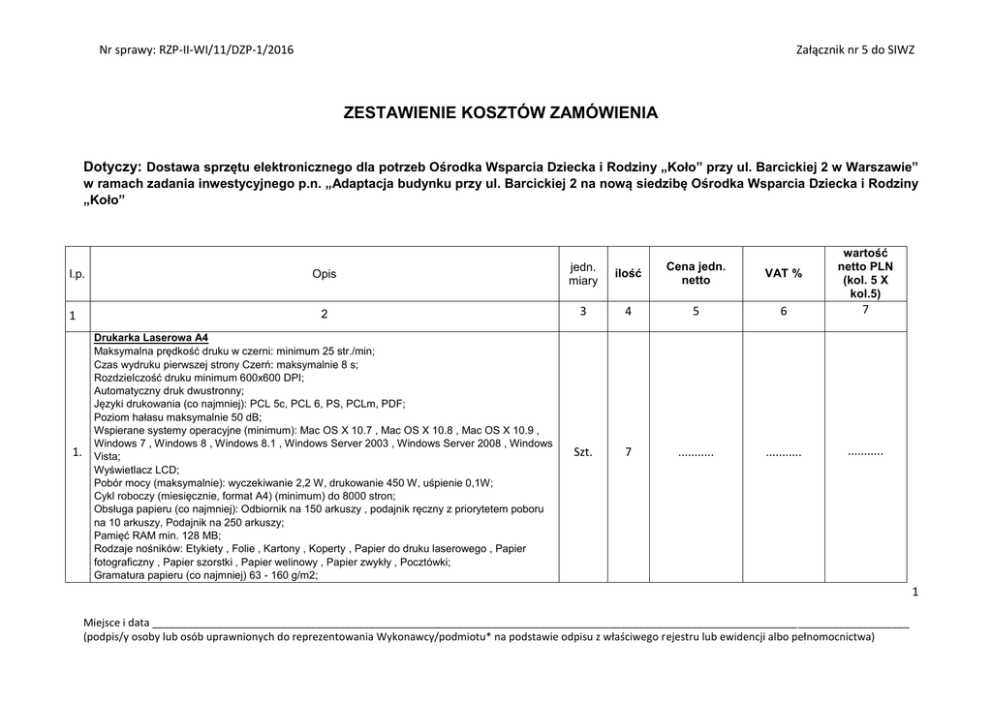 Nr sprawy: RZP-II-WI/11/DZP-1/2016 Załącznik nr 5 do SIWZ ZESTAWIENIE KOSZTÓW ZAMÓWIENIA Dotyczy: Dostawa sprzętu elektronicznego dla potrzeb Ośrodka Wsparcia Dziecka i Rodziny „Koło” przy ul. Barcickiej 2 w Warszawie” w ramach zadania inwestycyjnego p.n. „Adaptacja budynku przy ul. Barcickiej 2 na nową siedzibę Ośrodka Wsparcia Dziecka i Rodziny „Koło” l.p. 1 1. ilość Cena jedn. netto VAT % wartość netto PLN (kol. 5 X kol.5) 3 4 5 6 7 Szt. 7 ........... ........... ........... Opis jedn. miary 2 Drukarka Laserowa A4 Maksymalna prędkość druku w czerni: minimum 25 str./min; Czas wydruku pierwszej strony Czerń: maksymalnie 8 s; Rozdzielczość druku minimum 600x600 DPI; Automatyczny druk dwustronny; Języki drukowania (co najmniej): PCL 5c, PCL 6, PS, PCLm, PDF; Poziom hałasu maksymalnie 50 dB; Wspierane systemy operacyjne (minimum): Mac OS X 10.7 , Mac OS X 10.8 , Mac OS X 10.9 , Windows 7 , Windows 8 , Windows 8.1 , Windows Server 2003 , Windows Server 2008 , Windows Vista; Wyświetlacz LCD; Pobór mocy (maksymalnie): wyczekiwanie 2,2 W, drukowanie 450 W, uśpienie 0,1W; Cykl roboczy (miesięcznie, format A4) (minimum) do 8000 stron; Obsługa papieru (co najmniej): Odbiornik na 150 arkuszy , podajnik ręczny z priorytetem poboru na 10 arkuszy, Podajnik na 250 arkuszy; Pamięć RAM min. 128 MB; Rodzaje nośników: Etykiety , Folie , Kartony , Koperty , Papier do druku laserowego , Papier fotograficzny , Papier szorstki , Papier welinowy , Papier zwykły , Pocztówki; Gramatura papieru (co najmniej) 63 - 160 g/m2; 1 Miejsce i data _________________________________________________________________________________________________________________________________ (podpis/y osoby lub osób uprawnionych do reprezentowania Wykonawcy/podmiotu* na podstawie odpisu z właściwego rejestru lub ewidencji albo pełnomocnictwa) Nr sprawy: RZP-II-WI/11/DZP-1/2016 Załącznik nr 5 do SIWZ Złącza (co najmniej): Interfejs RJ-45 (10/100) , USB 2.0 , Wi-Fi IEEE 802.11b/g/n, Drukowanie z urządzeń mobilnych – co najmniej: AirPrint, ePrint; 2. 3. Komputer stacjonarny Preinstalowany system operacyjny Windows 7 Professional (downgrade), licencja Windows 8 Pro Wersja językowa polska Procesor: uzyskujący w testach cpubenchmark.net średni wynik min. 5150 pkt. Pamięć RAM min. 16 GB (rozbudowywalna do min. 32GB), pracująca w trybie dwukanałowym z maksymalną częstotliwością obsługiwaną przez procesor Dysk twardy hybrydowy (magnetyczno-półprzewodnikowy) poj. min. 500 GB, głośność: maks. 30 db Karta graficzna uzyskująca w testach videobenchmark.net średni wynik min. 3684 pkt. Napęd optyczny DVD Karta dźwiękowa 5.1 Wyjścia / wejścia Liczba wyjść DisplayPort 1 Wyjście VGA Wyjście DVI Liczba złączy USB min. 6, w tym Liczba złączy USB 3.0 min. 2 Wejście do mikrofonu Wejście liniowe audio Wyjście liniowe audio Karta sieciowa 10/100/1000 Mbit/s Czytnik kart pamięci Typ obudowy Small Form Factor lub Slim Desktop, z możliwością postawienia w pionie. Kolor czarny lub czarno-srebrny Zasilacz: Aktywne PFC, głośność ≤ 25 dB Szt. Telewizor LED Przekątna ekranu – 48 cal Przekątna ekranu – 121 cm Rozdzielczość ekranu – 3840 x 2160 Format – 4K (Ultra HD) Optymalizacja obrazu – adaptacyjne podświetlenie matrycy Funkcje obrazu – PIP Ilość głośników – 2 głośniki szt. 4 ........... ........... ........... 3 ........... ........... ........... 2 Miejsce i data _________________________________________________________________________________________________________________________________ (podpis/y osoby lub osób uprawnionych do reprezentowania Wykonawcy/podmiotu* na podstawie odpisu z właściwego rejestru lub ewidencji albo pełnomocnictwa) Nr sprawy: RZP-II-WI/11/DZP-1/2016 Załącznik nr 5 do SIWZ Moc łączna głośników – 20 W Funkcje dźwięku – Tryb film , Tryb dynamiczny , Tryb standardowy Tuner cyfrowy – DVB-C , DVB-T (MPEG-4) Odtwarzanie plików multimedialnych Smart TV Funkcje Smart TV Przeglądarka internetowa , Twitter , YouTube , Facebook Nagrywanie na USB Zastosowane technologie – DTS Premium Sound 5.1 , DTS Studio Sound Automatyczne wyłączenie Menu w języku polskim , Menu wyświetlane na ekranie (OSD) Ilość złącz HDMI: min. 4 Ilość złącz USB: min. 3 Wyjście cyfrowe audio – Optyczne Złącze Common Interface – CI Komunikacja sieciowa: Ethernet-LAN RJ-45, WiFi Pozostałe wejścia/wyjścia – Komponentowe , Kompozytowe , MHL , 1 x antenowe Montaż ścienny , Podstawa, Montaż ścienny - VESA. Urządzenie dostarczone z odpowiednim uchwytem ściennym z możliwością regulacji zainstalowanego telewizora w pionie +15°/-20° Klasa energetyczna – A+ 4. Projektor System projekcji DLP ; Rozdzielczość rzeczywista min. 1080p (1920 x 1080); Jasność min. 2000 ANSI Lumenów; Współczynnik kontrastu min. 10000:1; Wyświetlane kolory 1.07 mld kolorów; Obiektyw (co najmniej) F=2.59-2.87, f=16.88-21.88mm; Format obrazu16:9 Współczynnik projekcji (co najmniej) (przekątna @ odległość)1.15-1.5 (79"@2M); Rozmiar obrazu (przekątna) (co najmniej) 40"-235"; Czas pracy lampy (Normalny/Tryb oszczędny/Tryb SmartEco) minimum *3500/5000/6000 godzin; Regulacja zniekształcenia trapezowego1D, Vertical (Pionowy)(co najmniej) ± 20 stopni; Przesunięcie projekcji Vertical (Pionowa) (co najmniej) 110%-130%±5%; Obsługiwana rozdzielczość do WUXGA; Kompatybilność HDTV480i, 480p, 576i, 567p, 720p, 1080i, 1080p; Kompatybilność video NTSC, PAL, SECAM; ........... szt. 1 ........... ........... 3 Miejsce i data _________________________________________________________________________________________________________________________________ (podpis/y osoby lub osób uprawnionych do reprezentowania Wykonawcy/podmiotu* na podstawie odpisu z właściwego rejestru lub ewidencji albo pełnomocnictwa) Nr sprawy: RZP-II-WI/11/DZP-1/2016 Załącznik nr 5 do SIWZ Słyszalny szum maksymalnie 33/30 dBA (Tryb Normalny/ Tryb