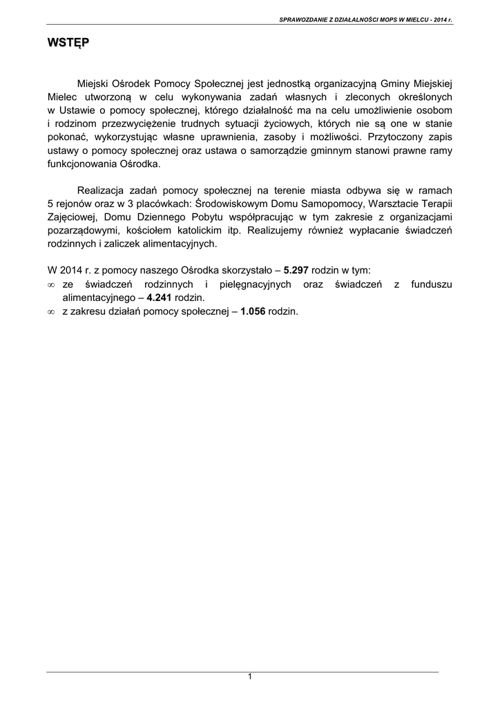 SPRAWOZDANIE Z DZIAŁALNOŚCI MOPS W MIELCU - 2014 r. WSTĘP Miejski Ośrodek Pomocy Społecznej jest jednostką organizacyjną Gminy Miejskiej Mielec utworzoną w celu wykonywania zadań własnych i zleconych określonych w Ustawie o pomocy społecznej, którego działalność ma na celu umożliwienie osobom i rodzinom przezwyciężenie trudnych sytuacji życiowych, których nie są one w stanie pokonać, wykorzystując własne uprawnienia, zasoby i możliwości. Przytoczony zapis ustawy o pomocy społecznej oraz ustawa o samorządzie gminnym stanowi prawne ramy funkcjonowania Ośrodka. Realizacja zadań pomocy społecznej na terenie miasta odbywa się w ramach 5 rejonów oraz w 3 placówkach: Środowiskowym Domu Samopomocy, Warsztacie Terapii Zajęciowej, Domu Dziennego Pobytu współpracując w tym zakresie z organizacjami pozarządowymi, kościołem katolickim itp. Realizujemy również wypłacanie świadczeń rodzinnych i zaliczek alimentacyjnych. W 2014 r. z pomocy naszego Ośrodka skorzystało – 5.297 rodzin w tym: • ze świadczeń rodzinnych i pielęgnacyjnych oraz świadczeń alimentacyjnego – 4.241 rodzin. • z zakresu działań pomocy społecznej – 1.056 rodzin. 1 z funduszu SPRAWOZDANIE Z DZIAŁALNOŚCI MOPS W MIELCU - 2014 r. I. KRYTERIA DOCHODOWE ORAZ PRZEDZIAŁY DOCHODOWE RODZIN KORZYSTAJĄCYCH Z POMOCY MOPS W OPARCIU O USTAWĘ O POMOCY SPOŁECZNEJ W omawianym okresie sprawozdawczym pomocą zostały objęte osoby i rodziny, które spełniały następujące kryteria dochodowe: 1) dochód na osobę samotnie gospodarującą nie przekraczał od 01 października 2012 r. 542,– zł. 2) osobie w rodzinie, w której dochód na osobę nie przekraczał od 01 października 2012 r. 456,– zł. zwanej dalej, kryterium dochodowym na osobę w rodzinie, przy jednoczesnym występowaniu co najmniej jednego powodu wymienionego w art. 7 ustawy o pomocy społecznej. W oparciu o te kryteria Ośrodek wydał decyzje administracyjne przyznające świadczenie dla 1.182 osób i objął pomocą w różnych formach 1.056 gospodarstw domowych /o50 więcej aniżeli w 2013roku/, w których zamieszkiwało 2.497osób. Łącznie przeprowadzono 3.193 wywiadów środowiskowych i załatwiono 10.192 spraw bieżących. Tab.1 Przedziały dochodowe rodzin korzystających z pomocy społecznej w 2014 r. Dochód w zł na jedną osobę w gosp. domowym Liczba rodzin Brak dochodu 1 – 100 zł 101 – 200 zł 201 – 300 zł 301 – 542 zł powyżej 542 zł 135 37 68 72 268 476 Struktura rodzin korzystających z pomocy w 2014 r. 32% 49% 9% rodziny z dziećmi rodziny niepełne emeryci i renciści pozostałe 10% W porównaniu do 2013 roku zwiększyła się liczba osób samotnych/pozostałe/ o 12%. 2 SPRAWOZDANIE Z DZIAŁALNOŚCI MOPS W MIELCU - 2014 r. II. POWODY PRZYZNANIA POMOCY PRZEZ MOPS Tab.2 Powody przyznania pomocy. Powód trudnej sytuacji życiowej Lp. Liczba rodzin 2014 r. 1. Bezdomność 22 2. Potrzeba ochrony macierzyństwa 32 3. Bezrobocie 385 4. Niepełnosprawność 289 5. 250 7. Długotrwała choroba Bezradność w sprawach opiekuńczowychowawczych i prowadzeniu gospodarstwa domowego w tym rodzina niepełna w tym rodziny wielodzietne Alkoholizm 8. Narkomania 6. 91 60 24 33* 1 * Wg statystyki pracowników socjalnych wśród wszystkich rodzin objętych pomocą w 176 rodzinach występuje problem alkoholowy. W wielu rodzinach pomoc przekazywana jest często na osobę, która gwarantuje efektywne wykorzystanie środków pieniężnych i często też jest to inny powód przyznania pomocy. Przeprowadzona analiza przesłanek obiektywnych przyznania pomocy przez MOPS wskazuje, że głównym powodem trudnej sytuacji życiowej jest bezrobocie, długotrwała choroba, niepełnosprawność oraz bezradność w sprawach opiekuńczo-wychowawczych i prowadzeniu gospodarstwa domowego zwłaszcza w rodzinach niepełnych i wielodzietnych. III. OGÓLNA CHARAKTERYSTYKA OSÓB, KTÓRYM PRZYZNANO DECYZJĄ ŚWIADCZENIE Z POMOCY SPOŁECZNEJ Tab.3 Podział wg płci. Płeć Ogółem Kobiety Mężczyźni Ogółem 593 589 1.182 w tym osoby prowadzące samodzielnie gospodarstwo domowe 152 304 456 3 SPRAWOZDANIE Z DZIAŁALNOŚCI MOPS W MIELCU - 2014 r. Tab.4 Formy udzielonej pomocy. Forma świadczeń Rzeczywista liczba osób, którym przyznano decyzją świadczenie Liczba rodzin Liczba osób w rodzinach Świadczenia przyznane w ramach zadań własnych 1.147 611 1.463 Świadczenia przyznane w ramach zadań zleconych 35 34 104 Świadczenia przyznane w ramach zadań własnych i zleconych 1.182 645 1.567 - 1.005 2.356 - 411 930 Pomoc udzielona w postaci pracy socjalnej-ogólnej W tym wyłącznie z pracy socjalnej Tab.5 Stan cywilny. Stan cywilny Liczba kobiet Liczba mężczyzn Razem Stan wolny 282 351 633 w tym konkubinat 3 7 10 mężatka /żonaty 185 125 310 pozostająca lub pozostający w separacji 3 6 9 rozwódka /rozwiedziony 69 79 148 wdowa /wdowiec 51 21 72 I V. REALIZACJA ZADAŃ WŁASNYCH GMINY Z ZAKRESU POMOCY SPOŁECZNEJ 1. Do zadań własnych gminy o charakterze obowiązkowym należy: 1) opracowanie i realizacja gminnej strategii rozwiązywania problemów społecznych ze szczególnym uwzględnieniem programów pomocy społecznej, profilaktyki i rozwiązywania problemów alkoholowych i innych, których celem jest integracja osób i rodzin z grup szczególnego ryzyka; 2) sporządzanie, zgodnie z art. 16a, oceny zasobów w zakresie pomocy społecznej; 3) udzielanie schronienia, zapewnienie posiłku oraz niezbędnego ubrania osobom tego pozbawionym; 4) przyznawanie i wypłacanie zasiłków okresowych; 4 SPRAWOZDANIE Z DZIAŁALNOŚCI MOPS W MIELCU - 2014 r. 5) 6) 7) 8) 9) 10) 11) 12) 13) 14) 15) 16) 17) 18) 19) 20) przyznawanie i wypłacanie zasiłków celowych; przyznawanie i wypłacanie zasiłków celowych na pokrycie wydatków powstałych w wyniku zdarzenia losowego; przyznawanie i wypłacanie zasiłków celowych na pokrycie wydatków na świadczenia zdrowotne osobom bezdomnym oraz innym osobom nie mającym dochodu i możliwośc