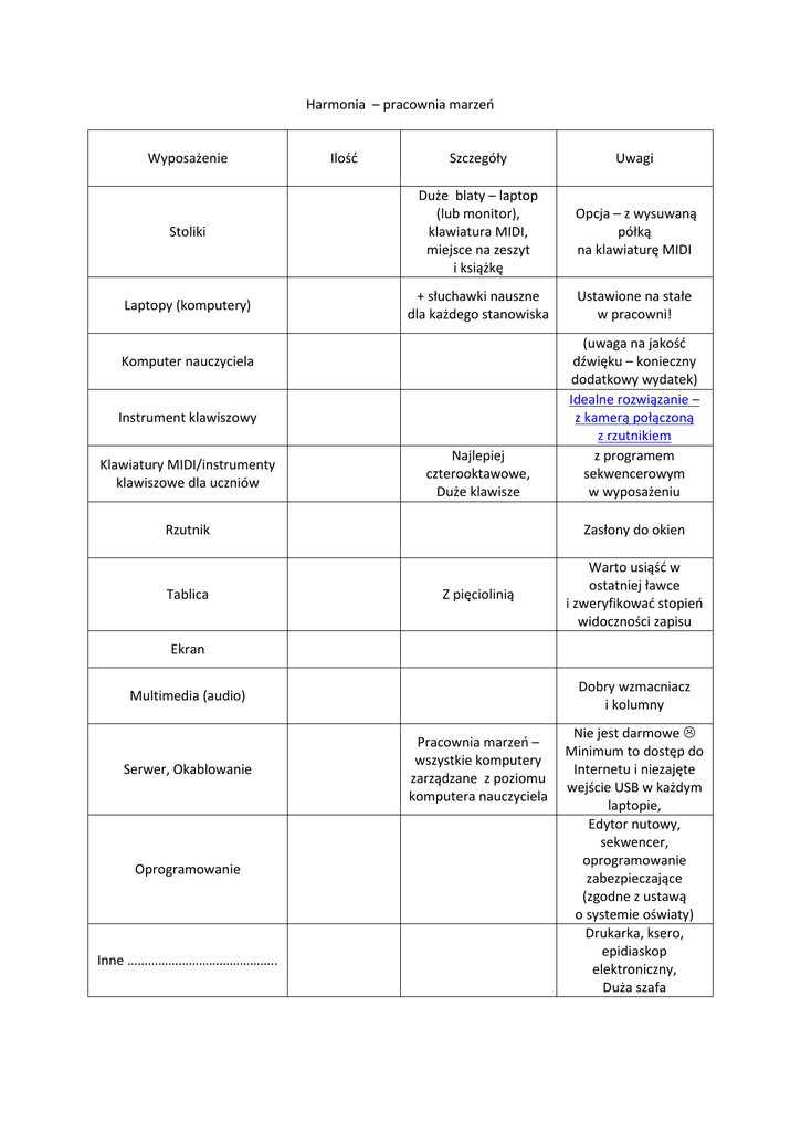 Harmonia – pracownia marzeń Wyposażenie Ilość Szczegóły Uwagi Stoliki Duże blaty – laptop (lub monitor), klawiatura MIDI, miejsce na zeszyt i książkę Opcja – z wysuwaną półką na klawiaturę MIDI Laptopy (komputery) + słuchawki nauszne dla każdego stanowiska Ustawione na stałe w pracowni! Najlepiej czterooktawowe, Duże klawisze (uwaga na jakość dźwięku – konieczny dodatkowy wydatek) Idealne rozwiązanie – z kamerą połączoną z rzutnikiem z programem sekwencerowym w wyposażeniu Komputer nauczyciela Instrument klawiszowy Klawiatury MIDI/instrumenty klawiszowe dla uczniów Rzutnik Zasłony do okien Tablica Warto usiąść w ostatniej ławce i zweryfikować stopień widoczności zapisu Z pięciolinią Ekran Dobry wzmacniacz i kolumny Multimedia (audio) Serwer, Okablowanie Oprogramowanie Inne …………………………………….. Pracownia marzeń – wszystkie komputery zarządzane z poziomu komputera nauczyciela Nie jest darmowe Minimum to dostęp do Internetu i niezajęte wejście USB w każdym laptopie, Edytor nutowy, sekwencer, oprogramowanie zabezpieczające (zgodne z ustawą o systemie oświaty) Drukarka, ksero, epidiaskop elektroniczny, Duża szafa