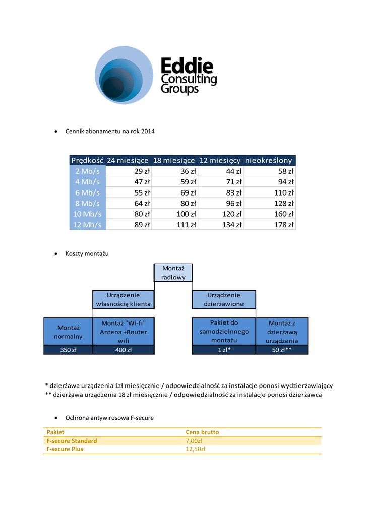 Cennik abonamentu na rok 2014 Prędkość 24 miesiące 18 miesiące 12 miesięcy nieokreślony 2 Mb/s 29 zł 36 zł 44 zł 58 zł 4 Mb/s 47 zł 59 zł 71 zł 94 zł 6 Mb/s 55 zł 69 zł 83 zł 110 zł 8 Mb/s 64 zł 80 zł 96 zł 128 zł 10 Mb/s 80 zł 100 zł 120 zł 160 zł 12 Mb/s 89 zł 111 zł 134 zł 178 zł Koszty montażu Montaż radiowy Urządzenie własnością klienta Urządzenie dzierżawione Montaż "Wi-fi" Antena +Router wifi 400 zł Pakiet do samodzielnnego montażu 1 zł* Montaż normalny 350 zł Montaż z dzierżawą urządzenia 50 zł** * dzierżawa urządzenia 1zł miesięcznie / odpowiedzialność za instalacje ponosi wydzierżawiający ** dzierżawa urządzenia 18 zł miesięcznie / odpowiedzialność za instalacje ponosi dzierżawca Ochrona antywirusowa F-secure Pakiet F-secure Standard F-secure Plus Cena brutto 7,00zł 12,50zł Opłaty dodatkowe Usługa Urządzenie WiFi 2,4 GHz – bezprzewodowy Internet w domu (indywidualna instalacja) Aktywacja – przejście Klienta od innego Operatora Przyłącze kablowe do istniejącej infrastruktury Bramka telefoniczna Niezasadne wezwanie serwisu – za każdą rozpoczętą godziną pracy Czynności serwisowe nie objęte umową abonencką Kara za rozwiązanie umowy z winy abonenta Wezwanie do zapłaty listowne – max 2 listy w m-cu Wezwanie do zapłaty telefoniczne – max 2 połączenia w m-cu Dzierżawa urządzenia klienckiego Wykonanie lokalnej sieci komputerowej Projekt i/lub konsultacja u Klienta w sprawie sieci komputerowej Udostępnienie łącza osobom trzecim bez zgody Eddie 50,00zł 100,00zł 160,00zł 30,00zł/1h 50,00zł/1h 1000,00zł 10,00zł 10,00zł 25,00zł Kosztorys 100,00zł/1h 500,00zł Telefon domowy – Tanie rozmowy Usługa Abonament miesięczny Abonament miesięczny e-mail2fax Dzierżawa bramki VOIP Szczegółowy biling papierowy Połączenie lokalne i krajowe Połączenie komórkowe Cena brutto 100,00zł Cena brutto 7,00zł 7,00zł 20,00zł 7,00zł 0,10gr/1min 0,49gr/min Cennik usług serwisowych Rodzaj usługi Diagnoza usterki, testowanie sprawnego sprzętu Szczegółowe testowanie sprzętu (porty, dysk, napędy, bateria, matryca, klawiatura, płyta główna, chłodzenie) Instalacja systemu operacyjnego (nośniki klienta) Instalacja sterowników (usługa obejmuje również pobranie sterowników z internetu) Usunięcie wirusów bez instalacji systemu Odzyskanie hasła Programu Płatnika Odzyskania hasła bazy danych Programu Płatnika Naprawa bazy danych Programu Płatnika Sprzęt zastępczy na czas naprawy Usługa serwisowa w miejscu wskazanym przez klienta Dojazd do klienta (do 30km, powyżej 30km -> 1 PLN/km) Wartość netto Do 30 PLN 50-120 PLN 50-150 PLN 25-50 PLN 40-100 PLN 50 PLN 100 PLN Od 150 PLN Od 5 PLN/doba Od 60 PLN/godz 30 PLN Komputery stacjonarne Czyszczenie i konserwacja komputera PC Wymiana lub montaż komponentów (karta grafiki, napęd, itp.) Zwiększenie wydajności PC 35-50 PLN 10-30 PLN Cena indywid. Notebooki Czyszczenie i konserwacja komputera notebooka Wymiana lub montaż napędu optycznego + testowanie Wymiana lub montaż dysku twardego + testowanie Wymiana, montaż lub rozbudowa pamięci RAM + testowanie Wymiana (montaż i demontaż) obudowy notebooka Wymiana (montaż i demontaż) matrycy LCD + testowanie 50-150 PLN 30-50 PLN 30-50 PLN 30-50 PLN 100-200 PLN 100-200 PLN