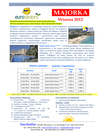 Biuro Podróży INVITATIO oficjalny partner programu EUROSENIORS - oferta ważna od 20.04.2012 .MAJORKA. Wiosna 2012 PROGRAM DOFINANSOWYWANY PRZEZ RZĄD HISZPANII OFERTA DOSTĘPNA DLA WSZYSTKICH BEZ OGRANICZEŃ WIEKU! Majorka to największa w archipelagu Balearów wyspa hiszpańska na Morzu Śródziemnym, leżąca w odległości 80 km od Hiszpanii. Głównym miastem i stolicą wyspy jest Palma de Mallorca. Majorka to łagodny klimat śródziemnomorski, wiecznie zielone gaje oliwne, kwitnące migdałowce, cytryny i pomarańcze oraz urokliwe średniowieczne miasteczka. Otwartość i gościnność mieszkańców Majorki połączona z doskonałym standardem hoteli czyni to miejsce jednym z najpiękniejszych na ziemi. Hotel Santa Ponsa **** – czterogwiazdkowy hotel położony w miejscowości o tej samej nazwie Santa Ponsa oddalonej ok. 20km na zachód od stolicy wyspy Palma de Mallorca. Kompleks składający się z dwóch budynków usytuowany jest wśród zieleni. Odległość od plaży wynosi ok. 250 m, centrum miejscowości Santa Ponsa oddalone jest od hotelu o ok. 500m. Leżaki i parasole przy basenie bezpłatnie, na plaży odpłatnie. OFERTA CENOWA wyjazdy 1-tygodniowe Terminy Hotel Cena HB Cena FB 24.03.2012 - 31.03.2012 Hotel Santa Ponsa **** 1 850 zł 1 890 zł 31.03.2012 - 07.04.2012 Hotel Santa Ponsa **** 1 850 zł 1 890 zł 07.04.2012 - 14.04.2012 Hotel Santa Ponsa **** 1 950 zł 1 990 zł 14.04.2012 - 21.04.2012 Hotel Santa Ponsa **** 1 950 zł 1 990 zł 21.04.2012 - 28.04.2012 Hotel Santa Ponsa **** 2 050 zł 2 090 zł 28.04.2012 - 05.05.2012 Hotel Santa Ponsa **** 2 140 zł 2 190 zł Wyżywienie: HB – 2 posiłki (śniadanie, gorąca kolacja) ; FB – 3 posiłki (śniadanie, obiad, gorąca kolacja). Cena pakietu obejmuje: 1) bezpośredni przelot charterowy Warszawa - Palma de Mallorca - Warszawa 2) transfery: lotnisko - hotel – lotnisko 3) 7 noclegów w hotelu**** 4) wyżywienie do wyboru FB lub HB + ¼ l. wody i ¼ l. wina do obiadu i kolacji 5) 1 półdniowa wycieczka 6) opieka polskojęzycznego rezydenta 7) ubezpieczenie AXA KL (10 000€), NNW (2 000 €), bagaż (200€) Cena pakietu nie obejmuje • ewentualnej dopłaty paliwowej Dopłaty i zniżki: 1) dziecko w wieku 0-2 lat – opłata stała 300 zł 2) ubezpieczenia od kosztów rezygnacji w AXA – koszt 2,5% wartości Imprez 3) możliwość wykupienia ubezpieczenia poszerzonego o choroby przewlekłych Invitatio | 00-087 Warszawa, ul. A.Corazziego 4 tel. +48 22 825 49 55 fax: +48 22 825 41 00 www.invitatio.com.pl [email protected] Bank PEKAO SA 88 1240 6348 1111 0000 5118 9815