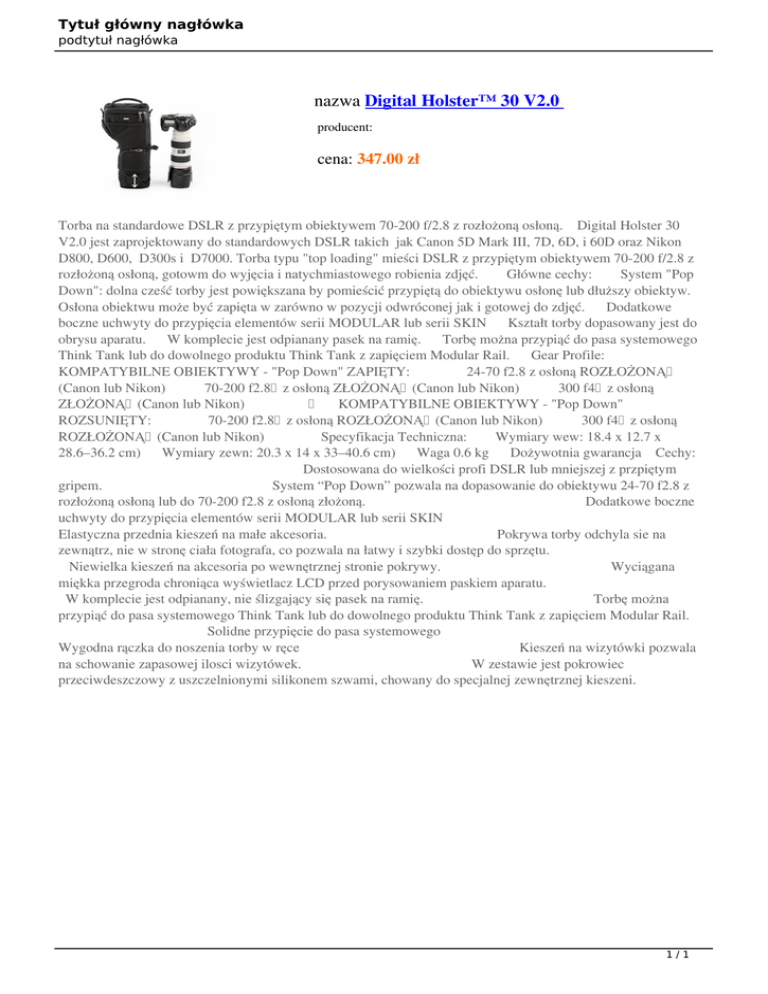 Tytuł główny nagłówka podtytuł nagłówka nazwa Digital Holster™ 30 V2.0 producent: cena: 347.00 zł Torba na standardowe DSLR z przypiętym obiektywem 70-200 f/2.8 z rozłożoną osłoną. Digital Holster 30 V2.0 jest zaprojektowany do standardowych DSLR takich jak Canon 5D Mark III, 7D, 6D, i 60D oraz Nikon D800, D600, D300s i D7000. Torba typu "top loading" mieści DSLR z przypiętym obiektywem 70-200 f/2.8 z rozłożoną osłoną, gotowm do wyjęcia i natychmiastowego robienia zdjęć. Główne cechy: System "Pop Down": dolna cześć torby jest powiększana by pomieścić przypiętą do obiektywu osłonę lub dłuższy obiektyw. Osłona obiektwu może być zapięta w zarówno w pozycji odwróconej jak i gotowej do zdjęć. Dodatkowe boczne uchwyty do przypięcia elementów serii MODULAR lub serii SKIN Kształt torby dopasowany jest do obrysu aparatu. W komplecie jest odpianany pasek na ramię. Torbę można przypiąć do pasa systemowego Think Tank lub do dowolnego produktu Think Tank z zapięciem Modular Rail. Gear Profile: KOMPATYBILNE OBIEKTYWY - "Pop Down" ZAPIĘTY: 24-70 f2.8 z osłoną ROZŁOŻONĄ (Canon lub Nikon) 70-200 f2.8 z osłoną ZŁOŻONĄ (Canon lub Nikon) 300 f4 z osłoną ZŁOŻONĄ (Canon lub Nikon) KOMPATYBILNE OBIEKTYWY - "Pop Down" ROZSUNIĘTY: 70-200 f2.8 z osłoną ROZŁOŻONĄ (Canon lub Nikon) 300 f4 z osłoną ROZŁOŻONĄ (Canon lub Nikon) Specyfikacja Techniczna: Wymiary wew: 18.4 x 12.7 x 28.6–36.2 cm) Wymiary zewn: 20.3 x 14 x 33–40.6 cm) Waga 0.6 kg Dożywotnia gwarancja Cechy: Dostosowana do wielkości profi DSLR lub mniejszej z przpiętym gripem. System “Pop Down” pozwala na dopasowanie do obiektywu 24-70 f2.8 z rozłożoną osłoną lub do 70-200 f2.8 z osłoną złożoną. Dodatkowe boczne uchwyty do przypięcia elementów serii MODULAR lub serii SKIN Elastyczna przednia kieszeń na małe akcesoria. Pokrywa torby odchyla sie na zewnątrz, nie w stronę ciała fotografa, co pozwala na łatwy i szybki dostęp do sprzętu. Niewielka kieszeń na akcesoria po wewnętrznej stronie pokrywy. Wyciągana miękka przegroda chroniąca wyświetlacz LCD przed porysowaniem paskiem aparatu. W komplecie jest odpianany, nie ślizgający się pasek na ramię. Torbę można przypiąć do pasa systemowego Think Tank lub do dowolnego produktu Think Tank z zapięciem Modular Rail. Solidne przypięcie do pasa systemowego Wygodna rączka do noszenia torby w ręce Kieszeń na wizytówki pozwala na schowanie zapasowej ilosci wizytówek. W zestawie jest pokrowiec przeciwdeszczowy z uszczelnionymi silikonem szwami, chowany do specjalnej zewnętrznej kieszeni. 1/1
