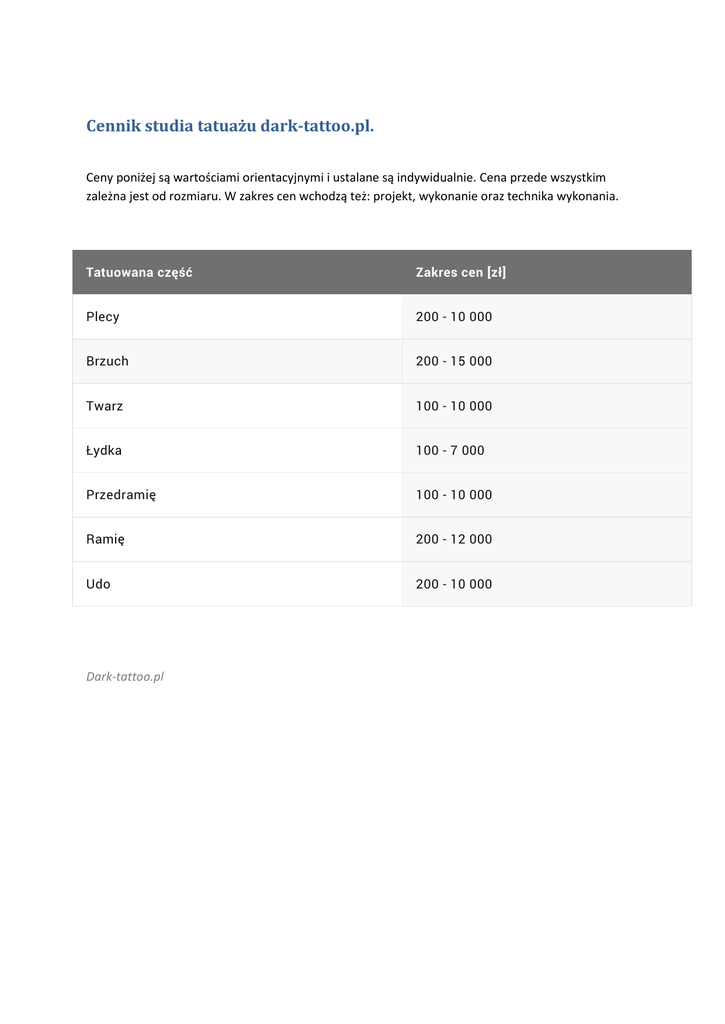Cennik studia tatuażu dark-tattoo.pl. Ceny poniżej są wartościami orientacyjnymi i ustalane są indywidualnie. Cena przede wszystkim zależna jest od rozmiaru. W zakres cen wchodzą też: projekt, wykonanie oraz technika wykonania. Tatuowana część Zakres cen [zł] Plecy 200 - 10 000 Brzuch 200 - 15 000 Twarz 100 - 10 000 Łydka 100 - 7 000 Przedramię 100 - 10 000 Ramię 200 - 12 000 Udo 200 - 10 000 Dark-tattoo.pl
