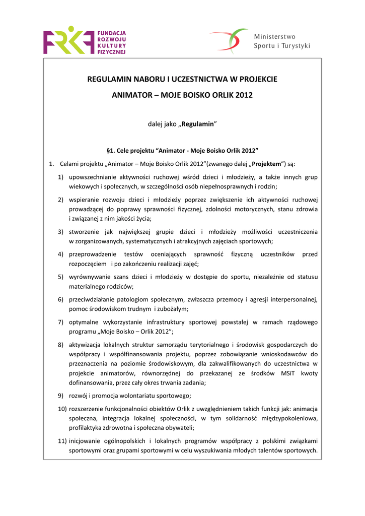 REGULAMIN NABORU I UCZESTNICTWA W PROJEKCIE ANIMATOR – MOJE BOISKO ORLIK 2012 dalej jako „Regulamin” §1. Cele projektu “Animator - Moje Boisko Orlik 2012” 1. Celami projektu „Animator – Moje Boisko Orlik 2012”(zwanego dalej „Projektem”) są: 1) upowszechnianie aktywności ruchowej wśród dzieci i młodzieży, a także innych grup wiekowych i społecznych, w szczególności osób niepełnosprawnych i rodzin; 2) wspieranie rozwoju dzieci i młodzieży poprzez zwiększenie ich aktywności ruchowej prowadzącej do poprawy sprawności fizycznej, zdolności motorycznych, stanu zdrowia i związanej z nim jakości życia; 3) stworzenie jak największej grupie dzieci i młodzieży możliwości uczestniczenia w zorganizowanych, systematycznych i atrakcyjnych zajęciach sportowych; 4) przeprowadzenie testów oceniających sprawność rozpoczęciem i po zakończeniu realizacji zajęć; fizyczną uczestników przed 5) wyrównywanie szans dzieci i młodzieży w dostępie do sportu, niezależnie od statusu materialnego rodziców; 6) przeciwdziałanie patologiom społecznym, zwłaszcza przemocy i agresji interpersonalnej, pomoc środowiskom trudnym i zubożałym; 7) optymalne wykorzystanie infrastruktury sportowej powstałej w ramach rządowego programu „Moje Boisko – Orlik 2012”; 8) aktywizacja lokalnych struktur samorządu terytorialnego i środowisk gospodarczych do współpracy i współfinansowania projektu, poprzez zobowiązanie wnioskodawców do przeznaczenia na poziomie środowiskowym, dla zakwalifikowanych do uczestnictwa w projekcie animatorów, równorzędnej do przekazanej ze środków MSiT kwoty dofinansowania, przez cały okres trwania zadania; 9) rozwój i promocja wolontariatu sportowego; 10) rozszerzenie funkcjonalności obiektów Orlik z uwzględnieniem takich funkcji jak: animacja społeczna, integracja lokalnej społeczności, w tym solidarność międzypokoleniowa, profilaktyka zdrowotna i społeczna obywateli; 11) inicjowanie ogólnopolskich i lokalnych programów współpracy z polskimi związkami sportowymi oraz grupami sportowymi w celu wyszukiwania młodych talentów sportowych. 2. Ministerstwo Sportu i Turystyki za pośrednictwem Operatora, o którym mowa w § 2. Regulaminu, przekazywać będzie zakwalifikowanym do udziału w projekcie JST dofinansowanie umożliwiające zaangażowanie Animatorów/Animatorek, których zadaniem będzie wdrażanie w życie celów opisanych w ust. 1 powyżej. 3. Animatorem/Animatorką jest osoba zgłoszona przez JST i zaakceptowana przez Operatora, która – w przypadku zakwalifikowania JST do udziału w projekcie - na mocy umów łączących tę osobę z JST oraz Operatorem zobowiązana będzie do inicjowania, organizowania i prowadzenia działalności na obiektach Orlik. §2. Operator projektu Operatorem projektu („Operator”) jest Fundacja Rozwoju Kultury Fizycznej z siedzibą w Pucku, adres: Lipowa 3, 84-100 Puck, wpisana do Rejestru Przedsiębiorców Krajowego Rejestru Sądowego, dla której Sąd Rejonowym Gdańsk-Północ w Gdańsku VIII Wydział Gospodarczy Krajowego Rejestru Sądowego prowadzi akta rejestrowe pod nr KRS 0000037541, NIP: 525-14-37-955. §3. Podmioty uprawnione do ubiegania się o dofinansowanie 1. O dofinansowanie mogą ubiegać się każda jednostka samorządu terytorialnego będąca właścicielem obiektu Orlika wybudowanego w ramach programu “Moje Boisko Orlik 2012” (dalej: „JST”) w celu uzyskania sfinansowania zadań realizowanym na Orliku przez Animatora/Animatorkę. 2. Wnioski w imieniu JST składać mogą inne osoby (np. zarządcy Orlików), pod warunkiem posiadania umocowania do reprezentowania JST w zakresie odpowiednim dla złożenia wniosków. §4. Zadania Animatorów/Animatorek 1. Animatorzy i Animatorki przyczyniać się będą do realizacji celów określonych w § 1. Regulaminu poprzez wypełnianie powierzonych im zadań. 2. Animatorzy i Animatorki będą wypełniać powierzone im zadania w okresie od dn. 1 marca 2015 r. do dnia 30 listopada 2015 r. 3. Wśród zadań powierzonych Animatorowi/Animatorce znaleźć powinny się co najmniej: 1) organizacja regularnych i atrakcyjnych pozalekcyjnych zajęć sportowych dla dzieci i młodzieży uwzględniający powszechną dostępność, przełamywanie barier w dostępie do sportu z powodów ekonomicznych, wychowanie w duchu szacunku i współpracy (przeciwdziałanie agresji i patologii); 2) organizacja regularnych i atrakcyjnych zajęć sportowych dla jednej wybranej grupy priorytetowej (przedszkolaki, dziewczęta, rodziny, kobiety, osoby niepełnosprawne, seniorzy) 3) przeprowadzenie przynajmniej dwóch lokalnych akcji promocyjnych, w tym organizacja imprez i wydarzeń sportowych dla społeczności lokalnej (różne grupy społeczne i wiekowe) promujących zdrowy styl życia; 4) zaangażowanie wolontariuszy i wolontariuszek w działania na Orliku; 5) przeprowadzenie testów dla użytkowników Orlików; 6) współpraca z klubami sportowymi w celu wspierania rozwoju młodych talentów sportowych; 7) współpraca ze szkołami i organizacjami sportowymi w celu popularyzacji aktywności fizycznej; 8) angażowanie się w organizację turniejów i akcji społecznych inicjowanych lub objętych patronatem przez Ministra Sportu i Turystyki; 9) ukończenie przynajmniej jednego kursu e-learningowego spośród kursów udostępnianych w portalu www.naszorlik.pl. § 5. Obowiązki Animatora/Animatorki Do obowiązków Animatorów/Animatorek należeć będzie: 1) umożliwianie JST, Operatorowi lub innym podmiotom upoważnionym przez JST lub Operatora przeprowadzania kontroli i badań; 2) generowanie pobieranie i przesyłanie Operatowi raportów miesięcznych dokumentujących wykonywanie powierzonych zadań oraz uwzględniających liczbę użytkowników Orlika (przy wykorzystaniu portalu www.naszorlik.pl),; 3) generowanie, pobieranie i przesyłanie Operatorowi wykorzystaniu portalu www.naszorlik.pl); rachunków miesięcznych (przy 4) wygenerowa