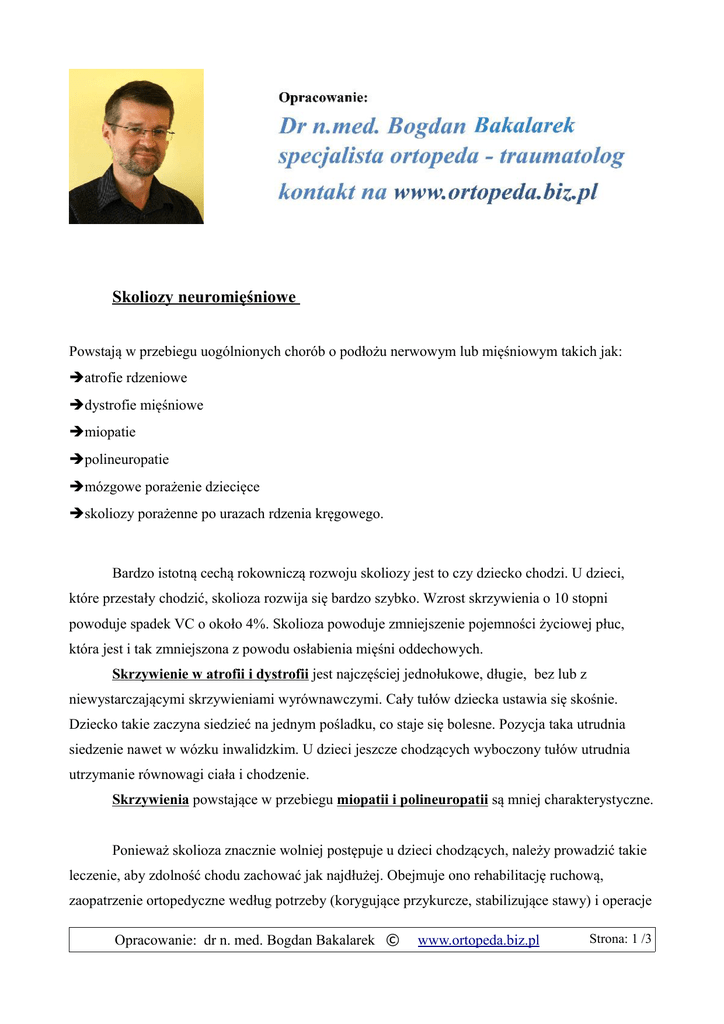 Skoliozy neuromięśniowe Powstają w przebiegu uogólnionych chorób o podłożu nerwowym lub mięśniowym takich jak: ➔atrofie rdzeniowe ➔dystrofie mięśniowe ➔miopatie ➔polineuropatie ➔mózgowe porażenie dziecięce ➔skoliozy porażenne po urazach rdzenia kręgowego. Bardzo istotną cechą rokowniczą rozwoju skoliozy jest to czy dziecko chodzi. U dzieci, które przestały chodzić, skolioza rozwija się bardzo szybko. Wzrost skrzywienia o 10 stopni powoduje spadek VC o około 4%. Skolioza powoduje zmniejszenie pojemności życiowej płuc, która jest i tak zmniejszona z powodu osłabienia mięśni oddechowych. Skrzywienie w atrofii i dystrofii jest najczęściej jednołukowe, długie, bez lub z niewystarczającymi skrzywieniami wyrównawczymi. Cały tułów dziecka ustawia się skośnie. Dziecko takie zaczyna siedzieć na jednym pośladku, co staje się bolesne. Pozycja taka utrudnia siedzenie nawet w wózku inwalidzkim. U dzieci jeszcze chodzących wyboczony tułów utrudnia utrzymanie równowagi ciała i chodzenie. Skrzywienia powstające w przebiegu miopatii i polineuropatii są mniej charakterystyczne. Ponieważ skolioza znacznie wolniej postępuje u dzieci chodzących, należy prowadzić takie leczenie, aby zdolność chodu zachować jak najdłużej. Obejmuje ono rehabilitację ruchową, zaopatrzenie ortopedyczne według potrzeby (korygujące przykurcze, stabilizujące stawy) i operacje Opracowanie: dr n. med. Bogdan Bakalarek © www.ortopeda.biz.pl Strona: 1 /3 deformacji kończyn dolnych. Gorset ortopedyczny często nie zapobiega progresji a przede wszystkim jest źle tolerowany przez chorych ze względów oddechowych. Jeżeli skrzywienie jest powyżej 30 stopni i ewentualnie występuje skośne ustawienie miednicy należy wykonać zabieg korekcji skoliozy. Warunkiem przeprowadzenia zabiegu jest pojemność płuc (VC) powyżej 30 %. Niska dolna granica wielkości skrzywienia we wskazaniach do zabiegu jest podyktowana tym, że małe skoliozy są jeszcze elastyczne, a stan ogólny dzieci dość dobry. Duże skrzywienia stają się sztywne, więc i korekcje operacyjne są gorsze. Ponadto postęp choroby powoduje, że obciążenie chorego zabiegiem staje się większe. Obraz kliniczny i rtg skoliozy neuromięśniowej. Pacjent ze skoliozą neuromięśniową. Musi podpierać się rękami, gdyż nie utrzymuje równowagi a tułów bez podparcia zapada się. Atrofia rdzeniowa mięśni (rdzeniowy zanik mięśni) jest procesem pierwotnie nerwowym. Częstość wystąpienia skoliozy zależy od typu atrofii mięśniowej: ➔Atrofia t. Ib - 100% chorych ma skoliozę ➔Atrofia t. II - 100% chorych, którzy utraciło zdolność chodzenia ➔Atrofia t. III - 25% chorych ma skoliozę Dystrofie mięśniowe Jest to duża grupa chorób o wspólnej cesze – proces chorobowy jest pierwotnie mięśniowy. Skolioza tworzy się u 25% pacjentów chodzących i 100% niechodzących. Skoliozy porażenne po złamaniach kręgosłupa powstają zarówno w porażeniach wiotkich Opracowanie: dr n. med. Bogdan Bakalarek © www.ortopeda.biz.pl Strona: 2 /3 i spastycznych. Mogą przybierać duże rozmiary, jeśli do porażenia doszło w wieku dziecięcym lub młodzieńczym. U dorosłych mogą tworzyć się skrzywienia ale o znacznie mniejszych deformacjach. Skoliozy w mózgowym porażeniu dziecięcym mają również charakter porażenny. Kształtem przypominają często deformacje w atrofii rdzeniowej- są długie, dają skośne ustawienie miednicy, często bez skrzywień wyrównawczych. Cechą charakterystyczną są dolegliwości bólowe związane nadmiernym napięciem mięśni. Inne deformacje w chorobach neuromięśniowych w: Korekcja operacyjna skoliozy Technika zabiegu zależy przede wszystkim od tego czy dziecko chodzi czy nie. U pacjentów chodzących nawet w przypadkach skośnej miednicy stosuje się korekcję skoliozy bez objęcia miednicy. Siły jakie towarzyszą chodzeniu nie pozwalają objęciu miednicy, gdyż groziłoby to wyrwaniem instrumentarium. U pacjentów niechodzących stosuje się zabieg m. Galveston. Ma on spełnić dwie funkcje- skorygować skoliozę i skorygować skośne ustawienie miednicy. Zabieg ten poprawia komfort siedzenia i zmniejsza wynikające ze skoliozy narastanie niewydolności oddechowej. W przypadkach skolioz porażennych spastycznych niewskazana jest korekcja tylna opierająca się na dystrakcji, gdyż spowoduje to zwiększenie spastyczności. U tych pacjentów bezpiecznym zabiegiem jest korekcja przednia skoliozy, która jednak może okazać się niewystarczająca. Dlatego też w szczególnych przypadkach trzeba rozważyć zabieg korekcji tylnej z późniejszą implantacją pompy Baclofenowej obniżającej napięcie spastyczne. Stan przed i po zabiegu korekcji skoliozy neuromięśniowej. Wyprostowanie i stabilizacja kręgosłupa piersiowo – lędźwiowo - krzyżowa zapewnia proste siedzenie na obu pośladkach i stabilność tułowia. Opracowanie: dr n. med. Bogdan Bakalarek © www.ortopeda.biz.pl Strona: 3 /3