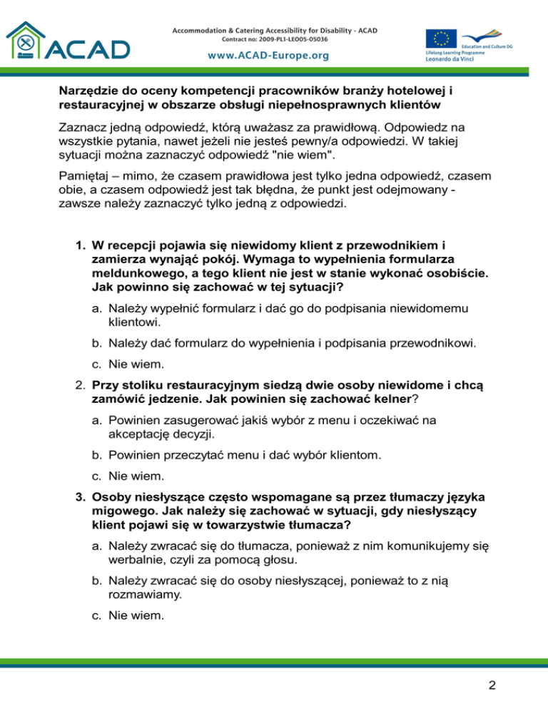 Narzędzie do oceny kompetencji pracowników branży hotelowej i restauracyjnej w obszarze obsługi niepełnosprawnych klientów Zaznacz jedną odpowiedź, którą uważasz za prawidłową. Odpowiedz na wszystkie pytania, nawet jeżeli nie jesteś pewny/a odpowiedzi. W takiej sytuacji można zaznaczyć odpowiedź "nie wiem". Pamiętaj – mimo, że czasem prawidłowa jest tylko jedna odpowiedź, czasem obie, a czasem odpowiedź jest tak błędna, że punkt jest odejmowany zawsze należy zaznaczyć tylko jedną z odpowiedzi. 1. W recepcji pojawia się niewidomy klient z przewodnikiem i zamierza wynająć pokój. Wymaga to wypełnienia formularza meldunkowego, a tego klient nie jest w stanie wykonać osobiście. Jak powinno się zachować w tej sytuacji? a. Należy wypełnić formularz i dać go do podpisania niewidomemu klientowi. b. Należy dać formularz do wypełnienia i podpisania przewodnikowi. c. Nie wiem. 2. Przy stoliku restauracyjnym siedzą dwie osoby niewidome i chcą zamówić jedzenie. Jak powinien się zachować kelner? a. Powinien zasugerować jakiś wybór z menu i oczekiwać na akceptację decyzji. b. Powinien przeczytać menu i dać wybór klientom. c. Nie wiem. 3. Osoby niesłyszące często wspomagane są przez tłumaczy języka migowego. Jak należy się zachować w sytuacji, gdy niesłyszący klient pojawi się w towarzystwie tłumacza? a. Należy zwracać się do tłumacza, ponieważ z nim komunikujemy się werbalnie, czyli za pomocą głosu. b. Należy zwracać się do osoby niesłyszącej, ponieważ to z nią rozmawiamy. c. Nie wiem. 2 4. Osoby bardzo słabo słyszące wspomagają swoje słyszenie odczytywaniem z ruchu warg. Jak można im to ułatwić? a. Należy mówić bardzo powoli i głośno. b. Należy mówić nieco głośniej i w normalnym tempie. c. Nie wiem. 5. Osoby jąkające się i zacinające mają często problem z wypowiedzeniem całego zdania do końca. Jak należy się zachować, gdy taka osoba zatnie się i nie może się wypowiedzieć? a. Należy pozwolić jej na wypowiedzenie się samodzielne, aby uniknąć wątpliwości. b. Należy podpowiadać różne możliwe zakończenia zdania, aby rozmówca mógł skinięciem głowy potwierdzić jedną z możliwości. c. Nie wiem. 6. Osoba nie mówiąca pragnie zamówić w barze drinka. Jaka metoda komunikacji jest najskuteczniejsza? a. Porozumiewanie się na migi, na przykład przez pokazywanie różnych butelek i pokazywanie na palcach proporcji. b. Wskazanie wybranego drinka z karty napojów. c. Nie wiem. 7. Osoby poruszające się na wózkach inwalidzkich mają głowę na niższym poziomie, niż większość ludzi. Może się zatem zdarzyć, że kontuar recepcji będzie dla nich za wysoki. Jak powinien zachować się w tej sytuacji recepcjonista mający do wydania dokumenty? a. Powinien dyskretnie przechylić się nad kontuarem i podawać dokumenty nad ladą. b. Powinien wyjść spoza kontuaru i przynieść dokumenty bezpośrednio do osoby niepełnosprawnej. c. Nie wiem. 3 8. Osoby niepełnosprawne intelektualnie mają czasem kłopot ze zrozumieniem wartości liczbowych, w tym dużych sum pieniędzy. Jak powinno się zachować, gdy taki klient postanowi zamówić sobie najdroższą limuzynę zamiast zwykłej taksówki? a. Należy mu wyjaśnić, że koszt limuzyny przekracza kilkukrotnie koszt taksówki, ale nie wpływać na jego decyzję. b. Należy mu to wyperswadować, bo z pewnością nie ma tyle pieniędzy. c. Nie wiem. 9. Osoby niepełnosprawne intelektualnie mają czasem problem ze zrozumieniem komunikatów powszechnie rozumianych. Jak należy się zachować, gdy taki klient pojawi się wraz z osobą towarzyszącą, a do przekazania jest skomplikowana informacja? a. Należy przekazać ją osobie towarzyszącej, która znacznie lepiej potrafi się komunikować z niepełnosprawnym klientem b. Należy uprościć komunikat i postarać się go przekazać bezpośrednio klientowi. c. Nie wiem. 10. Osoba niepełnosprawna intelektualnie zamawia butelkę wódki, a siedzi sama przy stoliku. Jak powinien zareagować kelner? a. Powinien odmówić przyniesienia alkoholu, by klient nie narobił sobie problemów. b. Powinien zachować się tak samo, jak w wypadku innych klientów. c. Nie wiem. 11. W hotelu mieszka osoba niewidoma, w pokoju której znajduje się telewizor. Piloty wydawane są na recepcji na życzenie klienta. Jak należy się zachować w wypadku takiego klienta? a. Nie powinno się ranić uczuć i informować o telewizorze, z którego i tak przecież nie skorzysta. b. Poinformować tak, jak każdego innego klienta i ewentualnie poinstruować o sposobie użycia pilota. c. Nie wiem. 4 12. Hotel powinien być wszechstronnie przygotowany do obsługi różnych klientów, a zatem także prawidłowo oznakowany. Jakie informacje wizualne są lepiej rozpoznawalne przez osoby głuche? a. Powszechnie przyjęte znaki graficzne. b. Wyraźne napisy w przynajmniej dwóch językach. c. Nie wiem. 13. Jakie rozwiązania najbardziej ułatwiają funkcjonowanie osobie z niesprawnością mowy w hotelu? a. Liczne i jednoznaczne informacje wizualne - napisy, symbole i plany. b. Kompetentna i uprzejma obsługa. c. Nie wiem. 14. Lokal świadczący usługi powinien być przygotowany na przyjęcie klienta na wózku inwalidzkim. Które z dwóch rozwiązań jest prawidłowe? a. Miejsce dla klientów na wózkach powinno być wyraźnie oznaczone widocznym z daleka znakiem i zarezerwowane dla tych osób na stałe. b. Klient powinien mieć możność wybrania sobie miejsca, nawet jeżeli nie jest ono w pełni dostępne. c. Nie wiem. 15. Osoby niepełnosprawne intelektualnie mogą mieć czasem problem z samodzielnym trafianiem do swojego pokoju hotelowego. Jak można temu zaradzić? a. Należy pomagać im docierać do pokoju za każdym razem, gdy się zgubią. b. Należy wręczyć im plan hotelu z wyraźnie oznaczonym położeniem pokoju i w prosty sposób wyjaśnić sposób dojścia do niego. c. Nie wiem. 5 16. Niewidomy klient p