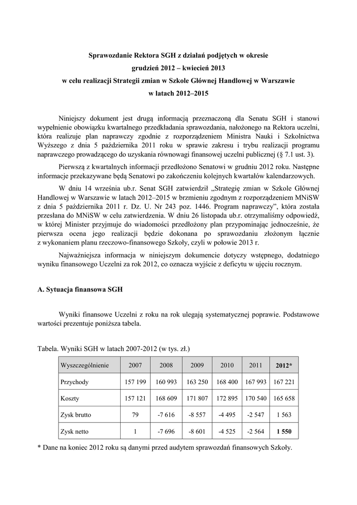 Sprawozdanie Rektora SGH z działań podjętych w okresie grudzień 2012 – kwiecień 2013 w celu realizacji Strategii zmian w Szkole Głównej Handlowej w Warszawie w latach 2012–2015 Niniejszy dokument jest drugą informacją przeznaczoną dla Senatu SGH i stanowi wypełnienie obowiązku kwartalnego przedkładania sprawozdania, nałożonego na Rektora uczelni, która realizuje plan naprawczy zgodnie z rozporządzeniem Ministra Nauki i Szkolnictwa Wyższego z dnia 5 października 2011 roku w sprawie zakresu i trybu realizacji programu naprawczego prowadzącego do uzyskania równowagi finansowej uczelni publicznej (§ 7.1 ust. 3). Pierwszą z kwartalnych informacji przedłożono Senatowi w grudniu 2012 roku. Następne informacje przekazywane będą Senatowi po zakończeniu kolejnych kwartałów kalendarzowych. W dniu 14 września ub.r. Senat SGH zatwierdził „Strategię zmian w Szkole Głównej Handlowej w Warszawie w latach 2012–2015 w brzmieniu zgodnym z rozporządzeniem MNiSW z dnia 5 października 2011 r. Dz. U. Nr 243 poz. 1446. Program naprawczy”, która została przesłana do MNiSW w celu zatwierdzenia. W dniu 26 listopada ub.r. otrzymaliśmy odpowiedź, w której Minister przyjmuje do wiadomości przedłożony plan przypominając jednocześnie, że pierwsza ocena jego realizacji będzie dokonana po sprawozdaniu złożonym łącznie z wykonaniem planu rzeczowo-finansowego Szkoły, czyli w połowie 2013 r. Najważniejsza informacja w niniejszym dokumencie dotyczy wstępnego, dodatniego wyniku finansowego Uczelni za rok 2012, co oznacza wyjście z deficytu w ujęciu rocznym. A. Sytuacja finansowa SGH Wyniki finansowe Uczelni z roku na rok ulegają systematycznej poprawie. Podstawowe wartości prezentuje poniższa tabela. Tabela. Wyniki SGH w latach 2007-2012 (w tys. zł.) Wyszczególnienie 2007 2008 2009 2010 2011 2012* Przychody 157 199 160 993 163 250 168 400 167 993 167 221 Koszty 157 121 168 609 171 807 172 895 170 540 165 658 Zysk brutto 79 -7 616 -8 557 -4 495 -2 547 1 563 Zysk netto 1 -7 696 -8 601 -4 525 -2 564 1 550 * Dane na koniec 2012 roku są danymi przed audytem sprawozdań finansowych Szkoły. Art. 100a. 1. Ustawy o szkolnictwie wyższym mówi, że „Uczelnia publiczna, w której suma strat netto w okresie nie dłuższym niż pięć ostatnich lat przekracza 25% kwoty dotacji z budżetu państwa otrzymanej w roku poprzedzającym bieżący rok budżetowy na zadania, o których mowa w art. 94 ust. 1 pkt 1, jest obowiązana do opracowania programu naprawczego”. Udział skumulowanych strat netto z lat 2007-2011 w kwocie dotacji z 2011 roku wynosił 29,80%. W 2012 przewidywana dotacja wyniesie 79,5 mln. zł. Udział skumulowanych wyników netto z lat 2008-2012 w kwocie dotacji z 2012 roku wynosi 27,47%. We wspomnianym wyżej rozporządzeniu, MNiSW wprowadza także jako miernik efektywności realizacji planu naprawczego następujący wskaźnik: zobowiązania krótkookresowe + krótkookresowe rozliczenia międzyokresowe 1 aktywa obrotowe + środki trwałe w budowie Wg zaleceń ministerialnych powinien on kształtować się poniżej jedności. Na koniec 2011 roku poziom wskaźnika dla SGH wyniósł 2,49. Po III kw. 2012 roku jego wartość wyniosła 2,45, a na koniec tego roku (dla wielkości z bilansu przed audytem) 2,51. B. Podjęte działania zmierzające do realizacji strategii W „Strategii zmian w Szkole Głównej Handlowej w Warszawie w latach 2012-2015” określono harmonogram realizacji programu naprawczego Szkoły Głównej Handlowej w Warszawie w podziale na zdefiniowanych 21 działań wraz z terminami ich realizacji. Poniżej zamieszczono krótką charakterystykę dokonanych prac wraz z przypomnieniem terminów założonych w „Strategii …” 1. Przegląd kierunków studiów z punktu widzenia celowości ich uruchamiania - do 31 marca 2013 roku Zdefiniowano obszary analizy kierunków studiów z punktu widzenia strategicznego i organizacyjnego oraz w perspektywie finansowej i wskaźnikowej. Powstały dwa ważne opracowania (raporty Biura Rekrutacji) przedstawione do akceptacji władz Uczelni. Dowodzą one, że nawet jeśli struktura kierunków nie jest optymalna to zapewnia Uczelni przyrost liczby studentów. Zidentyfikowano bariery wewnętrzne utrudniające uruchamianie nowych kierunków studiów i odblokowano możliwość tworzenia nowych kierunków przez kolegia. Podjęto intensywne działania zmierzające do zaoferowania studentom w szerszym zakresie możliwości uzyskania podwójnych dyplomów we współpracy partnerskiej z innymi uczelniami. Dzięki wykonanemu przeglądowi kierunków podjęto starania o uruchomienie nowego kierunku polityki publicznej w ramach rozwoju portfela strategicznego oferty studiów SGH. Od 15 stycznia br. zintensyfikowano prace komisji rektorskich, poddając analizie standardy jakości i procesu kształcenia. Ukierunkowano działanie Senackiej Komisji Programowej, nadając priorytet analizie kierunków studiów. Komisja do spraw reformy wypracowała wizję Uczelni z uwzględnieniem charakteru przyszłych procesów kształcenia SGH, w tym kształcenia ustawicznego oraz executive education. Przeprowadzona zostanie wkrótce szczegółowa analiza finansowa kierunków studiów, co będzie możliwe dzięki wdrażanemu właśnie systemowi controllingu zarządczego. System daje dostęp do danych analitycznych na poziomie szczegółowości dotychczas niedostępnym w SGH. Równolegle z działaniami o charakterze strategicznym i finansowym rozpoczęto proces poprawy jakości obsługi studiów od strony administracyjnej. 2. Opracowanie strategii promocji istniejących kierunków studiów - do 31 marca 2013 roku Poddano analizie dotychczasowe działania promocyjne. Zidentyfikowano jako kierunkowy obszar promocji program ACCA realizowany wspólnie z firmą Ernst & Young. Przyjęto, opartą na tym studium przypadku, analizę odpowiadającą generycznej usłudze dydaktycznej. Powołano zespół w celu identyfikacji barier i intensyfik