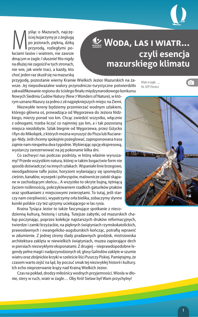 M yśląc o Mazurach, najczęściej kojarzymy je z żeglugą po jeziorach, piękną, dziką przyrodą, rozległymi połaciami lasów i wiatrem, nie zawsze dmącym w żagle. I słusznie! Kto nigdy na dłużej nie zagościł w tych stronach, nie wie, jak wiele traci, a każdy, kto choć jeden raz skusił się na mazurską przygodę, pozostanie wierny Krainie Wielkich Jezior Mazurskich na zawsze. Jej niepodważalne walory przyrodniczo-turystyczne potwierdziło zakwalifikowanie regionu do ścisłego finału międzynarodowego konkursu Nowych Siedmiu Cudów Natury (New 7 Wonders of Nature), w którym uznano Mazury za jedno z 28 najpiękniejszych miejsc na Ziemi. Niezwykłe tereny będziemy przemierzać wodnym szlakiem, którego główna oś, prowadząca od Węgorzewa do Jeziora Nidzkiego, mierzy ponad 100 km. Chcąc zwiedzić wszystko, włącznie z odnogami, trzeba liczyć co najmniej 330 km, a i tak pozostaną miejsca niezdobyte. Szlak biegnie od Węgorzewa, przez Giżycko i Ryn do Mikołajek, z których można wyruszyć do Pisza lub Rucianego-Nidy. Jeśli chcemy spokojnie pożeglować, zaproponowana trasa zajmie nam niespełna dwa tygodnie. Wybierając opcję ekspresową, wystarczy zarezerwować na jej pokonanie kilka dni. Co zachwyci nas podczas podróży, w którą właśnie wyruszamy? Przede wszystkim natura, której w takim bogactwie form nie sposób doświadczyć na innych szlakach. Wspaniałe linie brzegowe, nieodgadnione tafle jezior, horyzont wyłaniający się spomiędzy cieśnin, kanałów, wysepek i półwyspów, malownicze zatoki skąpane w zachodzącym słońcu... A wszystko to okryte bujną, tętniącą życiem roślinnością, pokrzykiwaniem rzadkich gatunków ptaków oraz spotkaniami z miejscowymi zwierzętami. To tutaj, jeśli starczy nam cierpliwości, wypatrzymy orła bielika, zobaczymy słynne koniki polskie czy też ujrzymy uciekającego w las rysia. Kraina Tysiąca Jezior to także fascynujące spotkanie z niecodzienną kulturą, historią i sztuką. Tutejsze zabytki, od mazurskich chałup poczynając, poprzez kolekcje najstarszych druków reformacyjnych, twierdze i zamki krzyżackie, na pięknych świątyniach rzymskokatolickich, prawosławnych i ewangelicko-augsburskich kończąc, potrafią wprawić w zdumienie. Z jednej strony ślady pradawnych grodzisk, mistrzowska architektura zaklęta w niewielkich świątyniach, muzea zapierające dech w piersiach niezwykłymi eksponatami. Z drugiej – nieprawdopodobne legendy pełne magii i nadprzyrodzonych sił, głosy Galindów zaklęte w szumie wiatru oraz zbójnickie krzyki w szeleście liści Puszczy Piskiej. Pamiętajmy, że czasem warto zejść na ląd, by poczuć smak tej niezwykłej historii i kultury. Ich echo nieprzerwanie krąży nad Krainą Wielkich Jezior. Czas na pokład, drodzy miłośnicy wodnych przyjemności. Wiosła w dłonie, stery w ruch, wiatr w żagle… Oby Król Sielaw był Wam przychylny! Woda, las i wiatr... czyli esencja mazurskiego klimatu Wiatr w żagle…, fot. GEP Chroszcz 1 Rozdział I. 2 D rugiej takiej krainy próżno w Polsce szukać! Wielkie Jeziora Mazurskie są ewenementem przyrodniczym nie tylko w skali kraju, ale i świata. W samej Europie konkurować z tą różnorodnością mogłaby co najwyżej Finlandia. Tajemnicza, nieujarzmiona, zawsze piękna, czasami groźna… Dziewicze krajobrazy i bogactwo form, które można tu napotkać wskutek długiej „wizyty” skandynawskiego lądolodu sprawiają, że jest jednym z najatrakcyjniejszych w Polsce. W województwie warmińsko-mazurskim znajdują się bardzo ciekawe pod względem hydrologicznym pojezierza. Na zachodzie Pojezierze Chełmińsko-Dobrzyńskie usiane jest niewielkimi jeziorkami, należą do nich między innymi Jezioro Głowińskie czy Sosno. W jego wschodniej części znajduje się Garb Lubawski z niecodzienną rzeźbą terenu, bujnymi lasami mieszanymi i dwoma dużymi jeziorami: Dąbrową Wielką i Dąbrową Małą. Szczególnie wyróżniają się na nim Wzgórza Dylewskie z najwyższym szczytem na Niżu Europejskim na wschód od Wisły po Ural – Dylewską Górą (312 m n.p.m.). Malowniczo prezentuje się również dobrze rozwinięty system tarasów z jeziorami i bezodpływowymi nieckami w dolinie Drwęcy, wzdłuż której rozciąga się rezerwat przyrody, a u źródeł słynny Czarci Jar. Pozostałe tereny tej części regionu są mniej interesujące ze względu na swój równinny, monotonny charakter. Rekompensatą może być wizyta w interesujących miejscowościach tej O regionie słów kilka Jezioro Drwęckie, fot.J. Pruszyńska Kraina Wielkich Jezior Mazurskich części Warmii i Mazur, chociażby w Lubawie, Nowym Mieście Lubawskim lub Grunwaldzie, będącymi w przeszłości grodami pruskimi. Na zachód od Pojezierza Chełmińsko-Dobrzyńskiego znajduje się Pojezierze Iławskie, niegdyś wdzięcznie nazywane Pomezanią. Położone między czterema rzekami – Wisłą, Osą, Drwęcą i Pasłęką – odznacza się licznymi wzgórzami i jeziorami, wśród których najbardziej interesujące są jeziora Jeziorak, Narie i Drwęckie. Na uwagę zasługują też Lasy Iławskie, tworzące wraz z Jeziorakiem Park Krajobrazowy Pojezierza Iławskiego z charakterystycznymi elementami krajobrazu: morenami czołowymi, dennymi, polami sandrowymi czy zagłębieniami wypełnionymi wodą po martwym lodzie. Jedną z ciekawszych atrakcji tej części pojezierza jest Kanał Elbląski, którego fragment w 1978 roku został uznany za zabytek techniki, a w 2011 roku całość mianowano pomnikiem historii. Będąc w tej części regionu, koniecznie trzeba też zobaczyć ostródzkie kamienice, Jezioro Jasne koło Siemian o niezwykłej, ponad 10-metrowej przejrzystości wody, i zabytki Mrągowa. W końcu docieramy do Pojezierza Mazurskiego, zlokalizowanego w środkowej i wschodniej części województwa. Świetne warunki turystyczno-przyrodnicze zapewniają odwiedzającym ten teren cały wachlarz różnorodnych atrakcji. Również proponowany w 