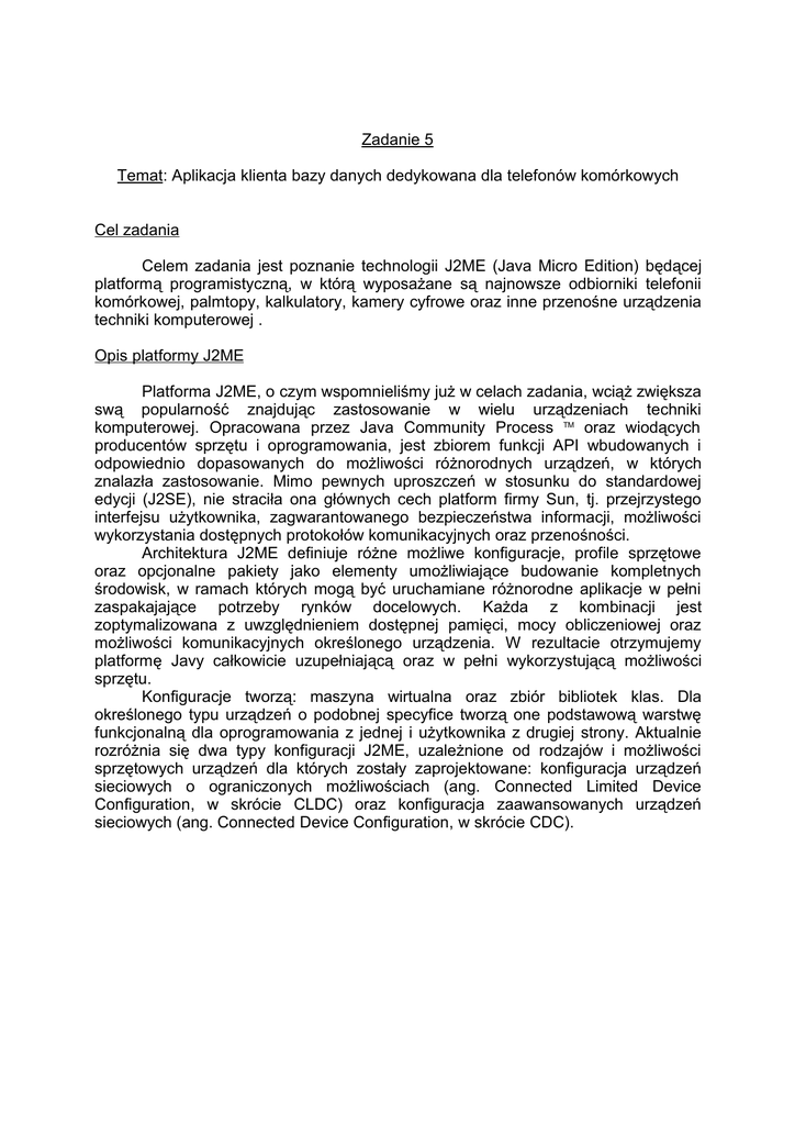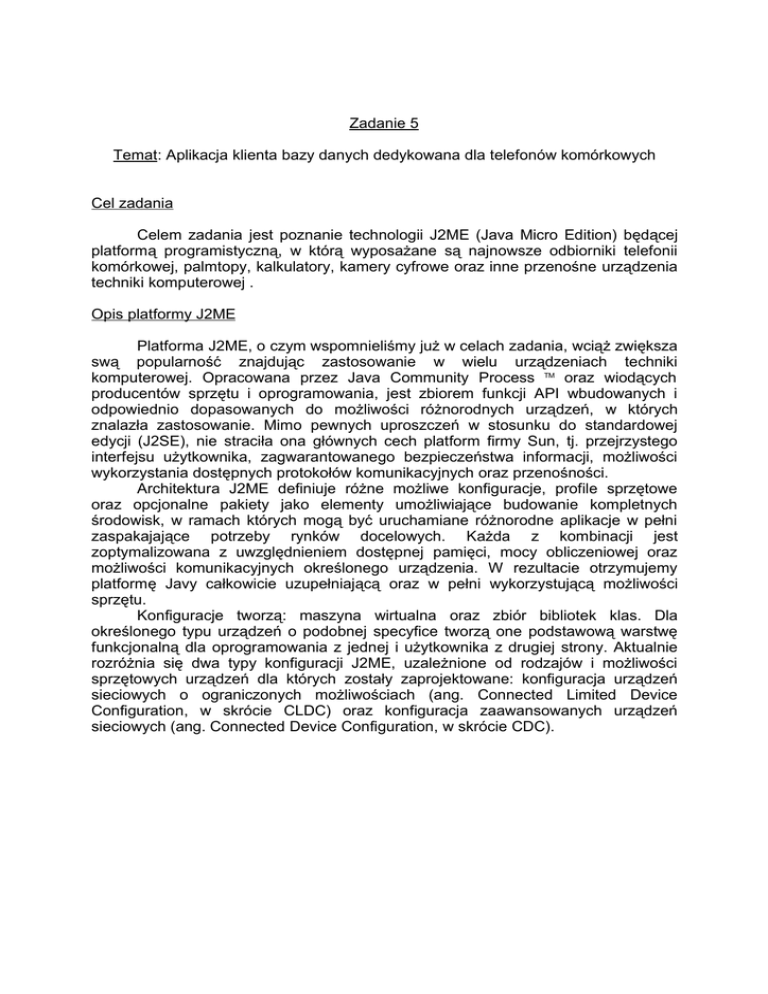 Zadanie 5 Temat: Aplikacja klienta bazy danych dedykowana dla telefonów komórkowych Cel zadania Celem zadania jest poznanie technologii J2ME (Java Micro Edition) będącej platformą programistyczną, w którą wyposażane są najnowsze odbiorniki telefonii komórkowej, palmtopy, kalkulatory, kamery cyfrowe oraz inne przenośne urządzenia techniki komputerowej . Opis platformy J2ME Platforma J2ME, o czym wspomnieliśmy już w celach zadania, wciąż zwiększa swą popularność znajdując zastosowanie w wielu urządzeniach techniki komputerowej. Opracowana przez Java Community Process TM oraz wiodących producentów sprzętu i oprogramowania, jest zbiorem funkcji API wbudowanych i odpowiednio dopasowanych do możliwości różnorodnych urządzeń, w których znalazła zastosowanie. Mimo pewnych uproszczeń w stosunku do standardowej edycji (J2SE), nie straciła ona głównych cech platform firmy Sun, tj. przejrzystego interfejsu użytkownika, zagwarantowanego bezpieczeństwa informacji, możliwości wykorzystania dostępnych protokołów komunikacyjnych oraz przenośności. Architektura J2ME definiuje różne możliwe konfiguracje, profile sprzętowe oraz opcjonalne pakiety jako elementy umożliwiające budowanie kompletnych środowisk, w ramach których mogą być uruchamiane różnorodne aplikacje w pełni zaspakajające potrzeby rynków docelowych. Każda z kombinacji jest zoptymalizowana z uwzględnieniem dostępnej pamięci, mocy obliczeniowej oraz możliwości komunikacyjnych określonego urządzenia. W rezultacie otrzymujemy platformę Javy całkowicie uzupełniającą oraz w pełni wykorzystującą możliwości sprzętu. Konfiguracje tworzą: maszyna wirtualna oraz zbiór bibliotek klas. Dla określonego typu urządzeń o podobnej specyfice tworzą one podstawową warstwę funkcjonalną dla oprogramowania z jednej i użytkownika z drugiej strony. Aktualnie rozróżnia się dwa typy konfiguracji J2ME, uzależnione od rodzajów i możliwości sprzętowych urządzeń dla których zostały zaprojektowane: konfiguracja urządzeń sieciowych o ograniczonych możliwościach (ang. Connected Limited Device Configuration, w skrócie CLDC) oraz konfiguracja zaawansowanych urządzeń sieciowych (ang. Connected Device Configuration, w skrócie CDC). Konfiguracja CLDC Konfiguracja CLDC przeznaczona jest dla urządzeń o ograniczonej ilości pamięci dla aplikacji (128 KB do 512 KB), stosunkowo wolnych procesorach 16 lub w najlepszym razie 32 – bitowych, przeznaczonych do sporadycznej komunikacji sieciowej, takich jak telefony komórkowe czy pejdżery dwukierunkowe. Konfiguracja CDC Konfiguracja CDC przeznaczona jest dla urządzeń o zdecydowanie większych możliwościach zarówno sprzętowych jak i pod względem pracy sieciowej od tych wymienionych w poprzednim punkcie. Urządzenia dla jakich konfiguracja CDC została zaprojektowana to np. systemy telematyczne instalowane w pojazdach drogowych, urządzenia telewizyjne, konsole gier telewizyjnych, kioski informacyjne. Konfiguracja ta zawiera pełną implementację wirtualnej maszyny Javy, oraz o wiele szerszy zestaw bibliotek J2SE niż CLDC. Typowo przyjęto, że urządzenia takie dysponują przynajmniej 2 MB pamięci przeznaczonej dla aplikacji oraz stosunkowo dobrą mocą obliczeniową wspieraną procesorami przynajmniej 32 – bitowymi. Profile konfiguracji Aby zapewnić kompleksową platformę aplikacyjną, podstawowe konfiguracje CLDC i CDC wzbogacone są dodatkowo o zbiór bibliotek i klas Javy wyższego poziomu, wspierające tworzenie i użytkowanie aplikacji, interfejsu użytkownika i ułatwiające dostęp do specyficznych dla danego typu urządzenia funkcji. I tak dla wymienionych konfiguracji dostępne są następujące (zhierarchizowane w przypadku CDC) profile: Profil Konfiguracji Mobilnych Urządzeń Informacyjnych Profil konfiguracji mobilnych urządzeń informacyjnych (ang. Mobile Information Device Profile, w skrócie MIDP) uzupełniający konfigurację CLDC, przeznaczony jest przede wszystkim jako platforma aplikacyjna dla telefonów komórkowych czy pejdżerów dwukierunkowych. Oferuje on niezbędną dla tychże urządzeń funkcjonalność obejmującą interfejs użytkownika, funkcje wspierające połączenia sieciowe czy zarządzanie aplikacjami oraz danymi przechowywanymi w obrębie pamięci lokalnej. MIDP w połączeniu z CLDC stanowi kompleksowe środowisko aplikacyjne umożliwiające pełne wykorzystanie możliwości i funkcji konkretnych mobilnych urządzeń informacyjnych, zapewniając przy tym minimalne wykorzystanie pamięci i zużycie energii. Podstawowy Profil Konfiguracji CDC Podstawowy profil konfiguracji CDC (ang. Foundation Profile, w skrócie FP) stanowi najniższą warstwę platformy aplikacyjnej dla konfiguracji CDC. Jak wspomniano wcześniej, ze względu na duże zróżnicowanie urządzeń dla których zaprojektowano CDC, poszczególne profile dostępne dla tejże konfiguracji zostały zhierarchizowane, aby możliwie jak najlepiej oddzielić od siebie warstwy oprogramowania pracujące na różnych poziomach abstrakcji. Zabieg hierarchizacji profili dla konfiguracji CDC pozwala w bardzo prosty sposób na wymianę profili wyższego poziomu w zależności od typu i przeznaczenia danego urządzenia bez konieczności jakiejkolwiek ingerencji w oprogramowanie profili niższych poziomów – z ekonomicznego punktu widzenia postępowanie takie jest bardzo korzystne. Podstawowy profil konfiguracji CDC obejmuje szereg funkcji sieciowych niskiego poziomu, nie wspiera natomiast swą funkcjonalnością implementacji graficznego interfejsu użytkownika. Dla urządzeń wymagających tego ostatniego FP może być rozszerzony przez dodanie do oprogramowania urządzenia profili wyższego rzędu Podstawowego Profilu Osobistego lub Pełnego Profilu Osobistego opisanych w kolejnych punktach. Profil Osobisty Konfiguracji CDC Profil osobisty konfiguracji CDC (ang. Personal Profile, w skrócie PP) przeznaczony jest dla urząd