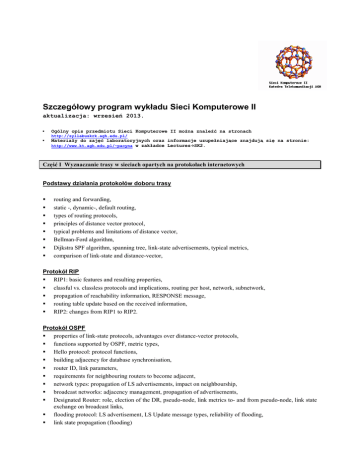 Szczegółowy program wykładu Sieci Komputerowe II aktualizacja: wrzesień 2013. Ogólny opis przedmiotu Sieci Komputerowe II można znaleźć na stronach http://syllabuskrk.agh.edu.pl/ Materiały do zajęć laboratoryjnych oraz informacje uzupełniające znajdują się na stronie: http://www.kt.agh.edu.pl/~pacyna w zakładce LecturesSK2. Część I Wyznaczanie trasy w sieciach opartych na protokołach internetowych Podstawy działania protokołów doboru trasy routing and forwarding, static -, dynamic-, default routing, types of routing protocols, principles of distance vector protocol, typical problems and limitations of distance vector, Bellman-Ford algorithm, Dijkstra SPF algorithm, spanning tree, link-state advertisements, typical metrics, comparison of link-state and distance-vector, Protokół RIP RIP1: basic features and resulting properties, classful vs. classless protocols and implications, routing per host, network, subnetwork, propagation of reachability information, RESPONSE message, routing table update based on the received information, RIP2: changes from RIP1 to RIP2. Protokół OSPF properties of link-state protocols, advantages over distance-vector protocols, functions supported by OSPF, metric types, Hello protocol: protocol functions, building adjacency for database synchronisation, router ID, link parameters, requirements for neighbouring routers to become adjacent, network types: propagation of LS advertisements, impact on neighbourship, broadcast networks: adjacency management, propagation of advertisements, Designated Router: role, election of the DR, pseudo-node, link metrics to- and from pseudo-node, link state exchange on broadcast links, flooding protocol: LS advertisement, LS Update message types, reliability of flooding, link state propagation (flooding) bringing-up adjacency on partitioned networks, Areas: backbone, non-backbone, area-border routers, naming areas, optimization of flooding, convergence problem, looping issues, choice of a path to a network in other area, cost computation, area definition examples, inverse masks (wildcard masks). address summarization, implications, LSA types, LS records in database. AS BR routers, Route redistribution, administrative distance, route preference including: intra-area, interarea routes, E1 and E2 routes. Protokół BGP evolution of the Internet and related problems, autonomous systems, AS types, domains vs. AS, AS names and name assignment, traffic types, customer-provider relationship, 3-tier Internet architecture, domains: properties of domains, consequences of domain-based organization of the internet – advantages and recent challenges, assumptions for BGP protocol design, vector-path concept, role of intra-domain and inter-domain routing protocol, combination of both to provide reachability, BGP speakers and peers, BGP sessions, interior-, exterior peering, iBGP, eBGP, ieBGP, operational differences between iBGP and eBGP, BGP route, UPDATE message: NLRI, AS PATH attribute types, routing information databases (RIBs) in a BGP router, policy engine, routing policies BGP decision process, learning, processing and advertising a prefix, next-hop reachability, selected attributes (MED, LOCAL_PREF, NEXT_HOP), Interdomain traffic engineering with BGP limitations of LOCAL_PREF and MED attributes współpraca protokołów routingu. Redystrybucja. Dystans administracyjny i jego wpływ na wybór najkorzystniejszej trasy. Zasady redystrybucji. methods to influence decision process such as, for example, AS path prepending and other. Część II. Sieci wydzielone BGP-MPLS Cechy charakterystyczne sieci wydzielonych i przeznaczenie Znaczenie protokołu BGP w realizacji usługi BGP-MPLS VPN, Znaczenie protokołu MPLS w realizacji usługi BGP-MPLS VPN, Rozszerzenia protokołu BGP pod kątem wsparcia sieci BGP-MPLS VPN, Rozgłaszanie adresów sieci, izolacja przestrzeni adresowych, tablice VRF Atrybuty Route target oraz Route distinquisher oraz ich zastosowanie. Część III. Migracja w kierunku sieci IPv6 background information: classful addressing, subnetting, CIDR, incurred problems, objectives for IPv6, IPv6 origins, comparison of IPv4 and IPv6, packet header structure, simplifications, extensions, options, IPv6 addressing: address space, address format, types, structure, motivation for structured address format, special addresses, current status of IPv4 and IPv6, multicast addresses: purpose, format prefix, scoping, flags, IP4-compatibility addresses, Neighbour Discovery Protocol: functions, NDP messages, stateless and statefull address autoconfiguration, MTU discovery, status of deployment and perspectives. Część IV Wsparcie dla mobilności w sieciach opartych na protokołach internetowych Protokoły wsparcia mobilności types of mobility, motivation for mobility, problem statement, mobility requirements, Mobile IPv4 Mobile IPv4: mobility agents, mobility basic scenario, functional assumptions in MIPv4 design, address binding, readdressing, readdressing types in visited network, MIPv4 operation, triangle routing, functions supported by MIPv4, Mobile IPv6 Mobile IPv6: architectural differences from MIPv4, integration with IPv4 and related standards, mobility-related functions for mobile terminal, new functions for home agent, Mobile IPv6 mobility scenario, binding update to home and correspondents, binding cache, enhanced security: return routability, home test, care-of test, seamless handover, changes in IPv6 due to mobility: binding cache, binding update list, home agent list, mobility headers, Fast Mobile IP Fast Mobile IPv6 (FMIP): handover latency, latency reasons, FMIP-specific optimizations, OAR—NAR tunnel setup, predictive mode, reactive mode. Proxy Mobile IP Fast Mobile IPv6 (FMIP): handover latency, mobility domains, intra-domain and inter-domain handoffs, PMIP-specific optimizations,