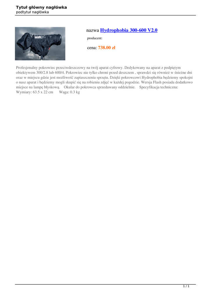 Tytuł główny nagłówka podtytuł nagłówka nazwa Hydrophobia 300-600 V2.0 producent: cena: 738.00 zł Profesjonalny pokrowiec przeciwdeszczowy na twój aparat cyfrowy. Dedykowany na aparat z podpiętym obiektywem 300/2.8 lub 600/4. Pokrowiec nie tylko chroni przed deszczem , sprawdzi się również w śnieżne dni oraz w miejscu gdzie jest możliwość zapiaszczenia sprzętu. Dzięki pokrowcowi Hydrophobia będziemy spokojni o nasz aparat i będziemy mogli skupić się na robieniu zdjęć w każdej pogodzie. Wersja Flash posiada dodatkowo miejsce na lampę błyskową. Okular do pokrowca sprzedawany oddzielnie. Specyfikacja techniczna: Wymiary: 63.5 x 22 cm Waga: 0.3 kg 1/1