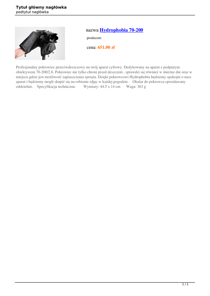 Tytuł główny nagłówka podtytuł nagłówka nazwa Hydrophobia 70-200 producent: cena: 651.00 zł Profesjonalny pokrowiec przeciwdeszczowy na twój aparat cyfrowy. Dedykowany na aparat z podpiętym obiektywem 70-200/2.8. Pokrowiec nie tylko chroni przed deszczem , sprawdzi się również w śnieżne dni oraz w miejscu gdzie jest możliwość zapiaszczenia sprzętu. Dzięki pokrowcowi Hydrophobia będziemy spokojni o nasz aparat i będziemy mogli skupić się na robieniu zdjęc w każdej pogodzie. Okular do pokrowca sprzedawany oddzielnie. Specyfikacja techniczna: Wymiary: 44.5 x 14 cm Waga: 363 g 1/1