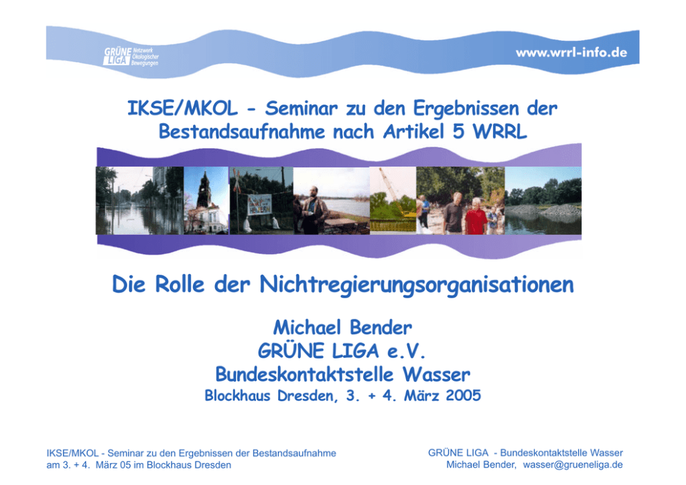 www.wrrl-info.de IKSE/MKOL - Seminar zu den Ergebnissen der Bestandsaufnahme nach Artikel 5 WRRL Die Rolle der Nichtregierungsorganisationen Michael Bender GRÜNE LIGA e.V. Bundeskontaktstelle Wasser Blockhaus Dresden, 3. + 4. März 2005 IKSE/MKOL - Seminar zu den Ergebnissen der Bestandsaufnahme am 3. + 4. März 05 im Blockhaus Dresden GRÜNE LIGA - Bundeskontaktstelle Wasser Michael Bender, [email protected] www.wrrl-info.de „Wasser ist keine übliche Handelsware, sondern ein ererbtes Gut, das geschützt, verteidigt und entsprechend behandelt werden muss.“ (Erwägungsgrundsatz 1 der Wasserrahmenrichtlinie) IKSE/MKOL - Seminar zu den Ergebnissen der Bestandsaufnahme am 3. + 4. März 05 im Blockhaus Dresden GRÜNE LIGA - Bundeskontaktstelle Wasser Michael Bender, [email protected] www.wrrl-info.de einige Kernpunkte bei der Umsetzung der Wasserrahmenrichtlinie Verbindung von WRRL und Naturschutz > Flussauen, Natura 2000 Verbindung von WRRL und Hochwasserschutz Abgleich WRRL und Landwirtschaft > EU-Förderpolitik, gute fachliche Praxis umfassende Öffentlichkeitsbeteiligung Ausbau und Unterhaltung von Wasserstraßen IKSE/MKOL - Seminar zu den Ergebnissen der Bestandsaufnahme am 3. + 4. März 05 im Blockhaus Dresden GRÜNE LIGA - Bundeskontaktstelle Wasser Michael Bender, [email protected] www.wrrl-info.de IKSE/MKOL - Seminar zu den Ergebnissen der Bestandsaufnahme am 3. + 4. März 05 im Blockhaus Dresden GRÜNE LIGA - Bundeskontaktstelle Wasser Michael Bender, [email protected] www.wrrl-info.de IKSE/MKOL - Seminar zu den Ergebnissen der Bestandsaufnahme am 3. + 4. März 05 im Blockhaus Dresden GRÜNE LIGA - Bundeskontaktstelle Wasser Michael Bender, [email protected] Bedeutende Flußeinzugsgebiete Europas www.wrrl-info.de Öffentlichkeitsbeteiligung sollte kleinräumiger organisiert werden, als auf Ebene der Flusseinzugsgebiete! Karte: Stephan Gunkel / ERN IKSE/MKOL - Seminar zu den Ergebnissen der Bestandsaufnahme am 3. + 4. März 05 im Blockhaus Dresden GRÜNE LIGA - Bundeskontaktstelle Wasser Michael Bender, [email protected] www.wrrl-info.de Wasserrahmenrichtlinie an der Elbe Österreich Polen Bericht 2005 Tschechien beigeordnet Land FGG (Teil) Bericht 2005 IKSE Bund Bericht 2005 Brüssel Brüssel Abstimmung, nicht Verantwortung Bericht 2005 Brüssel Abstimmung, Beschluss der nationalen Berichte 2005 durch Elberat und Umweltminister der 10 Bundesländer im Elbeeinzugsgebiet Land (Teil) Bericht 2005 Bund Bericht 2005 Brüssel verändert nach Liebau (Ministerium für Landwirtschaft und Umwelt Sachsen-Anhalt, 2004) IKSE/MKOL - Seminar zu den Ergebnissen der Bestandsaufnahme am 3. + 4. März 05 im Blockhaus Dresden GRÜNE LIGA - Bundeskontaktstelle Wasser Michael Bender, [email protected] www.wrrl-info.de Eider SchleiTrave WarnowPeene Tideelbe Ems Weserfluss Mittlere Elbe / Elde Havel Deltarhein Niederrhein FuldaDiemel Maas Saale Werra Mosel-Saar Mittelrhein Oberrhein Hochrhein Oder Main MuldeElbeSchwarze Elster Eger Neckar Donau Alpenrhein IKSE/MKOL - Seminar zu den Ergebnissen der Bestandsaufnahme Karte: Uwe Stephan am 3. + 4. März 05 im Blockhaus Dresden GRÜNE LIGA - Bundeskontaktstelle Wasser Michael Bender, [email protected] Bedeutung der Ufer und Auen für die Umweltziele www.wrrl-info.de 1. Guter ökologischer Zustand • Stoffretention • Lebensraum (die meisten heimischen Fischarten sind auf Auengewässer angewiesen – Laichzeit, Jugendstadien, Überwinterung) 2. Schutzziele in NATURA 2000-Gebieten 3. Erhaltungs- und Verbesserungsgebot für wasserabhängige Ökosysteme und Feuchtgebiete (Art. 1 WRRL) Hauptursachen für die „Gefährdung der Zielerreichung“ im „Bericht 2005“ (deutschlandweit): • • Nährstoffbelastung (v.a. Landwirtschaft) und Gewässerstruktur (v.a. Querbauwerke) IKSE/MKOL - Seminar zu den Ergebnissen der Bestandsaufnahme am 3. + 4. März 05 im Blockhaus Dresden GRÜNE LIGA - Bundeskontaktstelle Wasser Michael Bender, [email protected] www.wrrl-info.de Wo liegen im Referenzzustand die Grenzen des Wasserkörpers? > Der Wasserkörper umfasst hier auch die Aue! > Ohne jede Anbindung der Aue kann sich der Wasserkörper nicht im „guten Zustand“ befinden! Schwarze Elster bei Würdenhain (Brandenburg), 1847 und 1994 IKSE/MKOL - Seminar zu den Ergebnissen der Bestandsaufnahme am 3. + 4. März 05 im Blockhaus Dresden GRÜNE LIGA - Bundeskontaktstelle Wasser Michael Bender, [email protected] Bundeskontaktstelle Wasser www.wrrl-info.de DNR-Gesprächskreis Wasser Im Umweltdachverband Deutscher Naturschutzring (DNR) koordiniert die GRÜNE LIGA die wasserbezogene Facharbeit der Verbände, insbesondere zu EU-Richtlinien und deren Umsetzung in deutsches Recht. 7. WHG-Novelle LAWA-Musterverordnung Tochterrichtlinie GW-Schutz Artikelgesetz HWS Elbehochwasser 2002: Das Wasser strömt zwischen Dresden und Radebeul in einen alten Flußarm. Umweltverbände fordern seit langem, den Flüssen wo es möglich ist, mehr Raum zu geben. Dadurch könnten besiedelte Regionen besser geschützt werden. Foto: S. Gunkel IKSE/MKOL - Seminar zu den Ergebnissen der Bestandsaufnahme am 3. + 4. März 05 im Blockhaus Dresden GRÜNE LIGA - Bundeskontaktstelle Wasser Michael Bender, [email protected] Rechtliche Umsetzung - Stand Ende Nov. 2004 www.wrrl-info.de Landeswassergesetz Entwurf vorgelegt ? Stellungnahmen der Umweltverbände ? Verordnung zur Umsetzung der Anhänge II und V der WRRL Inkrafttreten Landeswassergesetz am Entwurf vorgelegt ? Stellungnahmen der Umweltverbände ? Verordnung inkraftgetreten am: BadenWürttemberg x BUND/NABU 22.12.2003 x BUND/NABU LNV Bayern x Bund Naturschutz 24.07.2003 LBV x Bund Naturschutz 16.03.2004 Berlin x BLN, GRÜNE LIGA x BLN 16.09.2004 Brandenburg x Landesbüro 29.06.2004 - 24.08.2004 Bremen x GNUU 18.12.2003 ? ? 24.02.2004 Hamburg x Keine Anhörung 04.02.2004 x Keine Anhörung 09.07.2004 Hessen x Anhörung läuft MecklemburgVorpommern ? IKSE/MKOL - Seminar zu den Ergebnissen der Bestandsaufnahme am 3. + 4. März 05 im Blockhaus Dresden - 30.