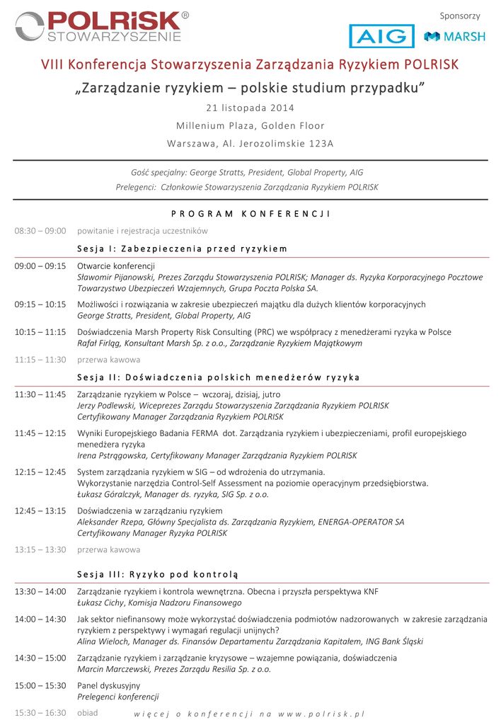 Sponsorzy VIII Konferencja Stowarzyszenia Zarządzania Ryzykiem POLRISK „Zarządzanie ryzykiem – polskie studium przypadku” 21 listopada 2014 Millenium Plaza, Golden Floor Warszawa, Al. Jerozolimskie 123A Gość specjalny: George Stratts, President, Global Property, AIG Prelegenci: Członkowie Stowarzyszenia Zarządzania Ryzykiem POLRISK P R O GRAM K O NF ERENCJ I 08:30 – 09:00 powitanie i rejestracja uczestników Sesja I: Zabezpieczenia przed ryzykiem 09:00 – 09:15 Otwarcie konferencji Sławomir Pijanowski, Prezes Zarządu Stowarzyszenia POLRISK; Manager ds. Ryzyka Korporacyjnego Pocztowe Towarzystwo Ubezpieczeń Wzajemnych, Grupa Poczta Polska SA. 09:15 – 10:15 Możliwości i rozwiązania w zakresie ubezpieczeń majątku dla dużych klientów korporacyjnych George Stratts, President, Global Property, AIG 10:15 – 11:15 Doświadczenia Marsh Property Risk Consulting (PRC) we współpracy z menedżerami ryzyka w Polsce Rafał Firląg, Konsultant Marsh Sp. z o.o., Zarządzanie Ryzykiem Majątkowym 11:15 – 11:30 przerwa kawowa Sesja II: Doświadczenia polskich menedżerów ryzyka 11:30 – 11:45 Zarządzanie ryzykiem w Polsce – wczoraj, dzisiaj, jutro Jerzy Podlewski, Wiceprezes Zarządu Stowarzyszenia Zarządzania Ryzykiem POLRISK Certyfikowany Manager Zarządzania Ryzykiem POLRISK 11:45 – 12:15 Wyniki Europejskiego Badania FERMA dot. Zarządzania ryzykiem i ubezpieczeniami, profil europejskiego menedżera ryzyka Irena Pstrągowska, Certyfikowany Manager Zarządzania Ryzykiem POLRISK 12:15 – 12:45 System zarządzania ryzykiem w SIG – od wdrożenia do utrzymania. Wykorzystanie narzędzia Control-Self Assessment na poziomie operacyjnym przedsiębiorstwa. Łukasz Góralczyk, Manager ds. ryzyka, SIG Sp. z o.o. 12:45 – 13:15 Doświadczenia w zarządzaniu ryzykiem Aleksander Rzepa, Główny Specjalista ds. Zarządzania Ryzykiem, ENERGA-OPERATOR SA Certyfikowany Manager Ryzyka POLRISK 13:15 – 13:30 przerwa kawowa Sesja III: Ryzyko pod kontrolą 13:30 – 14:00 Zarządzanie ryzykiem i kontrola wewnętrzna. Obecna i przyszła perspektywa KNF Łukasz Cichy, Komisja Nadzoru Finansowego 14:00 – 14:30 Jak sektor niefinansowy może wykorzystać doświadczenia podmiotów nadzorowanych w zakresie zarządzania ryzykiem z perspektywy i wymagań regulacji unijnych? Alina Wieloch, Manager ds. Finansów Departamentu Zarządzania Kapitałem, ING Bank Śląski 14:30 – 15:00 Zarządzanie ryzykiem i zarządzanie kryzysowe – wzajemne powiązania, doświadczenia Marcin Marczewski, Prezes Zarządu Resilia Sp. z o.o. 15:00 – 15:30 Panel dyskusyjny Prelegenci konferencji 15:30 – 16:30 obiad więcej o konferencji na www.polrisk.pl Zgłoszenie na VIII Konferencję Stowarzyszenia Zarządzania Ryzykiem POLRISK „Zarządzanie ryzykiem – polskie studium przypadku” 21 listopada 2014, Warszawa Dane do faktury: Nazwa firmy / instytucji: Adres: NIP: Osoba koordynująca zgłoszenie: telefon / email: Dane uczestników: (1) imię i nazwisko: stanowisko: komórka organizacyjna: adres email: nr telefonu: (2) imię i nazwisko: stanowisko: komórka organizacyjna: adres email: nr telefonu: Koszt udziału *): Członkowie POLRISK, którzy posiadają opłacone składki za 2014 rok lub nowo przyjmowani członkowie POLRISK Pozostali uczestnicy Konferencja 21.11.2014 200 zł + 23% VAT 1000 zł + 23% VAT Tak, jestem członkiem Stowarzyszenia Zarządzania Ryzykiem POLRISK Nie jestem członkiem Stowarzyszenia POLRISK, ale jestem zainteresowany otrzymaniem informacji nt. warunków członkostwa i zaproszenia *) Koszt zawiera udział jednej osoby w konferencji zgodnie ze zgłoszeniem, udział w wykładach i catering. Zniżki nie sumują się. Warunkiem uczestnictwa jest odesłanie na adres [email protected] skanu wypełnionego i podpisanego formularza zgłoszeniowego wraz potwierdzeniem wykonania przelewu na konto nr PL 28 1160 2202 0000 0000 8427 1475. W tytule przelewu koniecznie należy wpisać „VIII Konferencja POLRISK, imię i nazwisko, firma” uczestnika. Przesłanie formularza stanowi zawarcie wiążącej umowy pomiędzy zgłaszającym a Stowarzyszeniem Zarządzania Ryzykiem POLRISK. Ewentualną rezygnację z udziału należy przesłać na adres [email protected]. W przypadku rezygnacji z udziału w terminie krótszym niż 7 dni przed konferencją, uczestnik pozostaje obciążony opłatą w wysokości 100%. Nieodwołanie przesłanego zgłoszenia i niewzięcie udziału w konferencji powoduje obciążenie pełnymi kosztami udziału. Niedokonanie wpłaty nie jest jednoznaczne z rezygnacją z udziału. Możliwe jest zastępstwo zgłoszonego uczestnika. Stowarzyszenie Zarządzania Ryzykiem POLRISK zastrzega sobie możliwość odwołania konferencji bez podania przyczyn i zastrzega sobie prawo do zmian w programie. Przesłanie zgłoszenia oznacza akceptację warunków uczestnictwa i zgodę na przetwarzanie przez Stowarzyszenie Zarządzania Ryzykiem POLRISK danych osobowych zgłoszonych uczestników w celach promocji i marketingu działalności prowadzonej przez Stowarzyszenie i partnerów konferencji. Wyrażający zgodę na przetwarzanie danych mają prawo kontroli i weryfikacji przetwarzania danych, które ich dotyczą oraz do odwołania udzielonej zgody. ............................................................................................................................................................................. Imię, nazwisko, stanowisko i podpis osoby akceptującej zgłoszenie