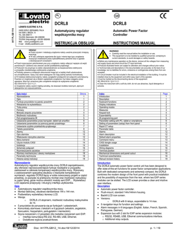 I417 PL GB 1114 PL DCRL8 DCRL8 Automatyczny regulator współczynnika mocy Automatic Power Factor Controller INSTRUKCJA OBSŁUGI INSTRUCTIONS MANUAL UWAGA! ● Przed użyciem i instalacją urządzenia należy uważnie przeczytać niniejszą instrukcję. ● W celu uniknięcia zagrożenia dla życia i mienia tego typu urządzenia muszą być instalowane przez wykwalifikowany personel oraz w zgodzie z obowiązującymi przepisami. ● Przed rozpoczęciem jakichkolwiek prac przy urządzeniu należy odłączyć napięcie od wejść pomiarowych i zasilania oraz zewrzeć zaciski przekładnika prądowego. ● Producent nie przyjmuje na siebie odpowiedzialności za bezpieczeństwo elektryczne w przypadku niewłaściwego użytkowania urządzenia. ● Produkty opisane w niniejszym dokumencie mogą być w każdej chwili udoskonalone lub zmodyfikowane. Opisy oraz dane katalogowe nie mają żadnej wartości kontraktowej. ● W instalacji elektrycznej budynku należy uwzględnić przełącznik lub wyłącznik automatyczny. Powinien on znajdować się w bliskim sąsiedztwie urządzenia i być łatwo osiągalny przez operatora. Musi być oznaczony jako urządzenie służące do wyłączania urządzenia: IEC/ EN 61010-1 § 6.11.2.1. ● Urządzenie należy czyścić miękką szmatką, nie stosować środków ściernych, płynnych detergentów lub rozpuszczalników. Spis treści Wprowadzenie Opis Funkcje przycisków na panelu przednim Wskazania na wyświetlaczu Tryby pracy Pomiary Blokada zespołu przycisków Możliwości rozbudowy Port programowania IR Ustawianie parametrów przez komputer, tablet lub smartfon Ustawianie parametrów za pomocą panelu przedniego Ustawianie szybkie przekładnika prądowego Tabela parametrów Alarmy Opis alarmów Właściwości domyślne alarmów Menu komend Użycie modułu CX02 Instalacja Schematy połączeń Rozmieszczenie zacisków Wymiary mechaniczne i otwory montażowe Parametry techniczne Historia wersji instrukcji Strona 1 1 2 2 2 3 4 5 5 6 6 7 8 12 12 12 13 14 14 16 17 18 18 19 Wprowadzenie Automatyczny regulator współczynnika mocy DCRL8 zaprojektowano, aby oferować najnowocześniejsze funkcje niezbędne w przypadku zastosowań w zakresie kompensacji współczynnika mocy. Wykonany z zastosowaniem specjalnej obudowy o niezwykle kompaktowych wymiarach, regulator DCRL8 łączy w sobie nowoczesny projekt w części przedniej, co pozwala na praktyczny montaż oraz możliwość rozbudowy w części tylnej, gdzie można umieścić moduły serii EXP.... Wyświetlacz LCD zapewnia przejrzysty i intuicyjny interfejs użytkownika. Opis Automatyczny regulator współczynnika mocy. Montaż tablicowy, obudowa standardowa 144 x 144 mm. Podświetlany wyświetlacz ikonowy LCD. Wersje: o DCRL8 z 8 stopniami, możliwość rozbudowy maksymalnie do 14. 5 przycisków do poruszania się po funkcjach i ustawieniach. Komunikaty alarmowe z tekstami w 6 językach (włoskim, angielskim, francuskim, hiszpańskim, portugalskim i niemieckim). Szyna rozszerzeń z 2 gniazdami dla modułów rozszerzeń serii EXP: o Interfejs komunikacji RS-232, RS-485, USB, Ethernet. o Dodatkowe wyjścia przekaźnikowe. Doc: I417PLGB12_14.doc18/12/2014 WARNING! Carefully read the manual before the installation or use. This equipment is to be installed by qualified personnel, complying to current standards, to avoid damages or safety hazards. ● Before any maintenance operation on the device, remove all the voltages from measuring and supply inputs and short-circuit the CT input terminals. ● Products illustrated herein are subject to alteration and changes without prior notice. ● Technical data and descriptions in the documentation are accurate, to the best of our knowledge, but no liabilities for errors, omissions or contingencies arising there from are accepted. ● A circuit breaker must be included in the electrical installation of the building. It must be installed close by the equipment and within easy reach of the operator. It must be marked as the disconnecting device of the equipment: IEC /EN 61010-1 § 6.11.2.1. ● Clean the instrument with a soft dry cloth; do not use abrasives, liquid detergents or solvents. Index Introduction Description Keyboard functions Display indications Operating modes Measures Keypad lock Expandability IR programming port Parameter setting with PC, tablet or smartphone Setting of parameters (setup) from front panel Rapid CT setup Parameter table Alarms Alarm description Default alarm properties Command menu CX02 dongle usage Installation Wiring diagrams Terminal position Mechanical dimensions and panel cutout Technical carachteristics Manual revision history Page 1 1 2 2 2 3 4 5 5 6 6 7 8 12 12 12 13 14 14 16 17 18 18 19 Introduction The DCRL8 automatic power factor control unit has been designed to offer state-of-the-art functions for power factor compensation applications. Built with dedicated components and extremely compact, the DCRL8 combines the modern design of the front panel with practical installation and the possibility of expansion from the rear, where two EXP series modules can be slotted. The LCD screen provides a clear and intuitive user interface. Description Automatic power factor controller. Flush-mount, standard 144x144mm housing. Backlit LCD icon screen. Versions: o DCRL8 with 8 relays, expandable to 14 max. 5 navigation keys for function and settings. Alarm messages in 6 languages (English, Italian, French, Spanish, Portuguese, German). Expansion bus with 2 slot for EXP series expansion modules: o RS232, RS485, USB, Ethernet communications interface. o Additional relay outputs. p. 1 / 19 Wysoka dokładność pomiarów dokonywanych metodą rzeczywistych wartości skutecznych (TRMS). Szeroka gama dostępnych pomiarów, włącznie z THD napięcia i prądu, z analizą zawartości poszczególnych wyższych harmonicznych, aż do 15. w kolejności. Wejście pomiaru napięcia separowane od zasilania, możliwość stosowania z przekładnikiem napięciowym w apli
