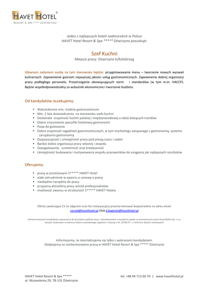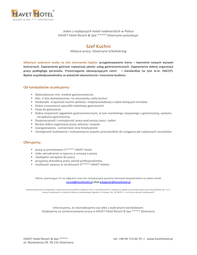 Jeden z najlepszych hoteli nadmorskich w Polsce HAVET Hotel Resort & Spa ***** Dźwirzyno poszukuje: Szef Kuchni Miejsce pracy: Dźwirzyno k/Kołobrzeg Głównym zadaniem osoby na tym stanowisku będzie: przygotowywanie menu – tworzenie nowych wyzwań kulinarnych. Zapewnienie gościom najwyższej jakości usług gastronomicznych. Zapewnienie dobrej organizacji pracy podległego personelu. Przestrzeganie obowiązujących norm i standardów (w tym m.in. HACCP). Będzie współodpowiedzialny za wskaźniki ekonomiczne i tworzenie budżetu. Od kandydatów oczekujemy: Wyksztalcenie min. średnie gastronomiczne Min. 2 lata doświadczenia na stanowisku szefa kuchni Doskonała znajomość kuchni polskiej i międzynarodowej a także bieżących trendów Dobre zrozumienia specyfiki hotelowej gastronomii Pasja do gotowania Dobra znajomość zagadnień gastronomicznych, w tym marketingu związanego z gastronomią, systemu zarządzania gastronomią Dyspozycyjność i umiejętność pracy pod presją czasu i zadań Bardzo dobra organizacja pracy własnej i zespołu Zaangażowanie, sumienność oraz kreatywność Umiejętność budowania i motywowania zespołu pracowników do osiągania jak najlepszych rezultatów Oferujemy: pracę w prestiżowym 5***** HAVET Hotel stałe zatrudnienie w oparciu o umowę o pracę niezbędne narzędzia do pracy przyjazną atmosferę pracy wśród profesjonalistów możliwość awansu w strukturach 5***** HAVET Hotelu Oferty zawierające CV ze zdjęciem oraz list motywacyjny prosimy kierować bezpośrednio na adres email: [email protected] i/lub [email protected] Zainteresowanych kandydatów zapraszamy do przesłania aplikacji wraz z oświadczeniem o wyrażeniu zgody na przetwarzanie przez Grand Baltic Sp. z o.o. danych osobowych w zakresie doboru zawodowego /zgodnie z Ustawą z dn. 29.08.97 r. o ochronie danych osobowych/ Informujemy, że skontaktujemy się tylko z wybranymi kandydatami. Dziękujemy za zainteresowanie pracą w HAVET Hotel Resort & Spa ***** Dźwirzyno HAVET Hotel Resort & Spa ***** ul. Wyzwolenia 29, 78-131 Dźwirzyno tel. +48 94 713 60 70 | www.havethotel.pl