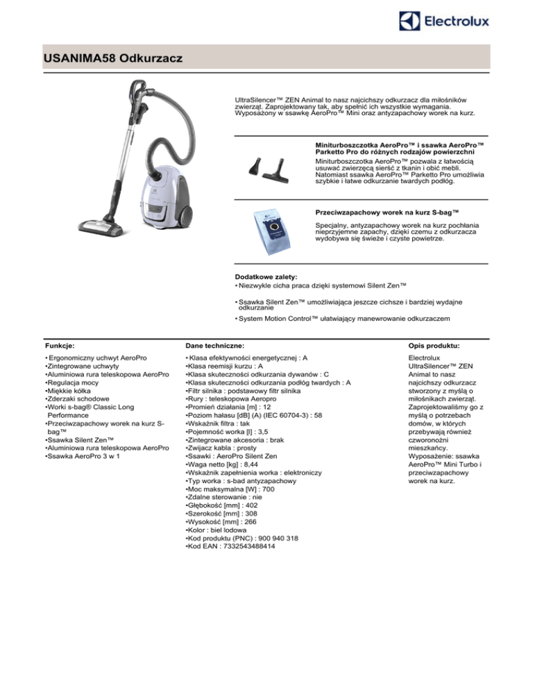 USANIMA58 Odkurzacz UltraSilencer™ ZEN Animal to nasz najcichszy odkurzacz dla miłośników zwierząt. Zaprojektowany tak, aby spełnić ich wszystkie wymagania. Wyposażony w ssawkę AeroPro™ Mini oraz antyzapachowy worek na kurz. Miniturboszczotka AeroPro™ i ssawka AeroPro™ Parketto Pro do różnych rodzajów powierzchni Miniturboszczotka AeroPro™ pozwala z łatwością usuwać zwierzęcą sierść z tkanin i obić mebli. Natomiast ssawka AeroPro™ Parketto Pro umożliwia szybkie i łatwe odkurzanie twardych podłóg. Przeciwzapachowy worek na kurz S-bag™ Specjalny, antyzapachowy worek na kurz pochłania nieprzyjemne zapachy, dzięki czemu z odkurzacza wydobywa się świeże i czyste powietrze. Dodatkowe zalety: • Niezwykle cicha praca dzięki systemowi Silent Zen™ • Ssawka Silent Zen™ umożliwiająca jeszcze cichsze i bardziej wydajne odkurzanie • System Motion Control™ ułatwiający manewrowanie odkurzaczem Funkcje: Dane techniczne: Opis produktu: • Ergonomiczny uchwyt AeroPro •Zintegrowane uchwyty •Aluminiowa rura teleskopowa AeroPro •Regulacja mocy •Miękkie kółka •Zderzaki schodowe •Worki s-bag® Classic Long Performance •Przeciwzapachowy worek na kurz Sbag™ •Ssawka Silent Zen™ •Aluminiowa rura teleskopowa AeroPro •Ssawka AeroPro 3 w 1 • Klasa efektywności energetycznej : A •Klasa reemisji kurzu : A •Klasa skuteczności odkurzania dywanów : C •Klasa skuteczności odkurzania podłóg twardych : A •Filtr silnika : podstawowy filtr silnika •Rury : teleskopowa Aeropro •Promień działania [m] : 12 •Poziom hałasu [dB] (A) (IEC 60704-3) : 58 •Wskaźnik filtra : tak •Pojemność worka [l] : 3,5 •Zintegrowane akcesoria : brak •Zwijacz kabla : prosty •Ssawki : AeroPro Silent Zen •Waga netto [kg] : 8,44 •Wskaźnik zapełnienia worka : elektroniczy •Typ worka : s-bad antyzapachowy •Moc maksymalna [W] : 700 •Zdalne sterowanie : nie •Głębokość [mm] : 402 •Szerokość [mm] : 308 •Wysokość [mm] : 266 •Kolor : biel lodowa •Kod produktu (PNC) : 900 940 318 •Kod EAN : 7332543488414 Electrolux UltraSilencer™ ZEN Animal to nasz najcichszy odkurzacz stworzony z myślą o miłośnikach zwierząt. Zaprojektowaliśmy go z myślą o potrzebach domów, w których przebywają również czworonożni mieszkańcy. Wyposażenie: ssawka AeroPro™ Mini Turbo i przeciwzapachowy worek na kurz.
