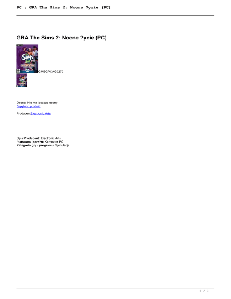 PC : GRA The Sims 2: Nocne ?ycie (PC) GRA The Sims 2: Nocne ?ycie (PC) GMEGPCAG0270 Ocena: Nie ma jeszcze oceny Zapytaj o produkt ProducentElectronic Arts Opis Producent: Electronic Arts Platforma (sprz?t): Komputer PC Kategoria gry / programu: Symulacja 1 / 1 Powered by TCPDF (www.tcpdf.org)