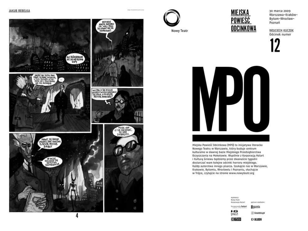 jakub rebelka design: Pionty/brothersinarms.com.pl Miejska Powieść Odcinkowa 30 marca 2009 Warszawa-KrakówBytom-WrocławPoznań wojciech kuczok Odcinek numer 12 Miejska Powieść Odcinkowa (MPO) to inicjatywa literacka Nowego Teatru w Warszawie, który buduje centrum kulturalne w dawnej bazie Miejskiego Przedsiębiorstwa Oczyszczania na Mokotowie. Wspólnie z Korporacją Ha!art i Kulturą Gniewu będziemy przez dwanaście tygodni dostarczać wam kolejne odcinki horroru miejskiego. Każdy autorstwa innego pisarza. Szukajcie nas w Warszawie, Krakowie, Bytomiu, Wrocławiu i Poznaniu, słuchajcie w Trójce, czytajcie na stronie www.nowyteatr.org wydawcy: Nowy Teatr Korporacja Ha!art 4 patroni medialni: – Rozpierducha! – rzekł Jan Majteczko, wzięty malarz katastrofista, którego sławę i majętność ukonstytuował cykl wizji apokalipsy. Te ponure płótna cieszyły się powszechną atencją. Choć wściekle utalentowany, był jednak objęty środowiskową anatemą ze względu na mizantropię i narcyzm, miał też na pieńku z krytyką, bo jego najsłynniejszym i najlepiej opłaconym happeningiem był występ w telewizyjnej reklamie masła – takiego targnięcia się na etos artysty nie mogły znieść ani zrzeszenia pędzlimoczków i bohomaziarzy, ani stowarzyszenia pismaków w sztuce się specjalizujących. Kochany przez marszandów i kolekcjonerów tym silniej, im wyraźniej nimi gardził, był jedną z tych osób, których spotkanie „na mieście” uchodziło za wydarzenie, a jeśli komuś udało się zamienić z nim kilka zdań, mógł się czuć wyróżniony. – Brzydkie miasto brzydko się wali. A jacy ludzie szpetnie ruchliwi. Tego się nawet nie da namalować – skrzywił się, wyciągnął z wymiętej paczki ostatniego papierosa, przeszukał kieszenie i spytał mnie o ogień. – Panie Janku – odpowiedziałem – miło mi pana poznać, niestety nie mam przy sobie zapalniczki. Ale ognia mamy tu pod dostatkiem. – Chłopak, nie odpalam papierosów od ogni piekielnych, bo to przynosi pecha. Nargili, dotąd milczący z wrażenia, otworzył usta, ale nim zdążył coś powiedzieć, eksplodował ogniem i po krótkiej szamotaninie spłonął. Nie powiem, że nie zrobiło to na mnie wrażenia. Majteczko ze spokojem dłubał w zębach. – Widzisz? Twój kolega musiał coś przeskrobać. A może po prostu zebrało mu się za dużo drobnych, ale regularnie popełnianych łajdactw. – Więc pan też ma swoją teorię na temat bieżących wydarzeń. – Teorię? – Majteczko zmierzył mnie swym spojrzeniem. – Chłopak, ja jestem jedynym praktykiem, ba, miłośnikiem końców świata. Mam od samego Felka Mefisto akredytację na wszystkie Sądy Ostateczne w każdym ze światów, w zamian muszę je malować. Czyś nie słyszał o moich piekielnych zdolnościach? – Tak, ale nie wiedziałem, że pan maluje z natury. A dużo jest tych światów? Bardzo się różnią od naszego? – Za dużo pytasz. W piekle i tak wszystkiego się dowiesz… Czekaj, przejdź dwa kroki do tyłu. Jakbyś tak postał parę minut, to sobie naszkicuję, z tymi ruinami w tle, może coś z tego będzie. – Panie Majteczko, nie wiem, czy to jest dla mnie najlepszy moment, żeby panu pozować. W innych warunkach pewnie byłbym zaszczycony… – W innych warunkach ten zaszczyt by cię nie spotkał. Poza tym dla ciebie nie będzie już stosownych momentów, do niczego. Nie rozumiesz, że to jest bezdyskusyjny koniec, a ty chcesz uciekać? Popatrz na tych ludzi, nikt nie wierzy, że to nie jest bombardowanie, które można przeczekać. W rzeczy samej, tam i nazad biegały żywe pochodnie, dopalając się ku przerażeniu tych, którzy tymczasem z nieznanej sobie przyczyny wciąż istnieli. Zmęczony nie miałem sił protestować, kiedy Majteczko ustawił sztalugę i nakazał, żebym się nie ruszał, po czym zaczął malować. – Może podzieli się pan doświadczeniami? Wie pan, co się wydarzy? Wszyscy grzesznicy się spalą, a po resztę przyjdą aniołowie? – Prawie się zgadza. Spróbuj stać spokojnie. Po resztę przyjdą diabły. Na razie dokonuje się wstępna dezynsekcja: ci, którzy grzeszyli bezmyślnie, są eliminowani, jak twój koleżka. To dotyczy większości ludzi, dlatego musi to trochę potrwać. Prawdziwy spektakl rozegra się później, gdy na ziemi zostaną tylko największe skurwysyny. Może uda ci się doczekać, to sam zobaczysz. – A jakieś niebo w ogóle istnieje? – Nie. Jakby na zaprzeczenie jego słów coś w górze zaczęło zgrzytać i nagle ociężale opuszczać się zaczęły ku dołowi liczne drabiny. Okolica wydawała się wyludniona, bo ci, których ogień oszczędził, schowali się wśród zgliszczy. Teraz jęli się wynurzać z zakamarów i wiedzieni nadzieją na zbawienie, zmierzali w stronę drabin. – Zaczęło się. Stój i nie ruszaj się; dopóki mi pozujesz, jesteś bezpieczny. – Majteczko zanurzył pędzel w czerwonej farbie i zatrzymał rękę przed płótnem, jakby czekając na natchnienie. – Chodźcie. Kiedy szeptał te słowa, grupki ludzi, idących w stronę drabin, zaczęły się rozbiegać w panice, bo diabelska armia przystąpiła do ataku – żal było patrzeć na tę nierówną walkę, czorty były nieziemsko zwinne i dopadały każdego nieszczęśnika po to, by stosować najwymyślniejsze tortury, spośród których kanoniczne: piłowanie, skalpowanie, smołowanie etc. wydawały się najłagodniejsze. Oto bowiem największym zainteresowaniem szatańskiej zgrai cieszył się anus, nadziewany czym popadnie, od kutasów diabelskich, przez dzidy, szpikulce, po dmuchawy, którymi pompowano w jelita ofiar gorące powietrze. Gdy drabiny były już blisko ziemi, szarpanina zaczęła się wzmagać; ci, których diabły jeszcze nie dopadły, próbowali zdeptać się wzajem i wspinać po sobie, byle tylko sięgnąć najniższego szczebla. Nagle grupa tłocząca się pod jedną z drabin została staranowana przez samochód, wyskoczyła z niego gr