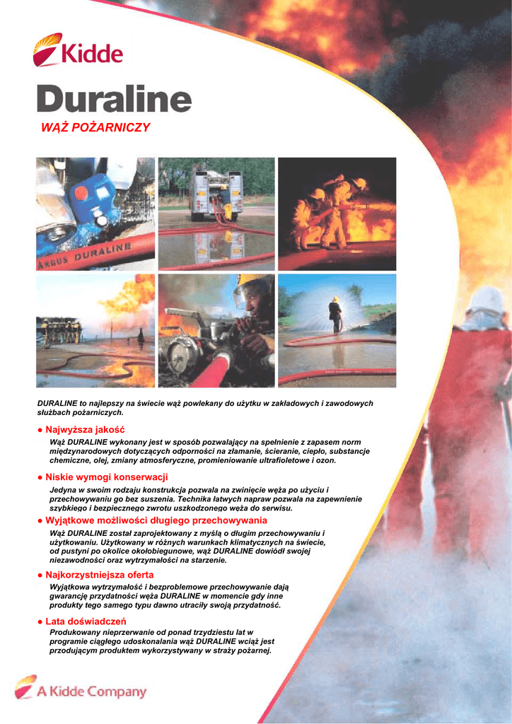WĄŻ POŻARNICZY DURALINE to najlepszy na świecie wąż powlekany do użytku w zakładowych i zawodowych służbach pożarniczych. ● Najwyższa jakość Wąż DURALINE wykonany jest w sposób pozwalający na spełnienie z zapasem norm międzynarodowych dotyczących odporności na złamanie, ścieranie, ciepło, substancje chemiczne, olej, zmiany atmosferyczne, promieniowanie ultrafioletowe i ozon. ● Niskie wymogi konserwacji Jedyna w swoim rodzaju konstrukcja pozwala na zwinięcie węża po użyciu i przechowywaniu go bez suszenia. Technika łatwych napraw pozwala na zapewnienie szybkiego i bezpiecznego zwrotu uszkodzonego węża do serwisu. ● Wyjątkowe możliwości długiego przechowywania Wąż DURALINE został zaprojektowany z myślą o długim przechowywaniu i użytkowaniu. Użytkowany w różnych warunkach klimatycznych na świecie, od pustyni po okolice okołobiegunowe, wąż DURALINE dowiódł swojej niezawodności oraz wytrzymałości na starzenie. ● Najkorzystniejsza oferta Wyjątkowa wytrzymałość i bezproblemowe przechowywanie dają gwarancję przydatności węża DURALINE w momencie gdy inne produkty tego samego typu dawno utraciły swoją przydatność. ● Lata doświadczeń Produkowany nieprzerwanie od ponad trzydziestu lat w programie ciągłego udoskonalania wąż DURALINE wciąż jest przodującym produktem wykorzystywany w straży pożarnej. Specyfikacja techniczna Średnica czerwony Kolor standardowy * czerwony czerwony czerwony Waga Średnica zwoju ** Średnie ciśnienie rozrywające [bar] Maksymalne ciśnienie robocze [bar] *** Zakres temperatur O używalności [ C] War. norm Środ. chłodn. * Inne kolory dostępne na życzenie ** Z wyłączeniem nasad pożarowych *** Lub maksymalne ciśnienie robocze nasad, jest ono niższe Zastosowanie najnowszej technologii specjalnie formułowanej gumy wysokiej jakości wtłoczonej w osłonę z włókien poliamidu pozwoliło na uzyskanie konstrukcji odpornej na złamanie i starzenie materiału. Węże produkowane są zgodnie z normą BS EN ISO 9001:1994 dotyczącą jakości zarządzania. Trudnodostępne materiały, składniki jak również ostateczny produkt przechodzą rygorystyczne testy aby zapewnić najwyższą jakość produktu. Typowe zastosowania ● Straże pożarne ● Kompleksy chemiczne i petrochemiczne ● Lotniska wewnętrzne i międzynarodowe ● Bazy wojskowe ● Elektrownie ● Porty i terminale ● Porty żeglugi handlowej Dopuszczenia Brytyjska norma BS 6391 Type 3 Zgodność z UL 19 UK Maritime & Coastguard Agency DET Norske Veritas Niemieka norma DIN 14811 Szwedzka norma SS2840 Norweska norma NS 4017/8 Szwajcarska SFV 2 Dostępny szeroki wybór kolektorów i innego osprzętu złączy, Angus Fire prowadzi ciągły program doskonalenia produkcji. W związku z powyższym zastrzega sobie prawo do wprowadzania zmian bez wcześniejszego uprzedzenia. Uprasza się o kontakt z dystrybutorem w celu upewnienia się o użyciu właściwych kart katalogowych. REF: 5285/3 Angus Fire 08.2003