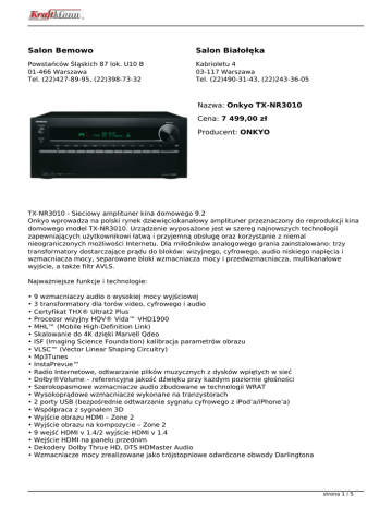 Salon Bemowo Salon Białołęka Powstańców Śląskich 87 lok. U10 B 01-466 Warszawa Tel. (22)427-89-95, (22)398-73-32 Kabrioletu 4 03-117 Warszawa Tel. (22)490-31-43, (22)243-36-05 Nazwa: Onkyo TX-NR3010 Cena: 7 499,00 zł Producent: ONKYO TX-NR3010 - Sieciowy amplituner kina domowego 9.2 Onkyo wprowadza na polski rynek dziewięciokanałowy amplituner przeznaczony do reprodukcji kina domowego model TX-NR3010. Urządzenie wyposażone jest w szereg najnowszych technologii zapewniających użytkownikowi łatwą i przyjemną obsługę oraz korzystanie z niemal nieograniczonych możliwości Internetu. Dla miłośników analogowego grania zainstalowano: trzy transformatory dostarczające prądu do bloków: wizyjnego, cyfrowego, audio niskiego napięcia i wzmacniacza mocy, separowane bloki wzmacniacza mocy i przedwzmacniacza, multikanałowe wyjście, a także filtr AVLS. Najważniejsze funkcje i technologie: • • • • • • • • • • • • • • • • • • • • • • 9 wzmacniaczy audio o wysokiej mocy wyjściowej 3 transformatory dla torów video, cyfrowego i audio Certyfikat THX® Ultrat2 Plus Proceosr wizyjny HQV® Vida™ VHD1900 MHL™ (Mobile High-Definition Link) Skalowanie do 4K dzięki Marvell Qdeo ISF (Imaging Science Foundation) kalibracja parametrów obrazu VLSC™ (Vector Linear Shaping Circuitry) Mp3Tunes InstaPrevue™ Radio Internetowe, odtwarzanie plików muzycznych z dysków wpiętych w sieć Dolby®Volume – referencyjna jakość dźwięku przy każdym poziomie głośności Szerokopasmowe wzmacniacze audio zbudowane w technologii WRAT Wysokoprądowe wzmacniacze wykonane na tranzystorach 2 porty USB (bezpośrednie odtwarzanie sygnału cyfrowego z iPod’a/iPhone’a) Współpraca z sygnałem 3D Wyjście obrazu HDMI – Zone 2 Wyjście obrazu na kompozycie – Zone 2 9 wejść HDMI v 1.4/2 wyjście HDMI v 1.4 Wejście HDMI na panelu przednim Dekodery Dolby Thrue HD, DTS HDMaster Audio Wzmacniacze mocy zrealizowane jako trójstopniowe odwrócone obwody Darlingtona strona 1 / 5 • • • • • • • • • • • • • • • Niezależne i izolowane bloki: wzmacniacza mocy i przedwzmacniacza Cyfrowy podział pasma w zwrotnicy Duże wejścia (odstęp 19mm) dla gramofonu i CD/TV Dyferencyjny tryb pracy DAC dla kanałów przednich Audyssey DSX™ i Dolby® Pro Logic® IIz DTS Neo:X™ Zone 2/3 (wyjście liniowe i głośnikowe) Moc 9x200W/6Ω Regulacja barwy tonu dla każdego kanału (Bass/Treble) Cztery wyjścia na subwoofery niezależną regulacją parami Praca z głośnikami 4Ω Wyjście Pre-Out 11.4 Wejście gramofonowe Wyjścia głośnikowe usytuowane w jednej linii Pobór mocy 1010W MHL™ (Mobile High-Definition Link) zapewnia reprodukcję sygnału zawierającego obraz 1080p i dźwięk 7.1, który dostarczony jest do wejścia HDMI umieszczonego na panelu przednim amplitunera z dowolnego przenośnego urządzenia współpracującego z tą technologią. Technologia zapewnia ładowanie i sterowanie smartfona. Technologia InstaPrevue™ zapewnia wyświetlanie w podglądach (PiP) sygnałów wizyjnych pochodzących ze źródeł dopiętych do wejść HDMI. Ułatwia to znacznie ustalenie do którego wejścia przyporządkowane jest konkretne źródło, pozwala także na błyskawiczne przełączanie między źródłami (łącznie z dźwiękiem). Umiejscowienie podglądów na ekranie może być wybrane z opcji: lewa strona, góra, prawa strona, dół. Onkyo TX-NR3010 posiada połączenie z Internetem (bezprzewodowo z opcjonalną przystawką UWF-1), a także z plikami muzycznymi znajdującymi się na dyskach wpiętych w sieć (odtwarza pliki: MP3, WMA, WMA Lossless, FLAC, WAV, Ogg Vorbis, AAC, LPCM). Dzięki dostępowi do sieci możliwe jest korzystanie z radia internetowego, a także możliwy jest odbiór ulubionej muzyki z serwisów umieszczonych w chmurze takich jak: Spotify, AUPEO!, Simfy, vTuner czy MP3tunes. Dostęp do stacji internetowych i serwerów muzycznych uzależniony jest od miejsca lokalizacji użytkownika. Połączenie z Internetem umożliwia także unowocześnienie oprogramowania. Amplituner posiada prestiżowy certyfikat THX Ultra2 Plus™, który świadczy o tym, że urządzenie zapewnia odtwarzanie filmowej ścieżki dźwiękowej ze wzorcową jakością i wysoką głośnością (110dB), w pomieszczeniach o powierzchni do 35m2 (zakładając wysokość 2.5m). Certyfikat THX nadawany jest urządzeniom domowym, ale odnajdziemy go także w kilku tysiącach perfekcyjnie nagłośnionych sal kinowych na całym świecie. Dziewięć wejść HDMI v 1.4 z 3D i 2 wyjścia zapewniają doskonałą integrację urządzeń takich jak odtwarzacz Blu-ray Disc, tuner satelitarny czy konsola gier. Łącze wyjściowe HDMI MAIN wyposażone jest w technologię ARC (kanał powrotny) dzięki czemu można słuchać z bardzo dobrą jakością sygnału audio z telewizora, a sygnał wizyjny z wyjścia HDMI SUB może być dostarczony do Zone 2. W TX-NR3010 zastosowano zaawansowany technologicznie procesor wizyjny HQV® Vida™ VHD1900, który potrafi wygładzić każdy obraz, a Dodatkowo amplituner wyposażony jest w procesor wizyjny Marvell Qdeo, który potrafi przeskalować sygnał z HDMI do postaci 4K (3840x 2160). Dostępna jest także rozbudowana regulacja parametrów obrazu ISF (Imaging Science Foundation). Pilot zdalnego sterowania Onkyo zawiera przycisk „Q” pod którym ukryte są regulacje podstawowych parametrów amplitunera umieszczone na przeźroczystym tle tak by nie przeszkadzać w oglądaniu obrazu. Opcja nazywa się Quick Setup. Ułatwia to regulację urządzenia czy chwilową zmianę parametrów. Funkcja dostępna na wyjściu HDMI. strona 2 / 5 Na panelu frontowym amplitunera odnajdziemy port USB (drugi na panelu tylnym) do którego możemy doprowadzić dźwięk cyfrowy z iPod’a/iPhone’a lub pamięci flash. Onkyo udostępnia aplikacje: „Onkyo Remote App 2 for iPod touch/iPhone”*¹ oraz „Onkyo Remote for Android”*² które zapewn