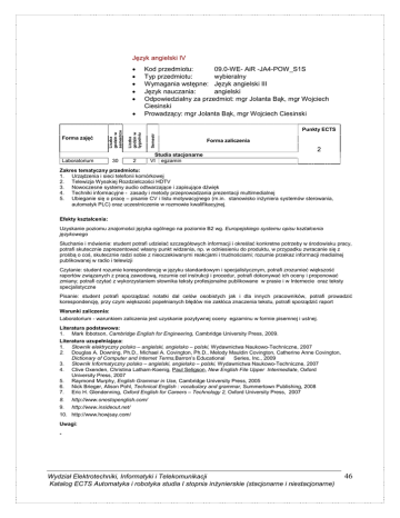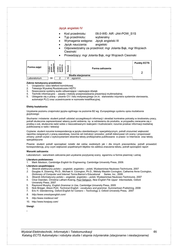 Język angielski IV • • • • • Laboratorium 30 2 Semestr Punkty ECTS Liczba godzin w tygodniu Forma zajęć Liczba godzin w semestrze • Kod przedmiotu: 09.0-WE- AiR -JA4-POW_S1S Typ przedmiotu: wybieralny Wymagania wstępne: Język angielski III Język nauczania: angielski Odpowiedzialny za przedmiot: mgr Jolanta Bąk, mgr Wojciech Ciesinski Prowadzący: mgr Jolanta Bąk, mgr Wojciech Ciesinski Forma zaliczenia 2 Studia stacjonarne VI egzamin Zakres tematyczny przedmiotu: 1. Urządzenia i sieci telefonii komórkowej 2. Telewizja Wysokiej Rozdzielczości HDTV 3. Nowoczesne systemy audio odtwarzające i zapisujące dźwięk 4. Techniki informacyjne - zasady i metody przeprowadzania prezentacji multimedialnej 5. Ubieganie się o pracę – pisanie CV i listu motywacyjnego (m.in. stanowisko inŜyniera systemów sterowania, automatyk PLC) oraz uczestniczenie w rozmowie kwalifikacyjnej. Efekty kształcenia: Uzyskanie poziomu znajomości języka ogólnego na poziomie B2 wg. Europejskiego systemu opisu kształcenia językowego Słuchanie i mówienie: student potrafi udzielać szczegółowych informacji i określać konkretne potrzeby w środowisku pracy, potrafi skutecznie zaprezentować własny punkt widzenia, np. w odniesieniu do produktu, w przypadku zwracanie się z prośbą o coś, skutecznie radzi sobie z nieoczekiwanymi reakcjami i trudnościami; rozumie przekaz informacji medialnej publikowanej w radio i telewizji Czytanie: student rozumie korespondencję w języku standardowym i specjalistycznym, potrafi zrozumieć większość raportów związanych z pracą zawodową, rozumie cel instrukcji i procedur, potrafi dokonywać ich oceny i proponować zmiany; potrafi czytać z wykorzystaniem słownika teksty profesjonalne publikowane w prasie i w Internecie oraz teksty specjalistyczne Pisanie: student potrafi sporządzać notatki dal celów osobistych jak i dla innych pracowników, potrafi prowadzić korespondencję, przy czym większość popełnianych błędów nie zakłóca znaczenia tekstu, potrafi sporządzić raport Warunki zaliczenia: Laboratorium - warunkiem zaliczenia jest uzyskanie pozytywnej oceny egzaminu w formie pisemnej i ustnej. Literatura podstawowa: 1. Mark Ibbotson, Cambridge English for Engineering, Cambridge University Press, 2009. Literatura uzupełniająca: 1. Słownik elektryczny polsko – angielski, angielsko – polski, Wydawnictwa Naukowo-Techniczne, 2007 2. Douglas A. Downing, Ph.D., Michael A. Covington, Ph.D., Melody Mauldin Covington, Catherine Anne Covington, Dictionary of Computer and Internet Terms,Barron’s Educational Series, Inc., 2009 3. Słownik Informatyczny polsko – angielski, angielsko – polski, Wydawnictwa Naukowo-Techniczne, 2007 4. Clive Oxenden, Christina Latham-Koenig, Paul Seligson, New English File Upper Intermediate, Oxford University Press, 2007 5. Raymond Murphy, English Grammar in Use, Cambridge University Press, 2005 6. Nick Brieger, Alison Pohl, Technical English : vocabulary and grammar, Summertown Publishing, 2008 7. Eric H. Glendenning, Oxford English for Careers – Technology 2, Oxford University Press, 2007 8. http://www.onestopenglish.com/ 9. http://www.insideout.net/ 10. http://www.howjsay.com/ Uwagi: - Wydział Elektrotechniki, Informatyki i Telekomunikacji Katalog ECTS Automatyka i robotyka studia I stopnia inŜynierskie (stacjonarne i niestacjonarne) 46