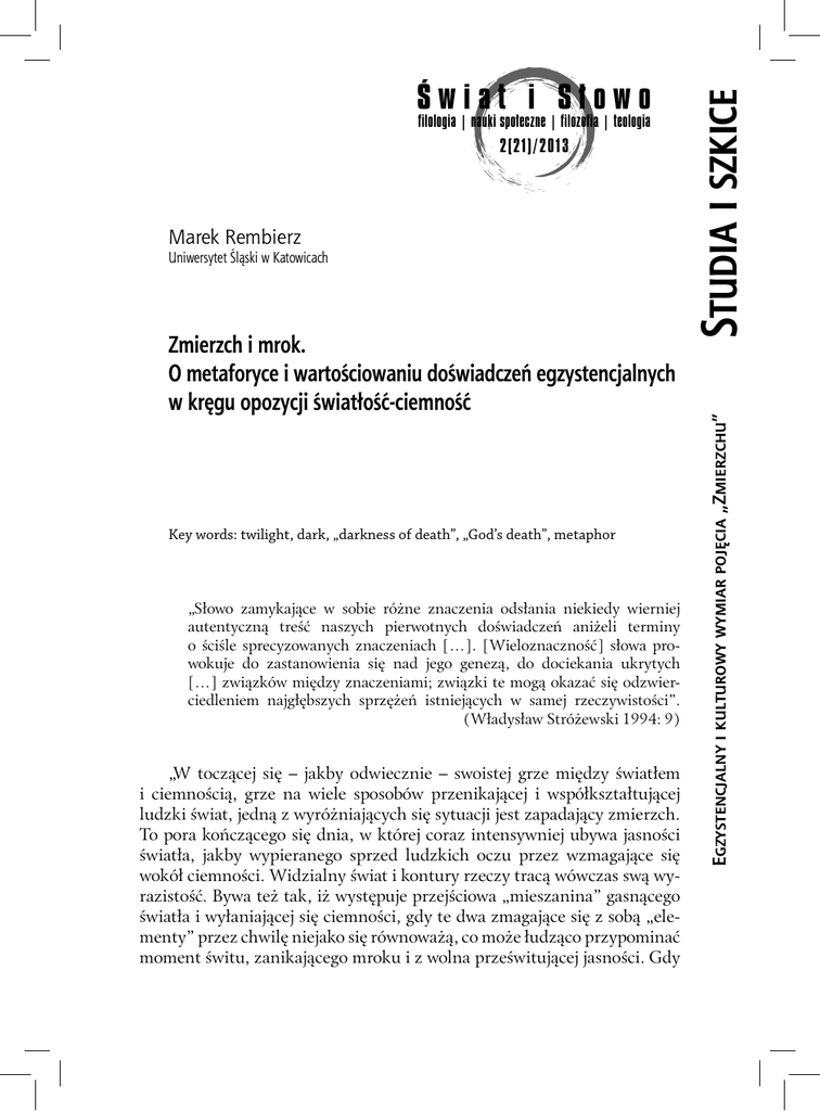 2(21)/2013 Marek Rembierz Uniwersytet Śląski w Katowicach Zmierzch i mrok. O metaforyce i wartościowaniu doświadczeń egzystencjalnych w kręgu opozycji światłość-ciemność Key words: twilight, dark, „darkness of death”, „God’s death”, metaphor „Słowo zamykające w sobie różne znaczenia odsłania niekiedy wierniej autentyczną treść naszych pierwotnych doświadczeń aniżeli terminy o ściśle sprecyzowanych znaczeniach […]. [Wieloznaczność] słowa prowokuje do zastanowienia się nad jego genezą, do dociekania ukrytych […] związków między znaczeniami; związki te mogą okazać się odzwierciedleniem najgłębszych sprzężeń istniejących w samej rzeczywistości”. (Władysław Stróżewski 1994: 9) „W toczącej się – jakby odwiecznie – swoistej grze między światłem i ciemnością, grze na wiele sposobów przenikającej i współkształtującej ludzki świat, jedną z wyróżniających się sytuacji jest zapadający zmierzch. To pora kończącego się dnia, w której coraz intensywniej ubywa jasności światła, jakby wypieranego sprzed ludzkich oczu przez wzmagające się wokół ciemności. Widzialny świat i kontury rzeczy tracą wówczas swą wyrazistość. Bywa też tak, iż występuje przejściowa „mieszanina” gasnącego światła i wyłaniającej się ciemności, gdy te dwa zmagające się z sobą „elementy” przez chwilę niejako się równoważą, co może łudząco przypominać moment świtu, zanikającego mroku i z wolna prześwitującej jasności. Gdy STUDIA I SZKICE filologia | nauki społeczne | filozofia | teologia EGZYSTENCJALNY I KULTUROWY WYMIAR POJĘCIA „ZMIERZCHU” Świat i Słowo 14 Marek Rembierz jednak zmierzch się intensyfikuje i zapada zmrok, to następuje dość jednoznaczne przejście od stanu jasności właściwej dla dnia do stanu mroku właściwego nocy, przejście od widzialnego do niewidzialnego. Świat – za dnia – był dany i znany w świetle, a pogrąża się w mroku, który czyni go nierozpoznawalnym. Dokonuje się całościowa przemiana oblicza świata, co więcej – co sugerują niektóre archaiczne podania i rytuały – zachodzi jakby osobliwa „alchemiczna przemiana” świata w ciemności i metamorfoza ludzkiego sposobu bycia w mrocznym świecie. Zapadający zmierzch niesie z sobą nie tylko praktyczne, ale też duchowe – w wymiarze religijnym, moralnym, artystycznym – wyzwanie dla ludzkich możliwości widzenia świata pozbawionego światła i dalszego orientowania się w nim oraz mierzenia się z tym, co niewidzialne. Zmierzch wyzwala zmagania, aby widzieć to, co stanowi bliższe i dalsze otoczenie mimo panującego zmroku, choć ludzkie oczy są przecież dostosowane przede wszystkim do patrzenia na to, co dane w świetle, a nie – ukryte w mroku. Zmierzch może następować stopniowo, jest więc wówczas szansa, aby się przygotować i w pewnym przynajmniej zakresie przyzwyczaić do „bycia w mroku” i w miarę sprawnego w nim funkcjonowania; choć zmierzch bywa też szybki i krótki, natychmiast pojawia się ciemność, zaskakując tych, których niespodziewanie ogarnęła. Powinno się przy tym pamiętać, iż nadciągający mrok sprzyja różnego typu zagrożeniom, które mogą się w nim maskować i ukrywać. Dlatego po zmierzchu potrzeba jakiegoś podręcznego źródła światła, aby dzięki uzyskanej z niego jasności skutecznie przeciwstawiać się niebezpieczeństwom wyłaniającym się z ciemności. Gdy zapada zmierzch „wielkiego światła” (np. zachodzi i znika blask słońca), to swego znaczenia nabierają inne pomniejsze źródła darzące jasnością i rozświetlające lokalnie mroki, mogą one wówczas manifestować swą dość małą acz bardzo przydatną w tej sytuacji moc, która przed zmierzchem była tłumiona i przesłonięta siłą „potężnego oświeciciela”. Światła zapalane po zmierzchu „wielkiego światła” mają wszakże pewną istotną słabość, nie rozjaśniają one w miarę równomiernie całości, ale selektywnie i fragmentarycznie oświetlają elementy i aspekty świata, podobnie jak reflektory w teatrze swym strumieniem jasności ukazują wybrane przedmioty i sytuacje, resztę – na zasadzie silnego kontrastu – pozostawiając w tym głębszej ciemności. Przekierowanie strumienia światła sprawia, że to, co już nie jest oświetlone, uchodzi z pola widzenia i niknie w mroku, także może przestać być obejmowane pamięcią i ulec zapomnieniu. „Jak można i jak powinno się żyć, gdy zapada zmierzch i nadciąga mrok? Jak można i jak powinno się żyć po zmierzchu, gdy już zapanowała ciemność?” – to pytanie na różne sposoby było podejmowane w dziejach cywilizacji, kultur, religii i sztuki, a także w obszarze nauki i techniki. Zmierzch i mrok… 15 Doświadczając zmierzchu, który w całości „zagarnia sobą” świat widzialny, człowiek może intensywniej doświadczać wzmożonego napięcia i istotnej różnicy między tym, co widzialne (dla jego oczu), a tym, co (pozostaje) niewidzialne1. To, co było dotychczas dane w świetle i dzięki jego jasności było widoczne, to wraz ze zmierzchem staje się coraz bardziej niewidoczne i znika z pola widzenia. Czy jednak wciąż jest „to, to samo”, czy może stało się – co najmniej w jakimś stopniu – czymś innym, gdy wcześniej wyraźne kształty zanikły w mroku i nie ma pewności, jak „to” faktycznie teraz wygląda? Czy wraz z zapadającym zmierzchem – jak przedstawiają to, częstokroć z dużą dozą ekspresji, pradawne podania i utwory artystyczne – dokonuje się daleko idąca zmiana w sposobie istnienia elementów świata i całości świata, który jest zdecydowanie innym światem w świetle, a innym – w mroku i ciemności? Jeśli zmierzch jest już ostateczny, gdyż nie wróci wcześniejsze światło i świat nie będzie takim, jak był, to czy nie należy przyjąć, iż wraz z zapadającym zmierzchem zachodzi anihilacja, uniewa
