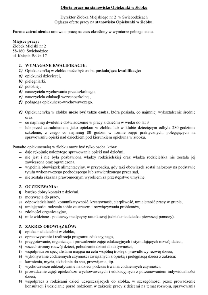 oferty pracy - ŻŁOBEK MIEJSKI Nr 2 w Świebodzicach
