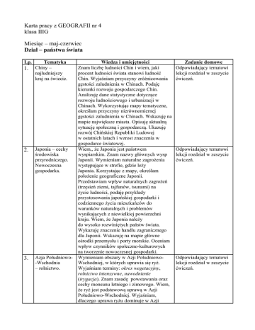 Karta pracy z GEOGRAFII nr 4 klasa IIIG Miesiąc – maj-czerwiec Dział – państwa świata Lp. 1. Tematyka Chiny – najludniejszy kraj na świecie. 2. Japonia – cechy środowiska przyrodniczego. Nowoczesna gospodarka. 3. Azja Południowo-Wschodnia – rolnictwo. Wiedza i umiejętności Znam liczbę ludności Chin i wiem, jaki procent ludności świata stanowi ludność Chin. Wyjaśniam przyczyny zróżnicowania gęstości zaludnienia w Chinach. Podaję kierunki rozwoju gospodarczego Chin. Analizuję dane statystyczne dotyczące rozwoju ludnościowego i urbanizacji w Chinach. Wykorzystując mapy tematyczne, określam przyczyny nierównomiernej gęstości zaludnienia w Chinach. Wskazuję na mapie największe miasta. Opisuję aktualną sytuację społeczną i gospodarczą. Ukazuję rozwój Chińskiej Republiki Ludowej w ostatnich latach i wzrost znaczenia w gospodarce światowej. Wiem,, że Japonia jest państwem wyspiarskim. Znam nazwy głównych wysp Japonii. Wymieniam naturalne zagrożenia występujące w strefie, gdzie leży Japonia. Korzystając z mapy, określam położenie geograficzne Japonii. Przedstawiam wpływ naturalnych zagrożeń (trzęsień ziemi, tajfunów, tsunami) na życie ludności, podaję przykłady przystosowania japońskiej gospodarki i codziennego życia mieszkańców do warunków naturalnych i problemów wynikających z niewielkiej powierzchni kraju. Wiem, że Japonia należy do wysoko rozwiniętych państw świata. Wykazuję znaczenie handlu zagranicznego dla Japonii. Wskazuję na mapie główne ośrodki przemysłu i porty morskie. Oceniam wpływ czynników społeczno-kulturowych na tworzenie nowoczesnej gospodarki. Wymieniam obszary w Azji PołudniowoWschodniej, w których uprawia się ryż. Wyjaśniam terminy: okres wegetacyjny, rolnictwo intensywne, nawodnienie (irygacja). Znam zasadę powstawania oraz cechy monsunu letniego i zimowego. Wiem, że ryż jest podstawową uprawą w Azji Południowo-Wschodniej. Wyjaśniam, dlaczego uprawa ryżu dominuje w Azji Zadanie domowe Odpowiadający tematowi lekcji rozdział w zeszycie ćwiczeń. Odpowiadający tematowi lekcji rozdział w zeszycie ćwiczeń. Odpowiadający tematowi lekcji rozdział w zeszycie ćwiczeń. 4. Indie – kontrasty społeczne i gospodarcze. 5. Formy gospodarowania w strefie Sahelu. 6. Brazylia – eksploatacja lasów Amazonii. Wielkie miasta. Południowo-Wschodniej. Dostrzegam związki między typem rolnictwa a klimatem, opisuję rytm zmian w uprawach na obszarze Azji Południowo-Wschodniej. Znam przyczyny nierównomiernego rozmieszczenia ludności Indii. Wymieniam główne uprawy występujące w Indiach. Przedstawiam rozmieszczenie ludności Indii wiem, że Indie zajmują drugie miejsce pod względem liczby ludności na świecie. Wyjaśniam terminy: eksplozja demograficzna, zielona rewolucja, analfabetyzm. Wymieniam główne religie panujące w Indiach. Podaję przykłady przemian społecznych i gospodarczych zachodzących w Indiach. Wykazuję wpływ klimatu na rozmieszczenia głównych upraw. Objaśniam przyczyny zmian liczby ludności w Indiach. Posługując się różnymi źródłami informacji,wyjaśniam przyczyny rozwoju nowoczesnych technologii w Indiach. Wyjaśniam terminy Sahel – Afryka Subsaharyjska, koczownictwo,pustynnienie, rolnictwo ekstensywne, oaza,. Wymieniam charakterystyczne organizmy żyjące w strefie Sahelu. Wyjaśniam znaczenie wody dla potrzeb gospodarowania w obszarach półsuchych. Podaję przykłady niekorzystnego oddziaływania rolniczego na środowisko w strefie Sahelu. Określam położenie strefy Sahelu w Afryce, przedstawiam charakterystyczne cechy klimatu w strefie Sahelu. Oceniam sposoby gospodarowania w strefie Sahelu oraz programy pomocowe dla państw mających terytoria w strefie Sahelu. Wiem, jakie znaczenie dla środowiska przyrodniczego mają duże obszary leśne. Znam powierzchnię i położenie lasów amazońskich. Określam położenie geograficzne Brazylii. Wskazuję na mapie główne krainy geograficzne, znam główne sposoby wykorzystania lasów amazońskich. Wymieniam nazwy wielkich miast w Brazylii. Wyliczam problemy, jakie występują w wielkich miastach Brazylii. Wyjaśniam pojęcia: zielone płuca Ziemi, megamiasto. Przedstawiam rozbieżność pomiędzy skutkami wylesienia Amazonii a zyskami z jej gospodarczego wykorzystania. Wyjaśniam przyczyny Odpowiadający tematowi lekcji rozdział w zeszycie ćwiczeń. Odpowiadający tematowi lekcji rozdział w zeszycie ćwiczeń. Odpowiadający tematowi lekcji rozdział w zeszycie ćwiczeń. 7. nierównomiernego zaludnienia w Brazylii, przedstawia rozwój wielkich miast w Brazylii. Stany Zjednoczone Znam i rozumiem pojęcia: kraj imigracyjny, Odpowiadający tematowi Ameryki – federacja, technopolia, megalopolis. lekcji rozdział w zeszycie światowa Wymieniam trzy sektory gospodarki ćwiczeń. potęga narodowej i ich znaczenie w krajach wysoko gospodarcza rozwiniętych. Znam kryteria, które kwalifikują Stany Zjednoczone Ameryki do grupy państw bogatej Północy. Wymieniam główne grupy ludności zamieszkujące w Stanach Zjednoczonych Ameryki. Odczytuję treść map tematycznych, charakteryzuję najważniejsze regiony gospodarcze USA. Wykazuję związki między gospodarką poszczególnych regionów Stanów Zjednoczonych a warunkami środowiska przyrodniczego. Oceniam rolę i znaczenie USA w gospodarce światowej. W trakcie realizacji karty pracy wiedza i umiejętności ucznia sprawdzane będą w formie odpowiedzi ustnych i kartkówek. Na zakończenie karty pracy przewidziana jest lekcja powtórzeniowa i sprawdzian obejmujący materiał karty numer 4.