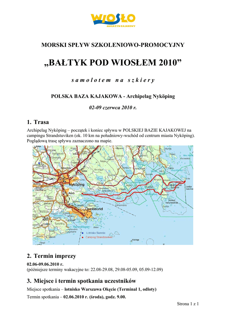 MORSKI SPŁYW SZKOLENIOWO-PROMOCYJNY „BAŁTYK POD WIOSŁEM 2010” samolotem na szkiery POLSKA BAZA KAJAKOWA - Archipelag Nyköping 02-09 czerwca 2010 r. 1. Trasa Archipelag Nyköping – początek i koniec spływu w POLSKIEJ BAZIE KAJAKOWEJ na campingu Strandstuviken (ok. 10 km na południowy-wschód od centrum miasta Nyköping). Poglądową trasę spływu zaznaczono na mapie. 2. Termin imprezy 02.06-09.06.2010 r. (późniejsze terminy wakacyjne to: 22.08-29.08, 29.08-05.09, 05.09-12.09) 3. Miejsce i termin spotkania uczestników Miejsce spotkania – lotnisko Warszawa Okęcie (Terminal 1, odloty) Termin spotkania – 02.06.2010 r. (środa), godz. 9.00. Strona 1 z 1 4. Cel • • • • • Szkolenie z kajakarstwa morskiego ze szczególnym uwzględnieniem aspektów bezpieczeństwa i nawigacji. Promocja i propagowanie kajakarstwa morskiego oraz czynnego wypoczynku. Poznanie uroków szwedzkich szkierów. Integracja środowiska polskich kajakarzy morskich w celu organizacji wspólnych wypraw. Testy sprzętu. 5. Organizator spływu Po stronie szwedzkiej: Grzegorz Rózik Po stronie polskiej: Adam Biedrzycki i Adam Grzegorzewski Redakcja Magazynu Kajakowego WIOSŁO ul. Samsonowicza 2 25-564 Kielce tel. 41-362-78-38 www.szkiery.pl e-mail: [email protected] 6. Warunki uczestnictwa • • • • • Umiejętność pływania kajakiem po wodach nizinnych (nie jest wymagane wcześniejsze pływanie kajakiem po morzu). Umiejętność pływania wpław. Doświadczenie turystyczno-biwakowe. Posiadanie obowiązkowego wyposażenia. Pozytywna weryfikacja, wykupienie biletu lotniczego oraz uiszczenie wpisowego. 7. Koszty uczestnictwa i wykupienie biletów lotniczych 950 zł – wpisowe od osoby (płatne przelewem). Kwota wpisowego obejmuje: wypożyczenie morskiego kajaka jednoosobowego z wiosłem, fartuchem i kamizelką asekuracyjną (7 dni), transport uczestników z lotniska SztokholmSkavsta na camping Strandstuviken (ok. 20 km) i z powrotem, dwa noclegi na campingu Stranstuviken w namiocie z możliwością korzystania z komfortowo wyposażonej kuchni i łazienek, prowadzenie szkoleń z kajakarstwa morskiego, opiekę doświadczonego instruktora w kajakarstwie morskim, przygotowanie dla każdego uczestnika map w skali 1:50 000, skorzystanie z sauny, formalności itp. Ceny wypożyczenia kajaków w Szwecji znacząco odbiegają od cen w Polsce. Dla porównania cena wypożyczenia morskiego kajaka jednoosobowego (bez transportu) w okolicach Nyköping za jeden dzień wynosi 250 SEK, czyli 100 zł (np. w firmie Hälgö Kajakkafé, http://www.paddling.se). Kurs: 1 SEK – ok. 0.4 PLN Wpisowe należy wpłacać na podany rachunek bankowy po potwierdzeniu u organizatora wstępnej weryfikacji uczestnictwa (wówczas należy również wykupić bilet lotniczy we własnym zakresie). Strona 2 z 2 Ze względu na ograniczoną ilość miejsc (10 osób maksimum wraz z kadrą) organizator prowadzi dwie listy – podstawową i rezerwową. Wszystkie osoby z listy podstawowej proszone są o wykupienie biletów lotniczych i wpłatę wpisowego do dnia 30 kwietnia 2010 r. Po tym terminie zostanie odblokowana lista rezerwowa. Dane do przelewu (tylko wpisowe): Magazyn Kajakowy WIOSŁO ul. Samsonowicza 2, Kielce nr rach.: 50 10205558 1111144404300088 tytuł przelewu: SZKIERY, imię, nazwisko Bilety lotnicze Linie lotnicze Wizz Air. Rezerwacja i wykupienie biletów przez Internet. Adres strony: http://www.wizzair.com Na dzień 10.03.2010 r. bilet lotniczy w obie strony kosztował 330 zł. Cena ta może ulec zmianie. Im wcześniej wykupimy bilet tym mamy lepszą ceną. Należy również pamiętać o wykupieniu dodatkowego bagażu rejestrowanego w obie strony (15 kg). Poniżej załączona jest rezerwacja wykupiona dla organizatorów z Polski: Przelot Numer Lotu Wylot z Data wylotu Przylot do Data przylotu W6 425 Warsaw Śr 02 Cze 2010 11:00 Sztokholm - Skavsta Śr 02 Cze 2010 12:35 W6 426 Sztokholm - Skavsta Śr 09 Cze 2010 13:00 Warsaw Śr 09 Cze 2010 09 14:30 Uczestnicy powinni wykupić bilet dokładnie na powyższe przeloty. W razie trudności z rezerwacją prosimy o kontakt. 8. Skrócony program spływu 02 czerwca, środa godz. 9.00 – zbiórka uczestników na lotnisku Warszawa Okęcie (Terminal 1, odloty) godz. 11.00 – odlot samolotu WIZZ AIR (lot W6 425) na lotnisko Sztokholm-Skavsta godz. 12.35 – przylot samolotu na lotnisko Sztokholm-Skavsta Po przylocie transport uczestników na camping Strandstuviken. O godzinie 15.00 rozpoczęcie szkolenia (praktyczne na płytkiej zatoce i teoretyczne w sali konferencyjnej). Nocleg na campingu Strandstuviken w tipi. 03-08 czerwca, czwartek - wtorek Płyniecie w formie pętli na Archipelagu Nyköping z noclegami na wyspach (pełne 6 dni). Podczas płynięcia przewidziano dalsze szkolenia z kajakarstwa morskiego ze szczególnym uwzględnieniem aspektów bezpieczeństwa i nawigacji. W planach jest również dokładniejsza eksploracja Rezerwatu Przyrody Stendorrens (nazwa pochodzi od „stone door”, czyli kamiennych drzwi – przejścia, które umożliwiało statkom dostanie się na spokojne wody przy silnych sztormach). We wtorek wieczorem gorąca sauna na campingu Strandstuviken. 09 czerwca, środa Zakończenie spływu, zdanie sprzętu, transport uczestników na lotnisko Sztokholm-Skavsta. godz. 11.00 – zbiórka uczestników na lotnisku Sztokholm-Skavsta godz. 13.00 – odlot samolotu WIZZ AIR (lot W6 426) na lotnisko Warszawa Okęcie godz. 14.30 – przylot samolotu na lotnisko Warszawa Okęcie Strona 3 z 3 9. • • • • • • • • Wyposażenie obowiązkowe uczestnika: telefon komórkowy z obudową wodoszczelną i aktywnym roamingiem, gwizdek, kompas płaski (umożliwiający jednoczesne posługiwanie się mapą), mapnik wodoszczelny formatu min. A4, sprzęt biwakowy (namiot, śpiwór itp.), żywność na czas trwania spływu, kurtka chroniąca od wiatru i deszczu, okrycie głowy (ochrona przed słońcem). 10. Wyposażenie dodatkowe uczestnika: • • • • • • • 