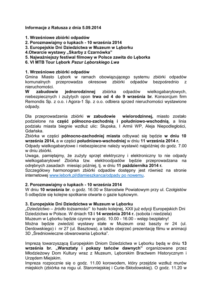 Informacje z Ratusza z dnia 5.09.2014 1. Wrześniowe zbiórki odpadów 2. Porozmawiajmy o łupkach - 10 września 2014 3. Europejskie Dni Dziedzictwa w Muzeum w Lęborku 4.Otwarcie wystawy „Skarby z Czarnówka” 5. Najważniejszy festiwal filmowy w Polsce zawita do Lęborka 6. VI MTB Tour Lębork Pazur Lęborskiego Lwa 1. Wrześniowe zbiórki odpadów Gmina Miasto Lębork w ramach obowiązującego systemu zbiórki odpadów komunalnych przeprowadza okresowe zbiórki odpadów bezpośrednio z nieruchomości. W zabudowie jednorodzinnej zbiórka odpadów wielkogabarytowych, niebezpiecznych i zużytych opon trwa od 4 do 9 września br. Konsorcjum firm Remondis Sp. z o.o. i Agora-1 Sp. z o.o. odbiera sprzed nieruchomości wystawione odpady. Dla przeprowadzenia zbiórki w zabudowie wielorodzinnej, miasto zostało podzielone na część północno-zachodnią i południowo-wschodnią, a linia podziału miasta biegnie wzdłuż ulic: Słupska, I Armii WP, Aleja Niepodległości, Gdańska. Zbiórka w części północno-zachodniej miasta odbywać się będzie w dniu 10 września 2014, a w części południowo-wschodniej w dniu 11 września 2014 r. Odpady wielkogabarytowe i niebezpieczne należy wystawić najpóźniej do godz. 7.00 w dniu zbiórki. Uwaga, pamiętajmy, że zużyty sprzęt elektryczny i elektroniczny to nie odpady wielkogabarytowe! Zbiórka tzw. elektroodpadów będzie przeprowadzana na odrębnych zasadach miesiąc później, tj. w dniu 11 października 2014 r. Szczegółowy harmonogram zbiórki odpadów dostępny jest również na stronie internetowej www.lebork.pl/dlamieszkanca/odpady po nowemu. 2. Porozmawiajmy o łupkach - 10 września 2014 W dniu 10 września br. o godz. 16.00 w Starostwie Powiatowym przy ul. Czołgistów 5 odbędzie się kolejne spotkanie otwarte o gazie łupkowym. 3. Europejskie Dni Dziedzictwa w Muzeum w Lęborku „Dziedzictwo – źródło tożsamości” to hasło kolejnej, XXII już edycji Europejskich Dni Dziedzictwa w Polsce. W dniach 13 i 14 września 2014 r. (sobota i niedziela) Muzeum w Lęborku będzie czynne w godz. 10.00 - 16.00 - wstęp bezpłatny! Można będzie zwiedzić wystawy stałe w Muzeum oraz baszty nr 24 (ul. Derdowskiego) i nr 27 (ul. Basztowa), a także obejrzeć prezentację filmu w animacji 3D „Średniowieczne obwarowania Lęborka”. Imprezą towarzyszącą Europejskim Dniom Dziedzictwa w Lęborku będą w dniu 13 września br. „Warsztaty i pokazy tańców dawnych” organizowane przez Młodzieżowy Dom Kultury wraz z Muzeum, Lęborskim Bractwem Historycznym i Urzędem Miejskim. Impreza rozpocznie się o godz. 11.00 korowodem, który przejdzie wzdłuż murów miejskich (zbiórka na rogu ul. Staromiejskiej i Curie-Skłodowskiej). O godz. 11.20 w Sali przy Sanktuarium św. Jakuba odbywać się będą warsztaty pisania „Ze starego kałamarza” oraz pieczętowanie lakiem. O 11.30 będzie można zwiedzić razem z przewodnikiem Sanktuarium św. Jakuba, a o 12.00 basztę nr 24 (ul. Derdowskiego). Wystąpią także: Zespół Muzyki Dawnej „Incantare”, Zespół Muzyki i Tańca Dawnego „La Danza Antica”, odbędzie się pokaz gry instrumentów średniowiecznych (m.in. na pandorze) oraz warsztaty i pokazy tańców dawnych. 4. Otwarcie wystawy „Skarby z Czarnówka” Muzeum w Lęborku Galeria "Strome Schody" serdecznie zaprasza dnia 12 września o godz. 18.00 na otwarcie wystawy pt. SKARBY z CZARNÓWKA. Muzeum w Lęborku posiada jedną z największych kolekcji cennych i unikatowych przedmiotów pozyskanych w wyniku wieloletnich badań wykopaliskowych prowadzonych na wielokulturowym cmentarzysku w Czarnówku w powiecie lęborskim. Cmentarzysko ludności kultury pomorskiej, oksywskiej i wielbarskiej oraz z okresu wczesnego średniowiecza w Czarnówku, stan. 5 jest w tej chwili największą, całkowicie przebadaną nekropolią z późnej starożytności w Europie Środkowej, mającą kluczowe znaczenie dla archeologii Europy Środkowej i północnej. Od 1973 roku znalezionych zostało ok. 3000 obiektów, z których wydobyto pokaźną liczbę unikatowych, zabytkowych przedmiotów stanowiących przede wszystkim wyposażenie grobów. Muzeum w Lęborku pozyskało środki finansowe z Ministerstwa Kultury i Dziedzictwa Narodowego na opracowanie i publikację materiałów cmentarzyska w Czarnówku. O wyjątkowym charakterze stanowiska stanowią zróżnicowane formy szkieletowego i ciałopalnego obrządku pogrzebowego oraz bogactwo wyposażeń grobowych, m.in. obecność licznych przedmiotów prestiżowych (złota i srebrna biżuteria, także importy rzymskie). 5. Najważniejszy festiwal filmowy – także w Lęborku Repliki 39. Festiwalu Filmowego w Gdyni są imprezą, która już po raz trzeci zagości w kalendarzu wydarzeń filmowych organizowanych w LCK „Fregata”. Lęborska publiczność ma szansę obejrzeć wyselekcjonowane tytuły ubiegające się o Złote Lwy – główną nagrodę gdyńskiego festiwalu. W Lęborku będzie można obejrzeć 5 z 14 filmów startujących w konkursie głównym. W tym roku w ramach pokazów odbędzie się m.in. premiera ogólnopolska filmu „Miasto 44”. (program filmowy w Lęborku w zał.) Seanse festiwalowe w Lęborku będą odbywały się w tym samym czasie, co w Gdyni, czyli od 15 do 20 września. Równolegle z pokazami festiwalowymi we „Fregacie” już po raz czwarty będzie można skorzystać z bezpłatnego przeglądu filmów dla dzieci pod hasłem „Gdynia Dzieciom”. Rezerwacje na festiwalowe filmy: od poniedziałku do piątku w godz. od 10 do 15 pod nr telefonu 59 8622-530. 6. VI MTB Tour Lębork Pazur Lęborskiego Lwa Organizatorami są Centrum Sportu i Rekreacji w Lęborku i Lokalna Organizacja Turystyczna „Ziemia Lęborska”. Patronat nad imprezą objęli Burmistrz Miasta Lęborka i Starosta Powiatu Lęborskiego. VI MTB Tour Lębork Pazur Lęborskiego Lwa odbędzie się 14 września 2014 na terenach leśnych przy Stadionie Miejskim (ul. Kusocińskiego). Wyścig Rowerowy MTB Paz