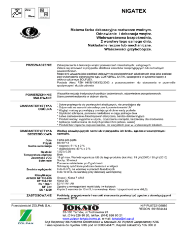 Zew NIGATEX Wew Matowa farba dekoracyjna roztworze wodnym. Odnawianie i dekoracja wnętrz. Wielowarstwowa bezpośrednia, 2 warstwy tego samego dnia. Nakładanie ręczne lub mechaniczne. Właściwości grzybobójcze. PRZEZNACZENIE Zabezpieczenie i dekoracja wnętrz pomieszczeń mieszkalnych i usługowych. Zaleca się stosować w przypadku działania warunków niesprzyjających lub na trudnych powierzchniach. Może być używana jako podkład izolacyjny na powierzchniach alkalicznych oraz jako podkład pod wykończenie dekoracyjne typu COFABRILL SATIN, szczególnie w systemie tapety z włókna szklanego ZOLFLEX. Posiada Atest PZH HK/B/1393/22/2003 z przeznaczeniem do stosowania w przemyśle spożywczym i służbie zdrowia POWIERZCHNNIE MALOWANE Wszystkie rodzaje tradycyjnych podłoży budowlanych, odpowiednio przygotowanych. Stare powłoki malarskie w dobrym stanie. CHARAKTERYSTYKA OGÓLNA * Dobre przyleganie do powierzchni alkalicznych, nie zmydlająca się * Odporność na warunki atmosferyczne i promieniowanie UV * Wygląd matowy pozwalający zmniejszyć drobne wady podłoża * Szybkość schnięcia, ponowne nakładanie w ciągu jednego dnia * Łatwe zastosowanie /tiksotropowa/ elastyczna, bardzo dobrze kryjąca * Produkt wodny: wygodna w użyciu, czyszczeniu narzędzi, bezpieczny dla środowiska * Aplikacja dostosowana do dużych powierzchni (airless, wałek) * Produkt bez zapachu rozpuszczalnika, do wszystkich prac w użytkowanych lokalach. CHARAKTERYSTYKA SZCZEGÓŁOWA Według obowiązujących norm lub w przypadku ich braku, zgodna z wewnętrznymi normami. Opis Połysk Sucha substancja Gęstość Temperatura zapłonu Zawartość VOC Schnięcie Średnia wydajność Klasyfikacja: AFNOR NF T36-005 XP T34-722 EN 1062-1 NF Env EN 13300 ZASTOSOWANIE Przedstawiciel ZOLPAN S.A.: Farba pół-gęsta BS 60°<3 * wagowo: 61 % ± 2 % * objętościowo: 40 % ± 2 % 1,52 ± 0.05 Brak 15 g/l max. Wartość ogranicza UE dla tego produktu (kat A/a): 75 g/l (2007) / 30 g/l (2010) Suchy: 30 minut Ponowne nakładanie: po 2 godzinach Schnięcie opóźnione podczas deszczu i w wilgoci 2 6 do 8 m /L na warstwę w pracach fasadowych 2 8 do 10 m /L na warstwę przy dekoracji wewnętrznej Grupa I, Klasa 7 a2b2 Klasa D2 E3 V1 W1 A0 Zgodny z wymaganiami marki biały i w kolorach 2 Krycie 2 warstwy do 10 m /L/ na warstwę: klasa 1 (raport kontrastu ≥99,5) Podkłady, przygotowanie i warunki stosowania powinny być zgodne z obowiązującymi normami / DTU NIP PL8722108886 REGON 691564444 33-100 Tarnów, ul.Tuchowska 25 tel. (014) 626 80 20, tel/fax. (014) 626 80 21 www.zolpan-tokato.home.pl, e-mail: [email protected] Sąd Rejonowy dla Krakowa Śródmieścia w Krakowie XII Wydział Gospodarczy KRS Firma wpisana do rejestru KRS pod nr 0000046471, Kapitał zakładowy 165 000 zł PRZYGOTOWANIE POWIERZCHNI STOSOWANIE PRODUKTU Liczba warstw Narzędzia Rozcieńczenie Mycie narzędzi ZALECENIA KOLORY OPAKOWANIA PRZECHOWYWANIE BEZPIECZEŃSTWO I HIGIENA PRACY Powierzchnie muszą być: suche, w dobrym stanie, spójne i czyste. * Mogą one wymagać, w zależności od przypadku, szczotkowania, oszlifowania, skrobania, mycia HP, ługowania, ... w celu uniknięcia jakichkolwiek śladów zabrudzeń lub złuszczających się, kruchych, sproszkowanych, świecących części mogących zakłócić przyczepność. * Usunięcie mikro-organizmów: FONGIMOUSSE PLUS * Wygładzanie, szpachlowanie, podkład: ARMATERM COLLE lub ARMATERM POUDRE (zewn.) lub CILD (wewn.). POUDRE (wewn.), w razie konieczności * MAOPRIMER lub MAOLINE – gipsy i pochodne * Części metalowe (odtłuszczone, odrdzewione) – bezpośrednia aplikacja wewnątrz, jeśli nie odpowiedni podkład. 2 skrzyżowane regularnie warstwy. Wałek niekapek lub wałek teksturalny 18mm, pędzel, airless (dysza 19 do 21‰) Do 5% wody w pierwszej warstwie na powierzchnie porowate lub do zastosowania mechanicznego WODA, natychmiast po użyciu. Warunki stosowania: * przy temperaturze otoczenia i powierzchni malowanej powyżej 5°C (z zachowaniem środków ostrożności przy T>35°C); * przy suchej pogodzie i przy zabezpieczeniu przed silnym wiatrem i bezpośrednim promieniowaniem słonecznym; * wilgotność względna poniżej 80%. System Zolpachrom 2 (biały, baza P i M). 4 L, 16 L 24 miesiące w oryginalnym, nie otwartym opakowaniu. Chronić przed mrozem i temperaturami powyżej 35°C. Zawiesina wodna. Nie wrzucać resztek do ścieku. Sprawdzić Kartę Parametrów Bezpieczeństwa. Karta Techniczna nr 2304 Data wydania: czerwiec 1994 Data zmian: marzec 2011 Producent: ZOLPAN S.A. Francja Uwaga: Unieważnia i zastępuje wcześniejsze wydania. Do naszych klientów należy sprawdzenie, przed użyciem, czy chodzi o ostatnie wydanie ulotki. Informacje zawarte w tej ulotce mają tylko charakter orientacyjny i nie mogą zastąpić instrukcji postępowania dostosowanego do natury oraz do stanu konkretnego podłoża. Przedstawiciel ZOLPAN S.A.: NIP PL8722108886 REGON 691564444 33-100 Tarnów, ul.Tuchowska 25 tel. (014) 626 80 20, tel/fax. (014) 626 80 21 www.zolpan-tokato.home.pl, e-mail: [email protected] Sąd Rejonowy dla Krakowa Śródmieścia w Krakowie XII Wydział Gospodarczy KRS Firma wpisana do rejestru KRS pod nr 0000046471, Kapitał zakładowy 165 000 zł
