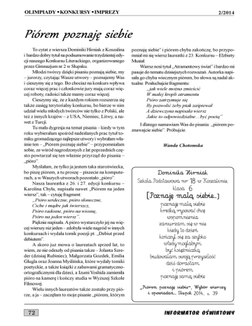 OLIMPIADY § KONKURSY § IMPREZY 2/2014 Piórem poznajê siebie To cytat z wiersza Dominiki Hirniak z Koszalina i bardzo dobry tytu³ na podsumowanie trzydziestej edycji naszego Konkursu Literackiego, organizowanego przez Gimnazjum nr 2 w S³upsku. M³odzi twórcy dziêki pisaniu poznaj¹ siebie, my jurorzy, czytaj¹c Wasze utwory poznajemy Was i cieszymy siê z tego. Bo chocia¿ na konkurs wp³ywa coraz wiêcej prac i cz³onkowie jury maj¹ coraz wiêcej roboty, radoci tak¿e mamy coraz wiêcej. Cieszymy siê, ¿e z ka¿dym rokiem rozszerza siê tak¿e zasiêg terytorialny konkursu, bo bierze w nim udzia³ wielu m³odych twórców nie tylko z Polski, ale te¿ z innych krajów z USA, Niemiec, Litwy, a nawet z Turcji. Tu ma³a dygresja na temat pisania kiedy w tym roku wybiera³am sporód nades³anych prac tytu³ tomiku gromadz¹cego najlepsze utwory i wybra³am w³anie ten Piórem poznajê siebie przypomnia³am sobie, ze wród nagrodzonych z lat poprzednich czêsto powtarza³ siê ten w³anie przyrz¹d do pisania pióro. Myla³am, ¿e tylko ja jestem taka starowiecka, bo piszê piórem, a tu proszê piszecie na komputerach, a w Waszych utworach pozosta³o pióro. Nasza laureatka z 26. i 27. edycji konkursu Karolina Chy³a, napisa³a nawet Piórem na jeden wiersz, tak cytujê fragment: Pióro serdeczne, pióro s³oneczne, Ciche i m¹dre jak wierszcz, Pióro radosne, pióro na wiosnê, Pióro na jeden wiersz. Piêknie napisa³a. A pióro wystarczy³o jej na wiêcej wierszy ni¿ jeden zdoby³a wiele nagród w innych konkursach i wyda³a tomik poezji pt. Debiut przed debiutem. A skoro ju¿ mowa o laureatach sprzed lat, to wiem, ¿e nie odesz³y od pisania tak¿e Jolanta Szreder (dzisiaj Rubiniec), Ma³gorzata Gozdek, Emilia Glugla oraz Joanna Myliñska, które wyda³y tomiki poetyckie, a tak¿e ksi¹¿ki z zabawami gramatycznoortograficznymi dla dzieci, a Izumi Yoshida zamieni³a pióro na kamerê i koñczy studia w Wy¿szej Szkole Filmowej. Wielu innych laureatów tak¿e zosta³o przy piórze, a ja zaczê³am to moje pisanie piórem, którym 72 poznajê siebie i piórem chyba zakoñczê, bo przypomnia³ mi siê wiersz laureatki z 23. Konkursu El¿biety Musia³. Wiersz nosi tytu³ Atramentowy wiat i bardzo mi pasuje do tematu dzisiejszych rozwa¿añ. Autorka napisa³a go chyba wiecznym piórem, bo s³owa s¹ nadal aktualne. Pos³uchajcie fragmentu: jak wiele mo¿na zmieciæ W ma³ej kropli atramentu Pióro zatrzymuje siê By pozwoliæ ¿eby ptak zapiewa³ A dziewczyna napisa³a wiersz Jakie to odpowiedzialne byæ poet¹ I dlatego namawiam Was do pisania: piórem poznawajcie siebie. Próbujcie. Wanda Chotomska Dominika Hirniak Szko³a Podstawowa nr 18 w Koszalinie, klasa 6 [Poznajê ma³¹ siebie.. } poznajê ma³¹ siebie kredk¹ rysowaæ chcê wspomnienia zanurzam siê w nie kiedy to dzieñ koñczy³ siê za szybko wtedy mog³abym byæ ksiê¿niczk¹ budowa³am swoj¹ przysz³oæ dzi dorastam i piórem poznajê sam¹ siebie Piórem poznajê siebie . Wybór wierszy i opowiadañ..., S³upsk 2014, s. 39 INFORMATOR OSWIATOWY