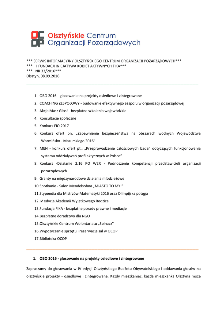 *** SERWIS INFORMACYJNY OLSZTYŃSKIEGO CENTRUM ORGANIZACJI POZARZĄDOWYCH*** *** I FUNDACJI INICJATYWA KOBIET AKTYWNYCH FIKA*** *** NR 32/2016*** Olsztyn, 08.09.2016 __________________________________________________________ 1. OBO 2016 - głosowanie na projekty osiedlowe i zintegrowane 2. COACHING ZESPOŁOWY - budowanie efektywnego zespołu w organizacji pozarządowej 3. Akcja Masz Głos! - bezpłatne szkolenia wojewódzkie 4. Konsultacje społeczne 5. Konkurs FIO 2017 6. Konkurs ofert pn. „Zapewnienie bezpieczeństwa na obszarach wodnych Województwa Warmińsko - Mazurskiego 2016” 7. MEN - konkurs ofert pt.: „Przeprowadzenie całościowych badań dotyczących funkcjonowania systemu oddziaływań profilaktycznych w Polsce” 8. Konkurs -Działanie 2.16 PO WER - Podnoszenie kompetencji przedstawicieli organizacji pozarządowych 9. Granty na międzynarodowe działania młodzieżowe 10.Spotkanie - Salon Mendelsohna „MIASTO TO MY!” 11.Stypendia dla Mistrzów Matematyki 2016 oraz Olimpijska potęga 12.IV edycja Akademii Wyjątkowego Rodzica 13.Fundacja FIKA - bezpłatne porady prawne i mediacje 14.Bezpłatne doradztwo dla NGO 15.Olsztyńskie Centrum Wolontariatu „Spinacz” 16.Wypożyczanie sprzętu i rezerwacja sal w OCOP 17.Biblioteka OCOP __________________________________________________________ 1. OBO 2016 - głosowanie na projekty osiedlowe i zintegrowane Zapraszamy do głosowania w IV edycji Olsztyńskiego Budżetu Obywatelskiego i oddawania głosów na olsztyńskie projekty - osiedlowe i zintegrowane. Każdy mieszkaniec, każda mieszkanka Olsztyna może wskazać, który ze zgłoszonych projektów jest najważniejszy. Wybrane projekty będą realizowane w 2017 roku. Głosujemy od 8 do 18 września 2016 r. Wyniki: 30 września 2016 r. Zobacz więcej __________________________________________________________ 2. COACHING ZESPOŁOWY - budowanie efektywnego zespołu w organizacji pozarządowej Jeżeli Wasza Organizacja potrzebuje inspiracji, zmiany perspektywy, dookreślenia celów (wizji i misji), motywacji, zwiększenia efektywności, wsparcia w zakresie diagnozy trudności i ich źródeł. Zapraszamy! Zobacz więcej __________________________________________________________ 3. Akcja Masz Głos! - bezpłatne szkolenia wojewódzkie Zapraszamy na szkolenia wojewódzkie wszystkie osoby, które chcą się przyłączyć do akcji Masz Głos. Już we wrześniu będzie można wymienić się doświadczeniami i poznać narzędzia przydatne w działaniach obywatelskich oraz dowiedzieć się, dlaczego warto skorzystać ze wsparcia akcji Masz Głos! W naszym województwie spotkanie odbędzie się 21 września (środa), godz. 9.00 - 17.00 w Olsztyńskim Centrum Organizacji Pozarządowych, ul. Tarasa Szewczenki 1. Zapraszamy! Zobacz więcej _________________________________________________________ 4. Konsultacje społeczne Zarząd Województwa Warmińsko-Mazurskiego ogłasza konsultacje projektu uchwały Sejmiku Województwa Warmińsko-Mazurskiego zmieniającej uchwałę Nr III/73/14 Sejmiku Województwa Warmińsko-Mazurskiego z dnia 30 grudnia 2014 r. w sprawie wyznaczenia aglomeracji Olsztyn oraz likwidacji dotychczasowej aglomeracji Olsztyn. Zobacz więcej __________________________________________________________ 5. Konkurs FIO 2017 Minister Rodziny, Pracy i Polityki Społecznej zaprasza do udziału w otwartym konkursie ofert na realizację zadań publicznych dofinansowanych w 2017 r. ze środków krajowego Programu Fundusz Inicjatyw Obywatelskich (P FIO). Od 6 września 2016 r. do 28 września 2016 r. można składać oferty w Priorytecie 1(Małe Inicjatywy) i 2 (Aktywne społeczeństwo) oraz w Komponencie Działań Systemowych. Zobacz więcej __________________________________________________________ 6. Konkurs ofert pn. „Zapewnienie bezpieczeństwa na obszarach wodnych Województwa Warmińsko - Mazurskiego 2016” Wojewoda Warmińsko-Mazurski ogłosił otwarty konkurs ofert nr ZK-I.68.3.16.2016 dla organizacji pozarządowych na realizację zadania publicznego w zakresie ratownictwa i ochrony ludności pn. „Zapewnienie bezpieczeństwa na obszarach wodnych województwa warmińsko-mazurskiego 2016”. Oferty należy składać do 26 września 2016 r. Zobacz więcej __________________________________________________________ 7. MEN - konkurs ofert pt.: „Przeprowadzenie całościowych badań dotyczących funkcjonowania systemu oddziaływań profilaktycznych w Polsce” Minister Edukacji Narodowej ogłosiła konkurs ofert na realizację zadania publicznego pt.: „Przeprowadzenie całościowych badań dotyczących funkcjonowania systemu oddziaływań profilaktycznych w Polsce”. Termin składania ofert: 20 września 2016 r. Zobacz więcej __________________________________________________________ 8. Konkurs -Działanie 2.16 PO WER - Podnoszenie kompetencji przedstawicieli organizacji pozarządowych Szef Kancelarii Prezesa Rady Ministrów działając, jako Instytucja Pośrednicząca dla Działania 2.16 PO WER ogłosił konkurs nr POWR.02.16.00–IP.06–00–006/16 pn. Podnoszenie kompetencji przedstawicieli organizacji pozarządowych oraz partnerów społecznych w zakresie niezbędnym do udziału w procesie stanowienia prawa. Wnioski o dofinansowanie przyjmowane są w okresie od dnia 1 września 2016 r. do dnia 30 listopada 2016 r. Zobacz więcej __________________________________________________________ 9. Granty na międzynarodowe działania młodzieżowe Europejska Fundacja Młodzieży wspiera międzynarodowe działania realizowane przez krajowe lub międzynarodowe organizacje młodzieżowe. Celem programu jest dofinansowanie działań służących promowaniu idei pokoju, zrozumienia i współpracy w duchu poszanowania praw człowieka, demokracji, tolerancji i solidarności. Terminy przesyłania wniosków: 1 października 2016 r. Zobacz więcej __________________________________________________________ 10. Spotkanie - Salon Mendelsohna „MIASTO TO MY!” Fundacja BORUSSIA i Stowar